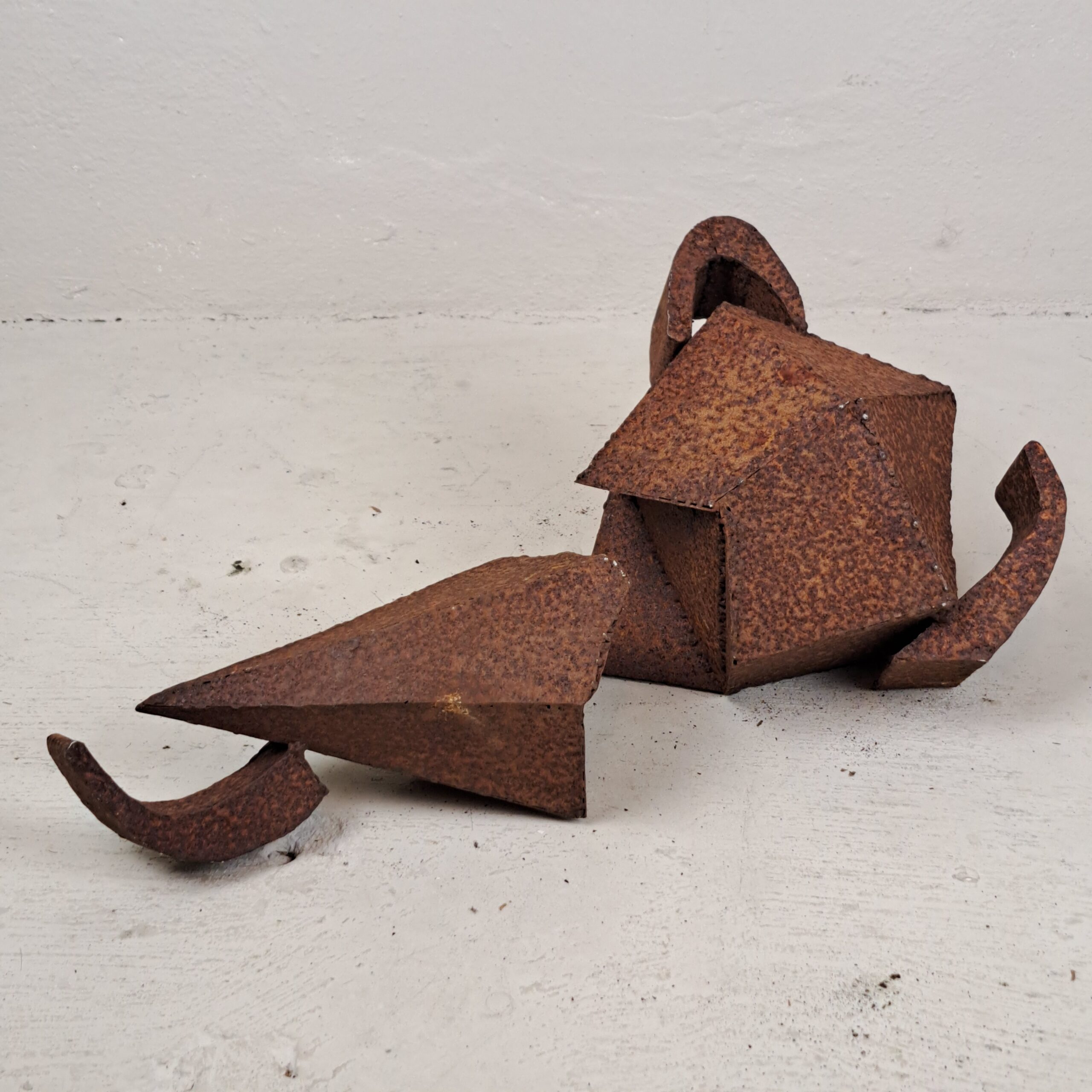 Gjalt Blaauw (born 15 January 1945 in the Frisian village Grou) is a Dutch sculptor. Blaauw trained at the Minerva Academy in the city of Groningen, where he was taught by Karl Pelgrom, among others. After his education, Gjalt Blaauw joined the Institute for Creative Work (ICW) in Finsterwolde. The ICW made work as a group, who made what was not important. The group existed for two years. Blaauw then focused entirely on stone carving. His first work, ‘Mannetje’ (1972), was placed in the Noorderplantsoen in Groningen in 1975. After this sculpture, Blaauw moved away from figurative work and started working more associatively. He stopped naming his works because in his opinion people should have their own freedom in this. At the end of the eighties, Blaauw also started working with iron. Works by Blaauw can be found in the Netherlands in Assen, Groningen, Nijmegen, Voorburg and Zwijndrecht, and elsewhere in Belgium and France. This abstract sculpture in sheets of iron is made in two parts. In very good condition, with a characteristic patina, 50x23x32