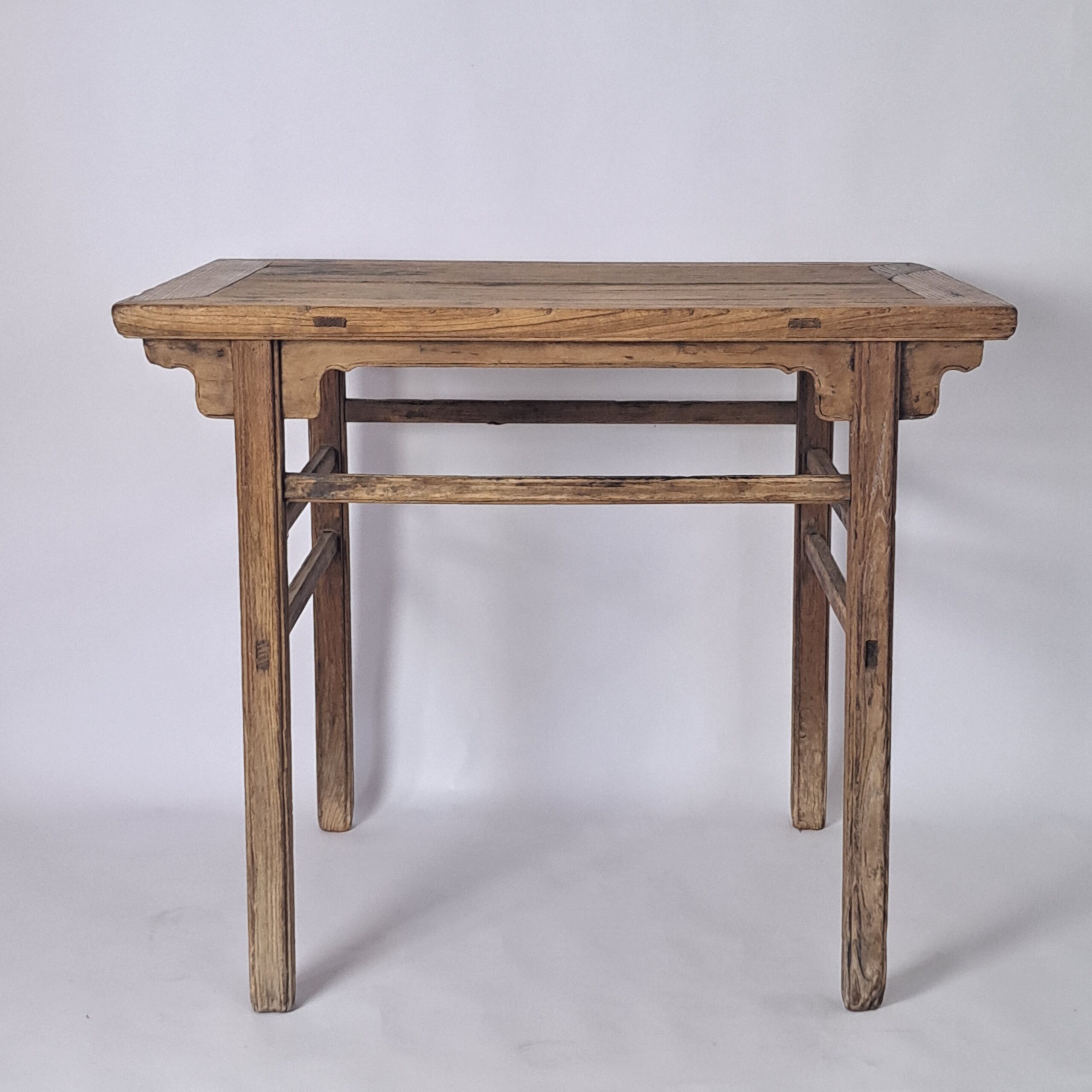 Antique Chinese wine tables from Shanxi province, typically crafted from elmwood, are characterized by their rustic, elegant design, used traditionally for serving rice wine or tea. In good condition, with a nice wabisabi vibe and beatiful patina, h. 87, top 103×70.