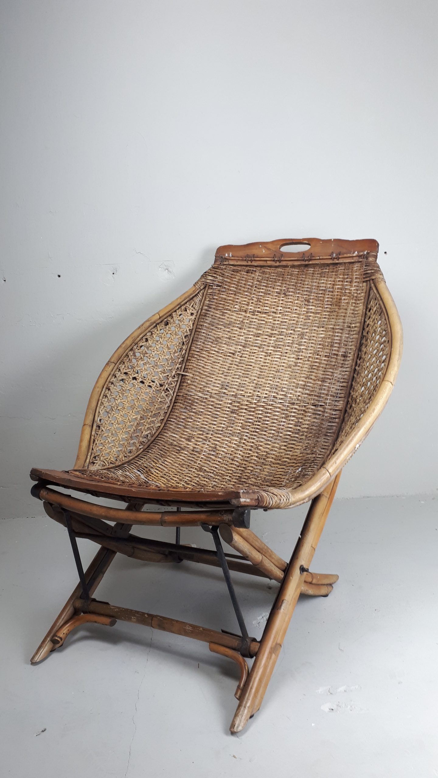 Curious and very decorative voluminous lounge chair from the early 20th century with an iron foldable frame and a rattan and webbing removable seat/back, designer and producer unknown, probably Dutch Asian colonies, needs some work, but overall in good condition conform its age, heigth 111, width 93.