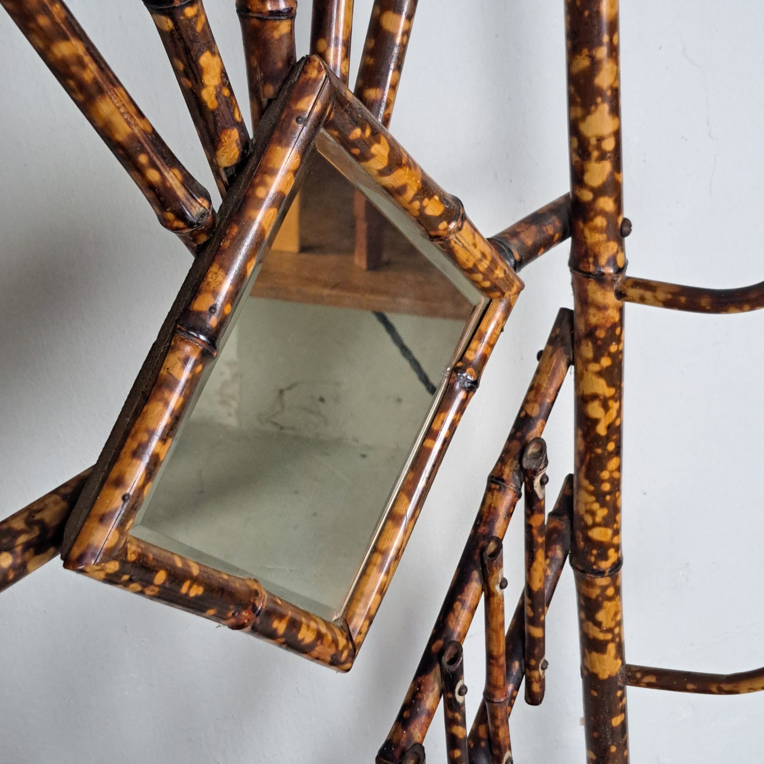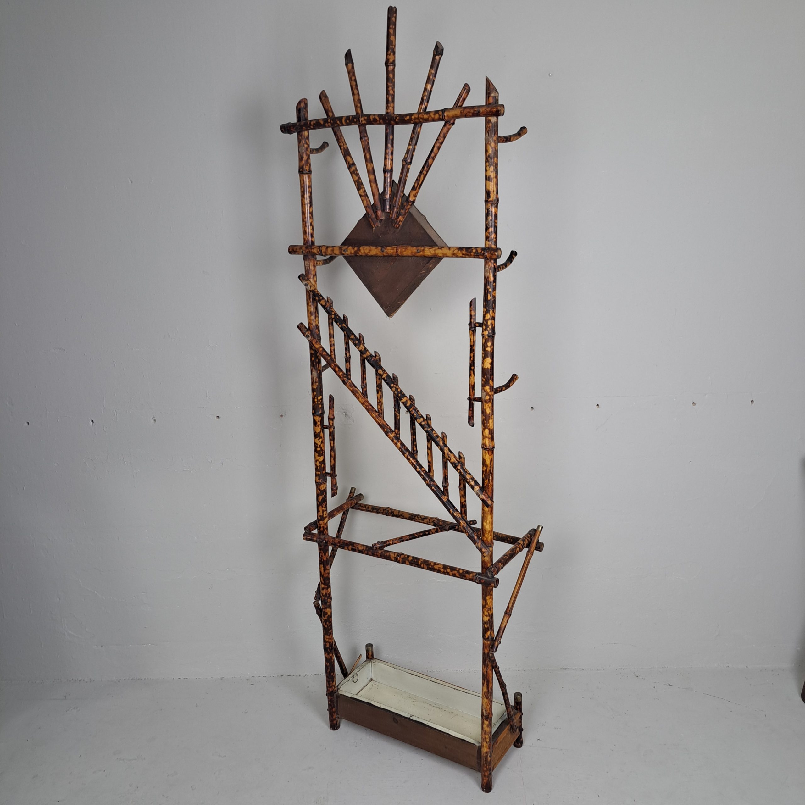 Rare antique coatrack and umbrella stand in bamboo with a white laquered metal tray and a glass mirror, produced by the Dutch factory of Beausar in Schiedam c. 1900, beautiful example of oriental influences in the late 19th century, in good condition, h. 200, 65×27