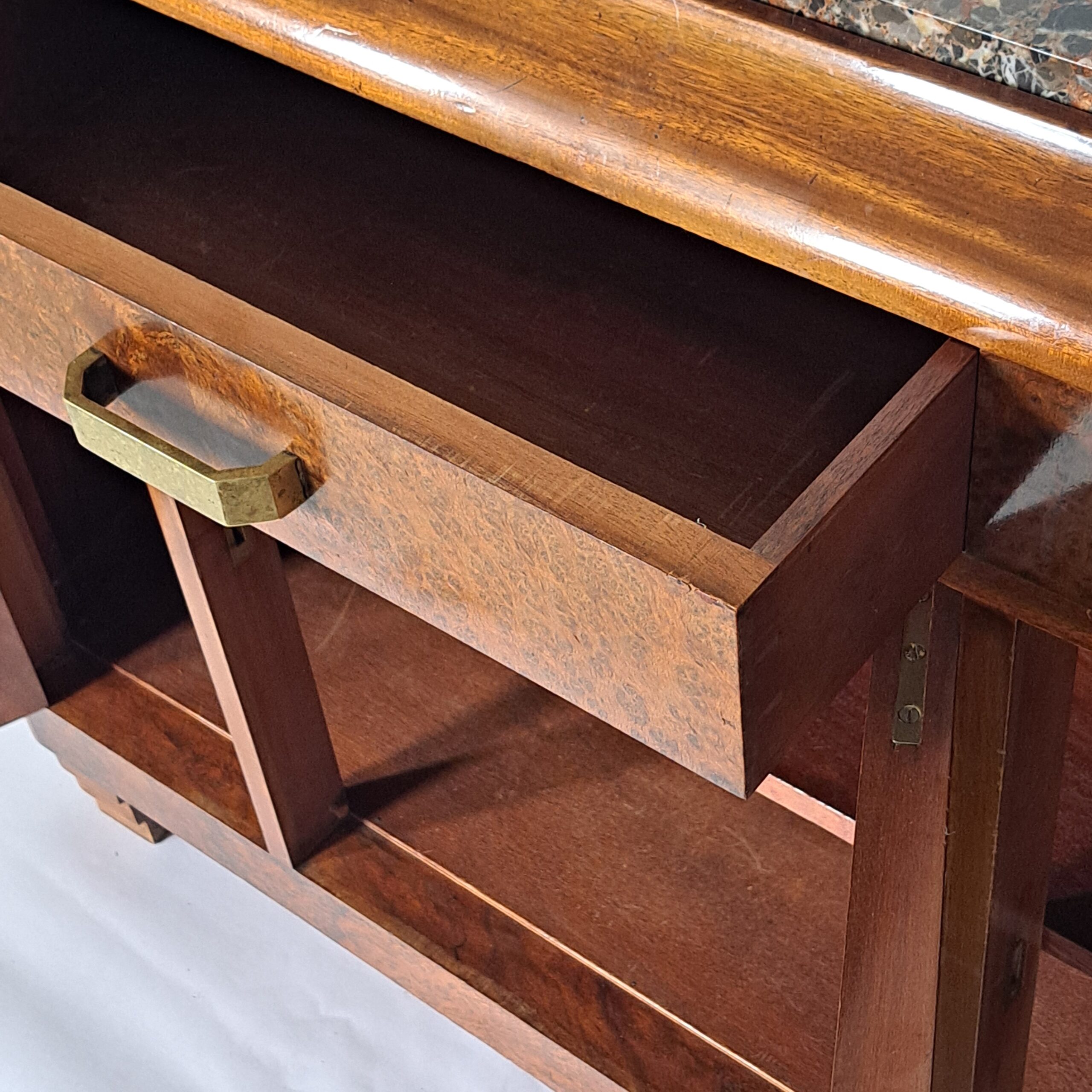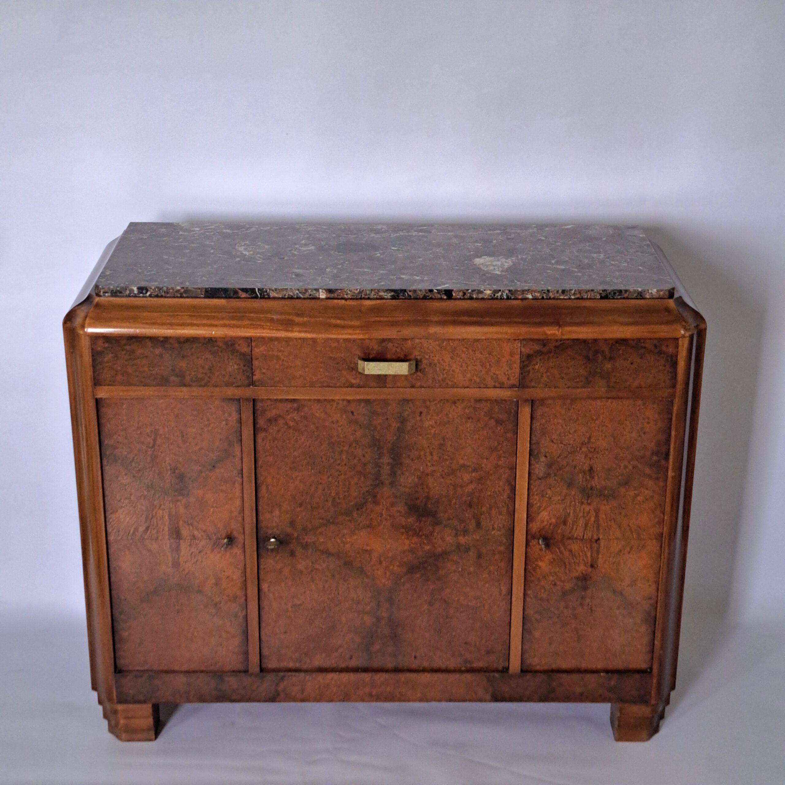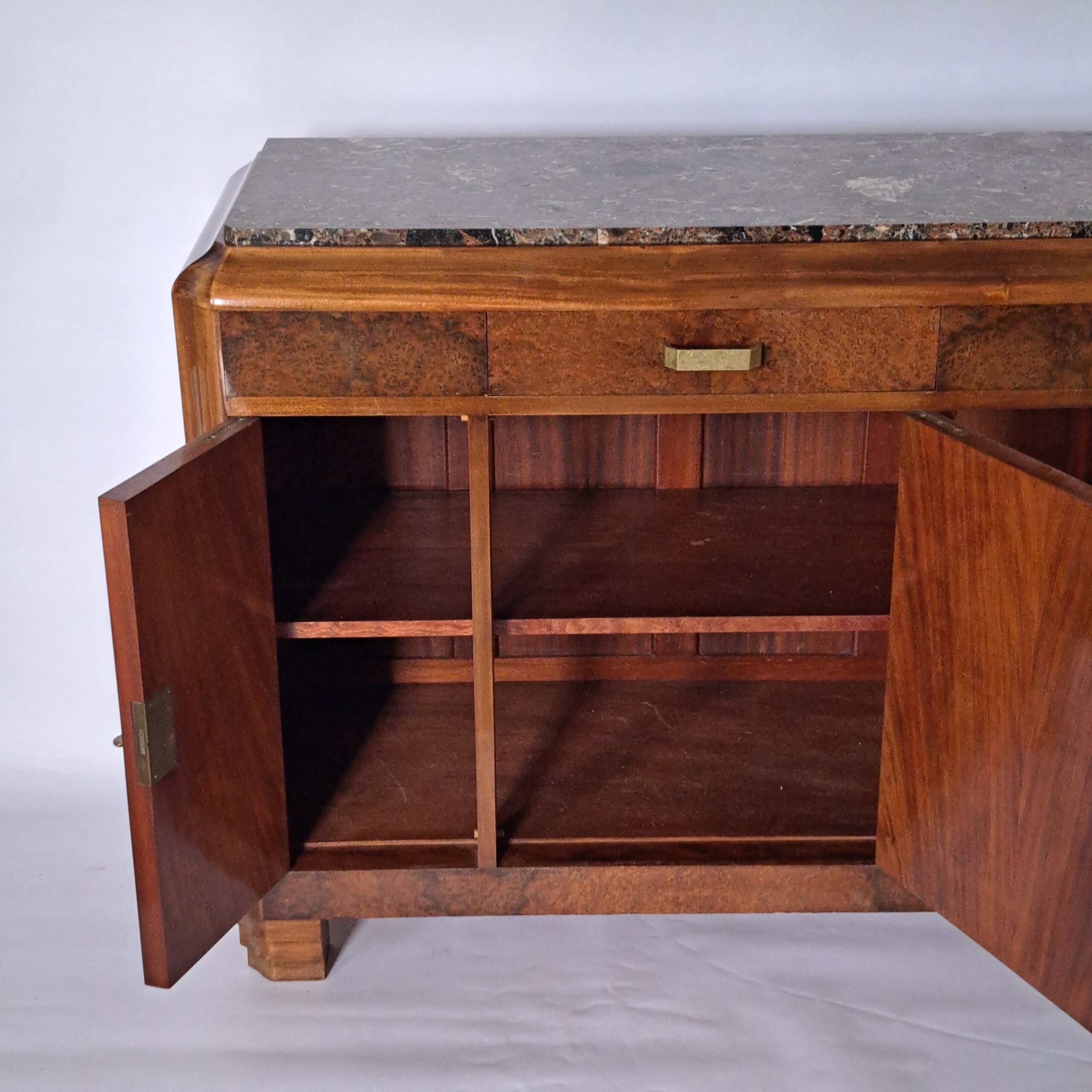 Exceptional sideboard in mirrored wallnut-veneer, datewise late 1920s when Amsterdamse School design gave way to Art Deco design. This sideboard has some lovely details, like the curving corners and the carved legs. The sideboard has one drawer and three compartments with a shelve. The three doors have their original art deco keys. With a beautiful green-grey marble top. In good condition; on one of the side panels the veneer is a little bit lustreless on some spots. H. 98, w. 120, d. 50