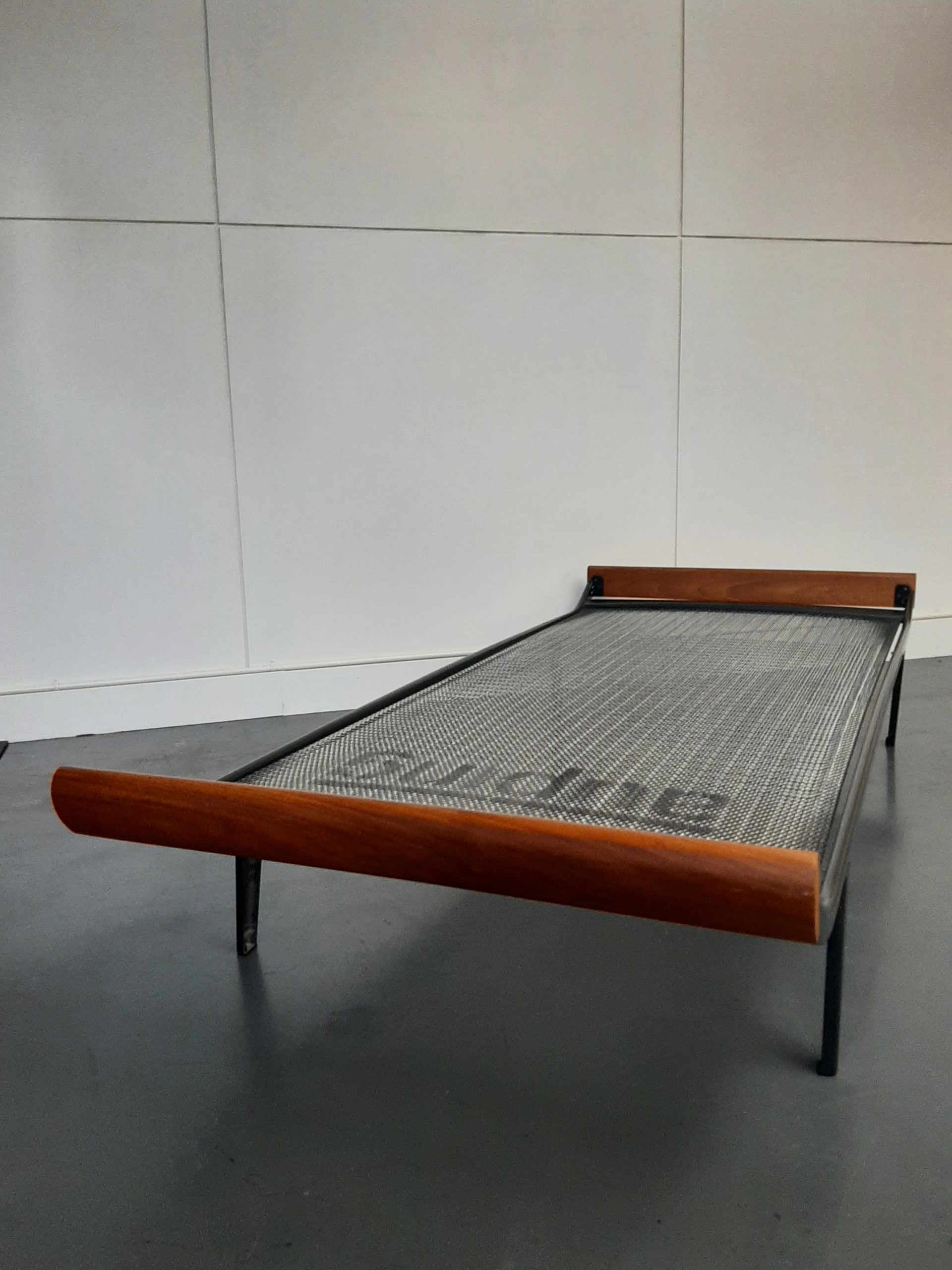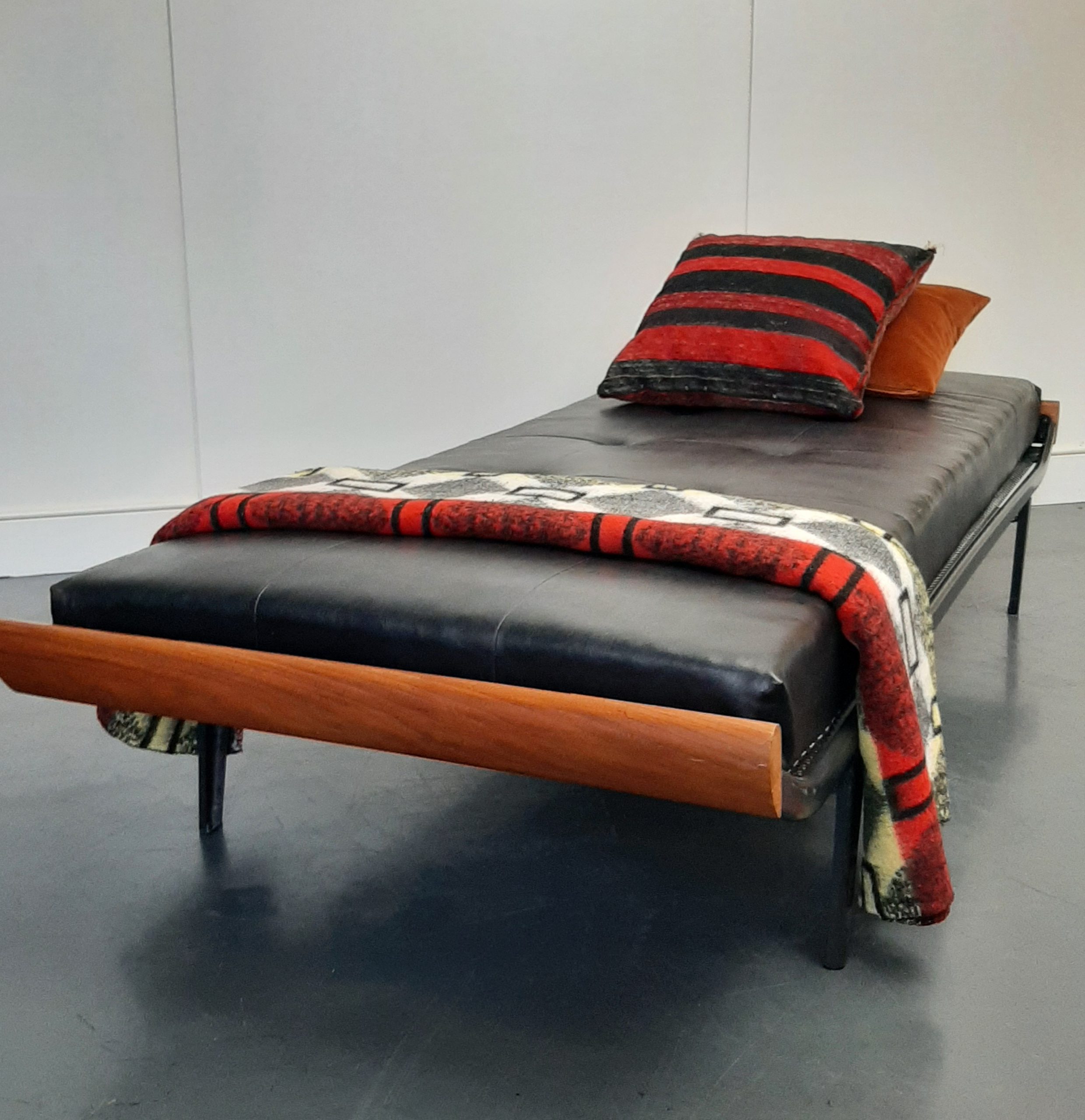 From 1953 to 1982 Auping produced the Cleopatra bed, designed by Dick Cordemeijer. Nowadays this very stylish piece of furniture is mainly used as daybed. The mattrass is not original but fits very well to the frame. In very good condition, total length 197 (mattrass 190), width 84, height 27 (39 with mattrass).