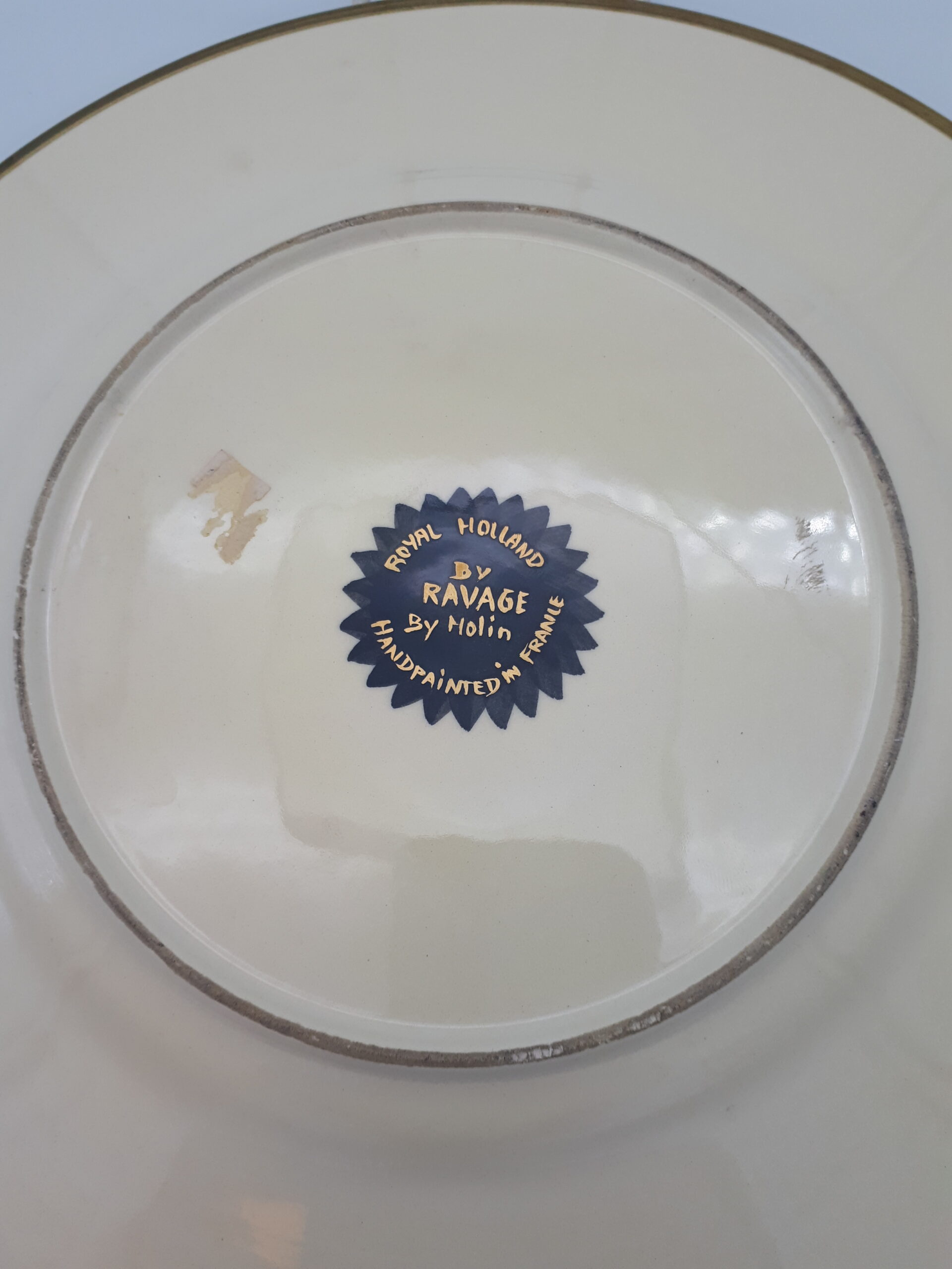 Mooi bord van het ontwerpersduo Arnold van Geuns en Clemens Rameckers, ‘Ravage’, titel 1806, serie Royal Holland, geïnspireerd door de stijl van het Napoleontische keizerrijk en het Koninkrijk Holland van Lodewijk Napoleon, handbeschilderd in Frankrijk, Molin Faiencerie, c. 1990, in goede staat, diameter 26,5.