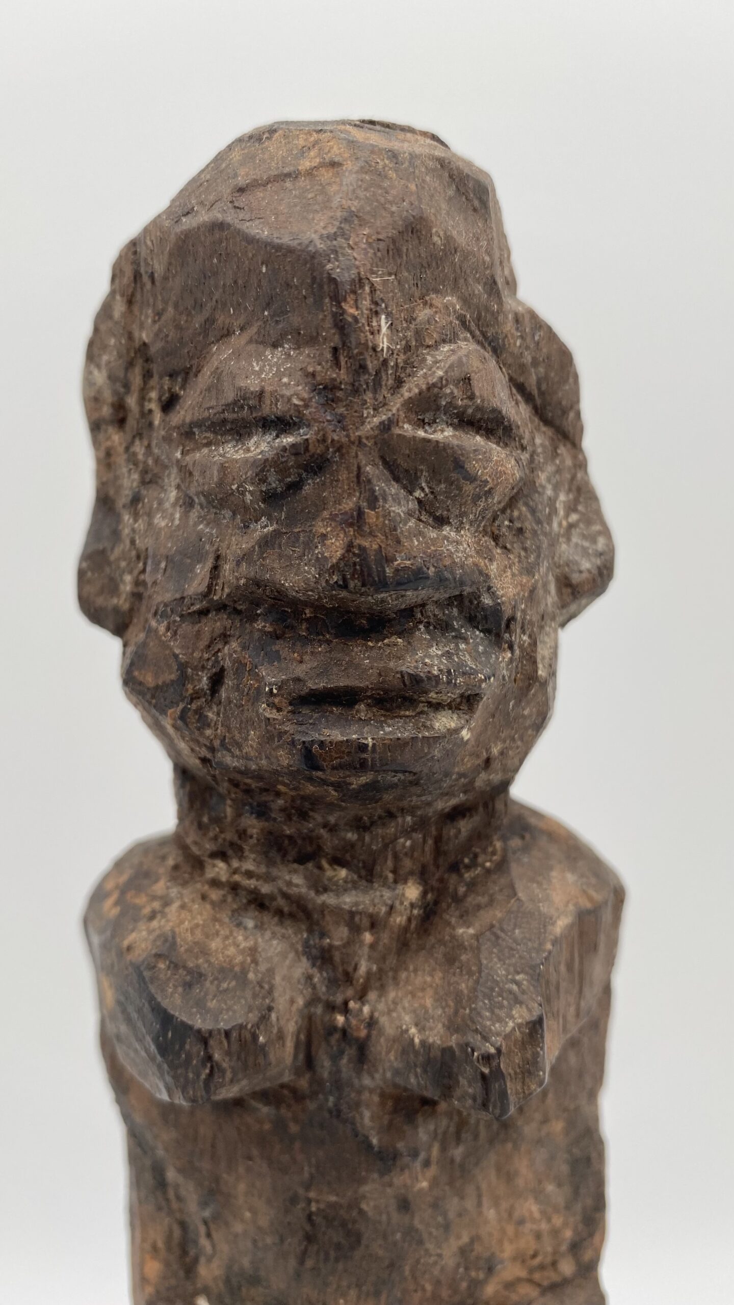 Well-used guardian or “Botchoi”- figure; used to protect the courtyards of families. This specific figure has been offered on and has a nice dark patina. Also traces of red clay. Fon tribe Togo, second half 20th century, face carved in the typical Fon-style in hardwood. Height; 21 cm. From a private Dutch collection.
