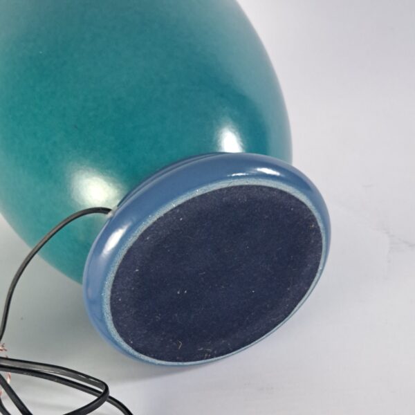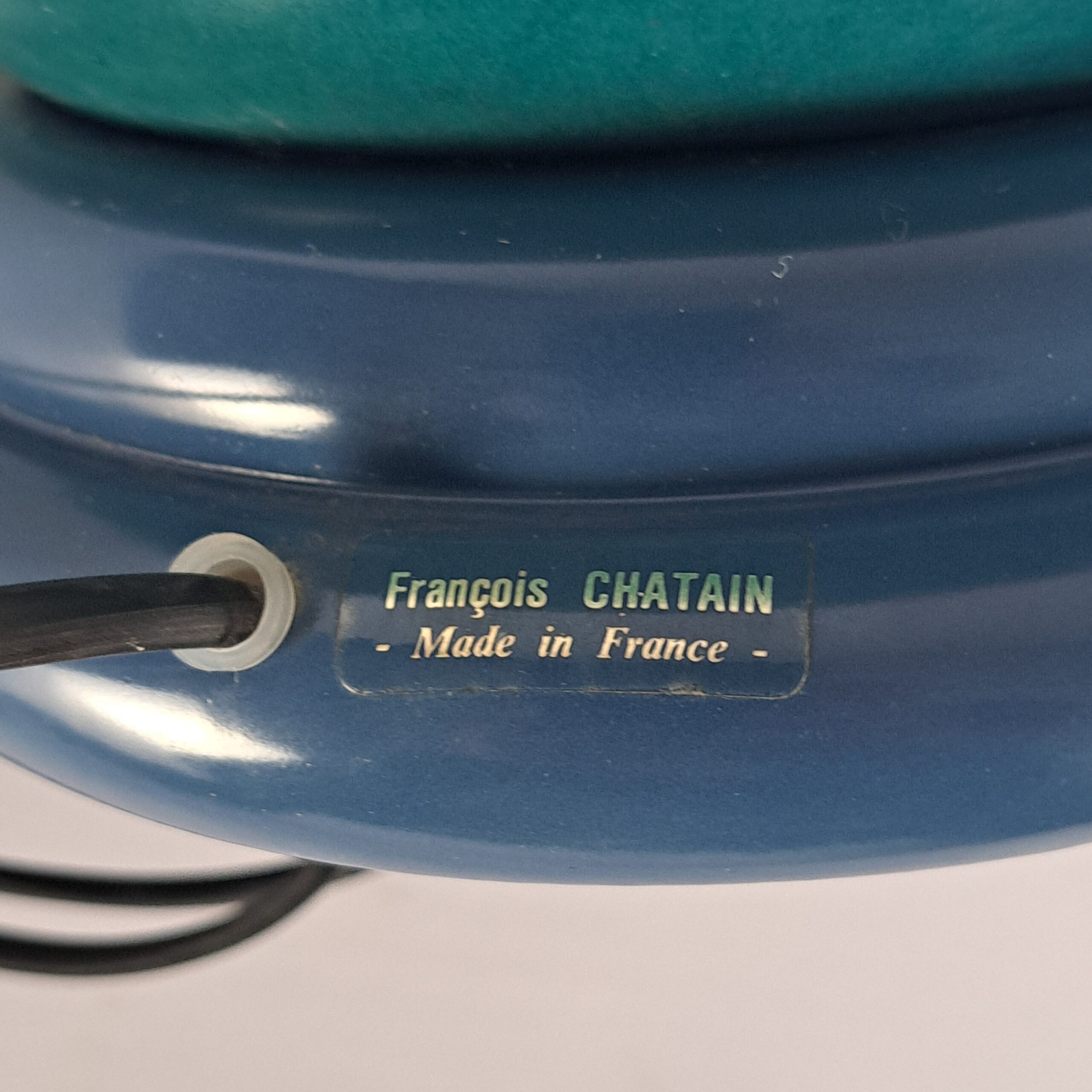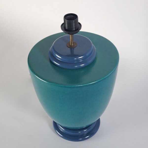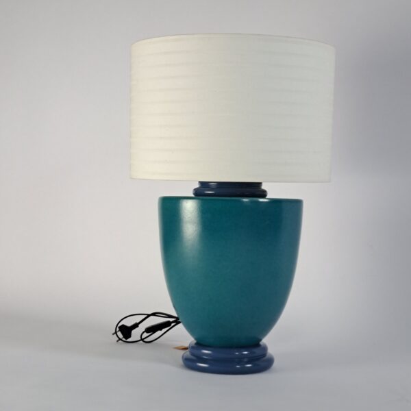 Beautiful Memphis-inspired ceramic table lamp by the French designer Francois Chatain, 1980s. In very good condition, h. 35 (with shade 58), diameter 27, base 17; diameter shade 37