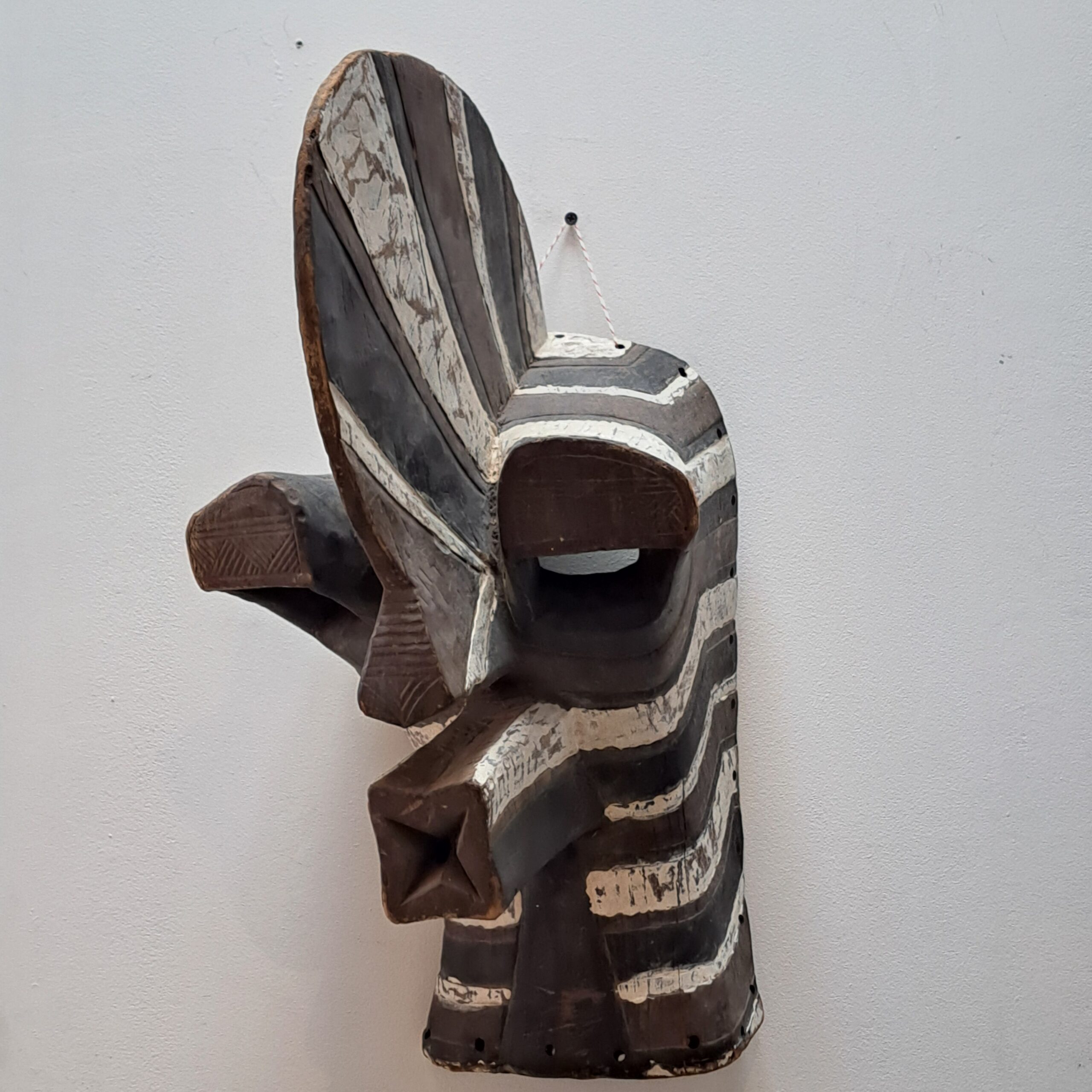 A beautiful ‘Kifwebe’ mask, used in the ceremonial practices of the Songye-people in Congo. The high comb and half-closed eyes indicate that this is a male mask. It features parallel painted lines and the characteristic square mouth. The holes along the edge are used for attaching raffia. In good condition, but ons of the sides is missing for a part and there is a crack in the other side.But this material condition in no way detracts from the appearance of this object and emphasizes its authenticity. From a private collection, acquired in the 1960s. H. 55, w. 30, d. 34