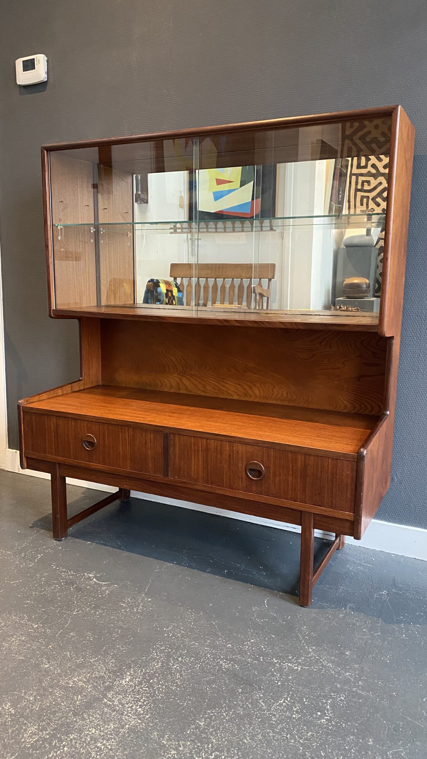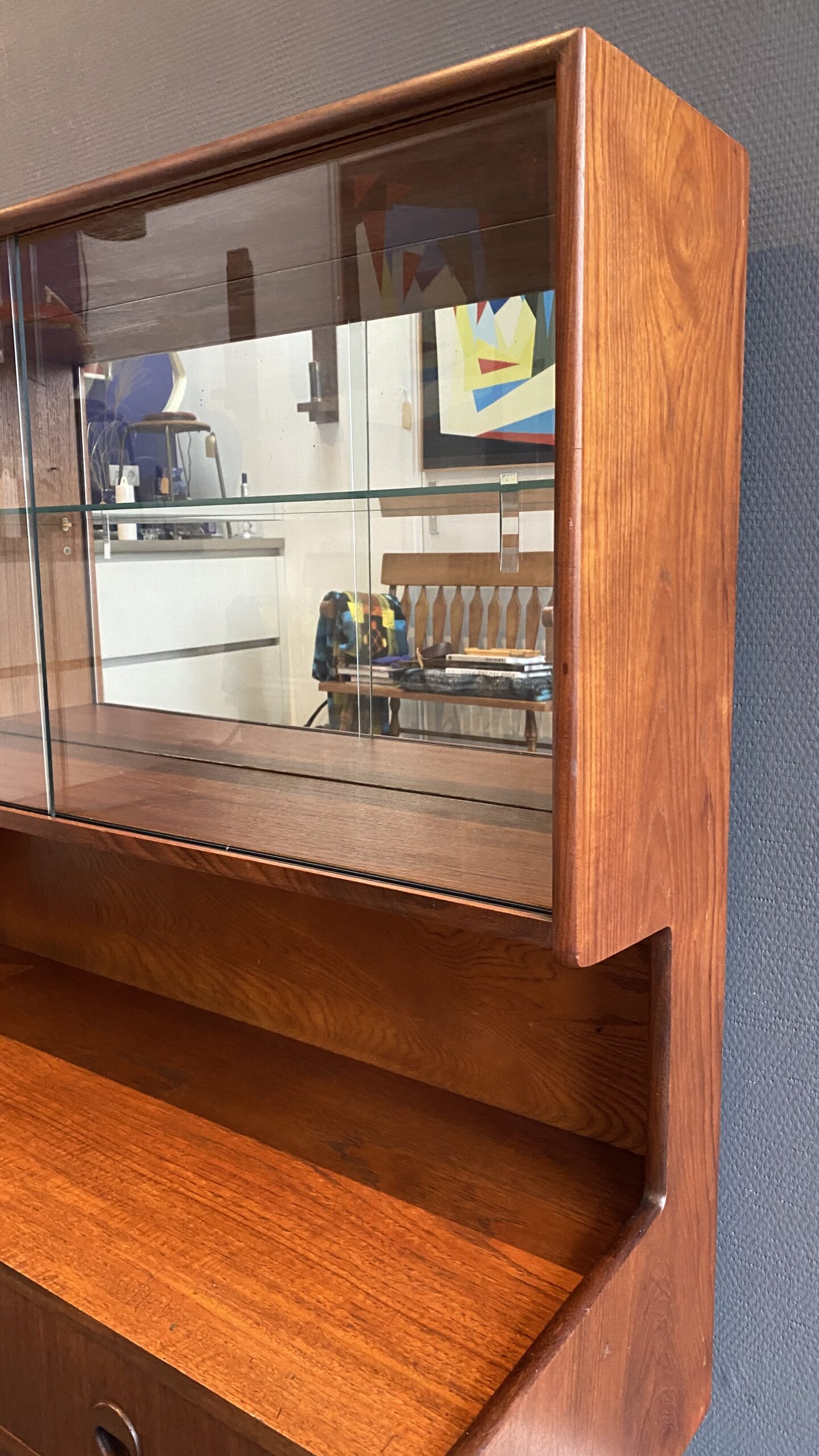 The English cabinetmaker Tunridge specialised in display cabinets of a high quality. This cabinet in teakwood is a very good example of the Turnidge-products and can easily find a place in your home because of its measures 121 height, 106 width and 40/25 depth. Ideal to display your glassware. The mirror gives a very festive effect to this cocktail cabinet. In good condition, with the original brandlabel in metal.