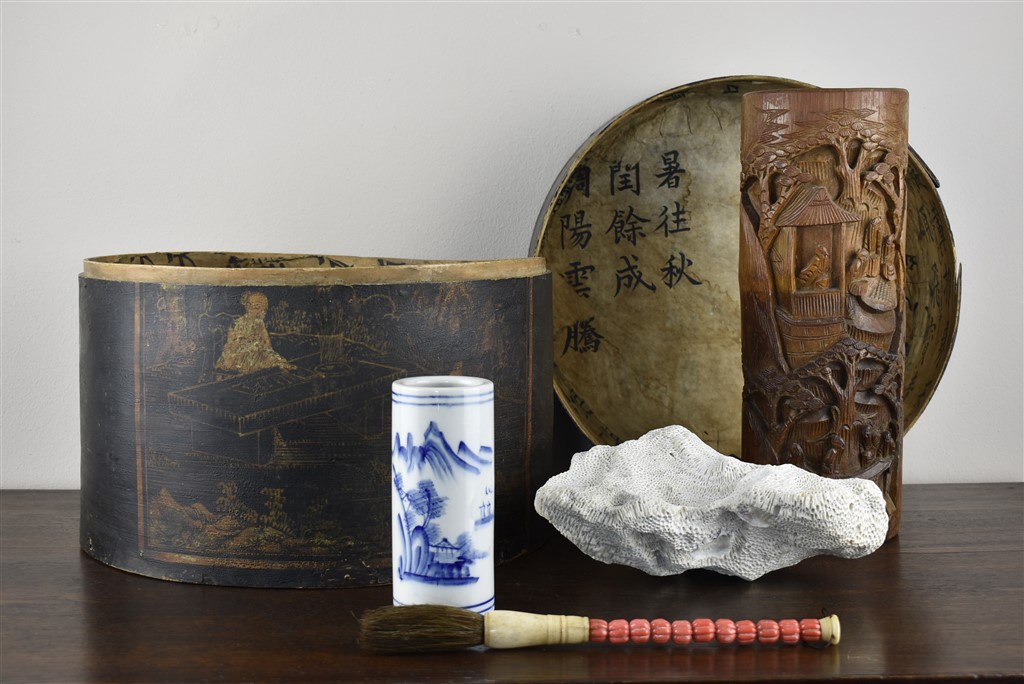 Chinese (hoeden)doos met calligrafie en Scholar