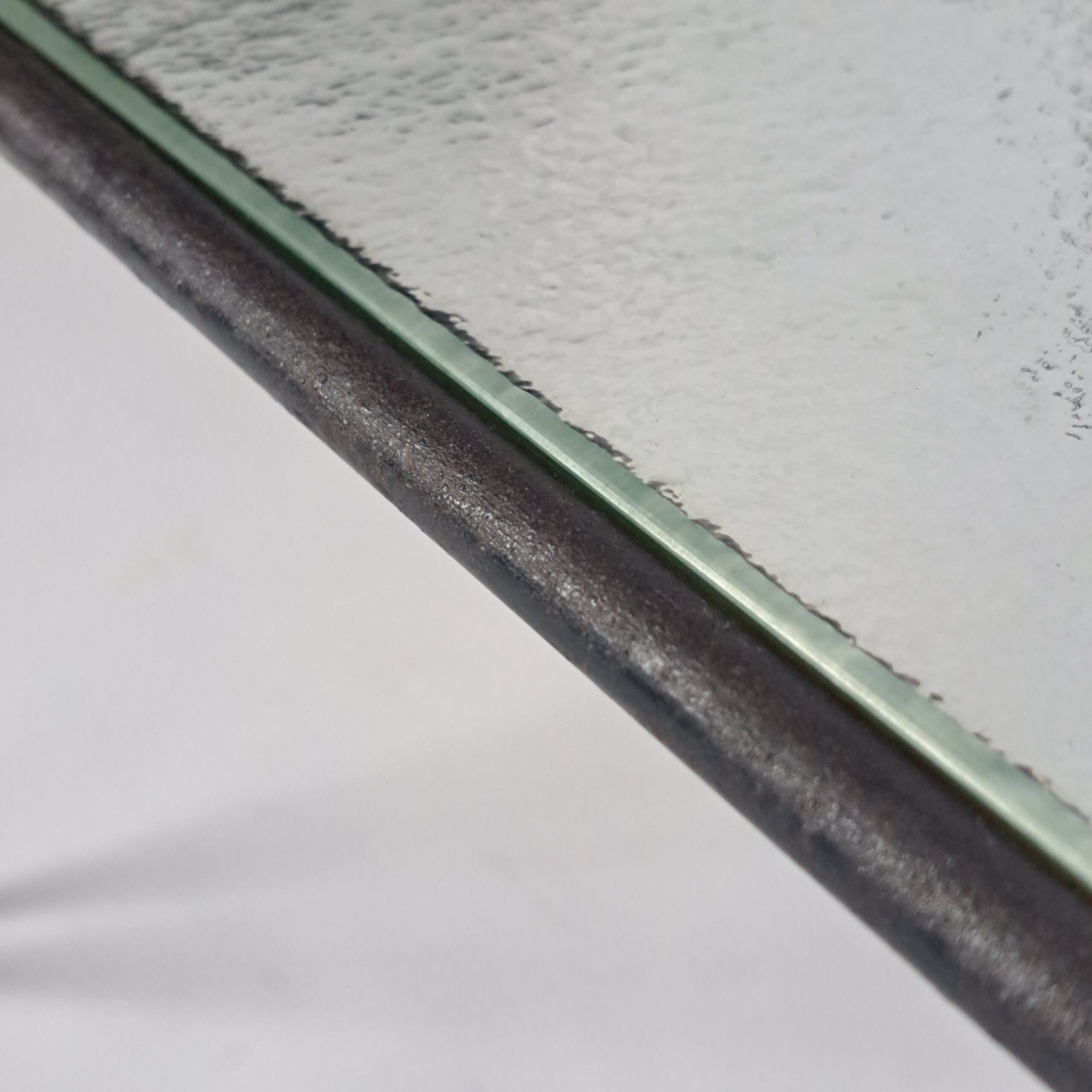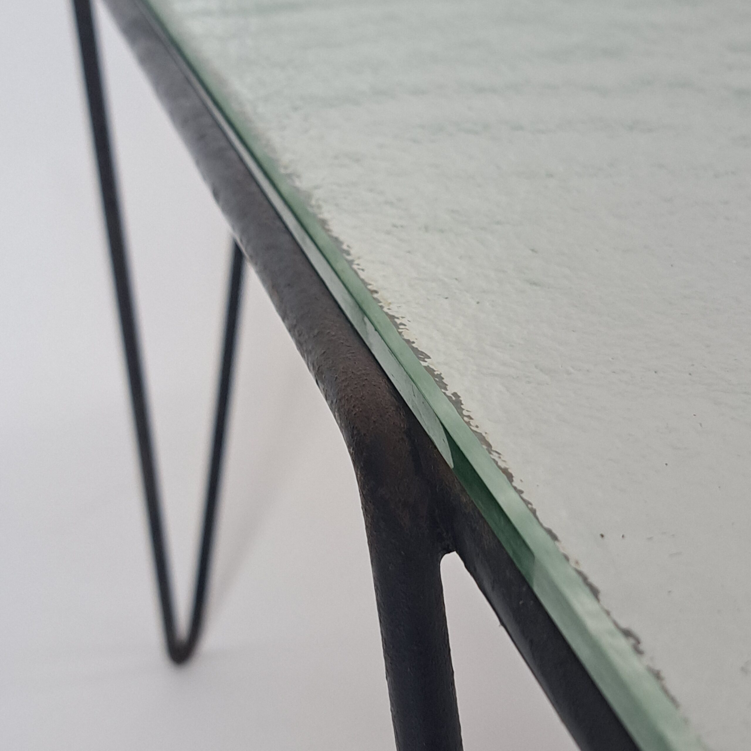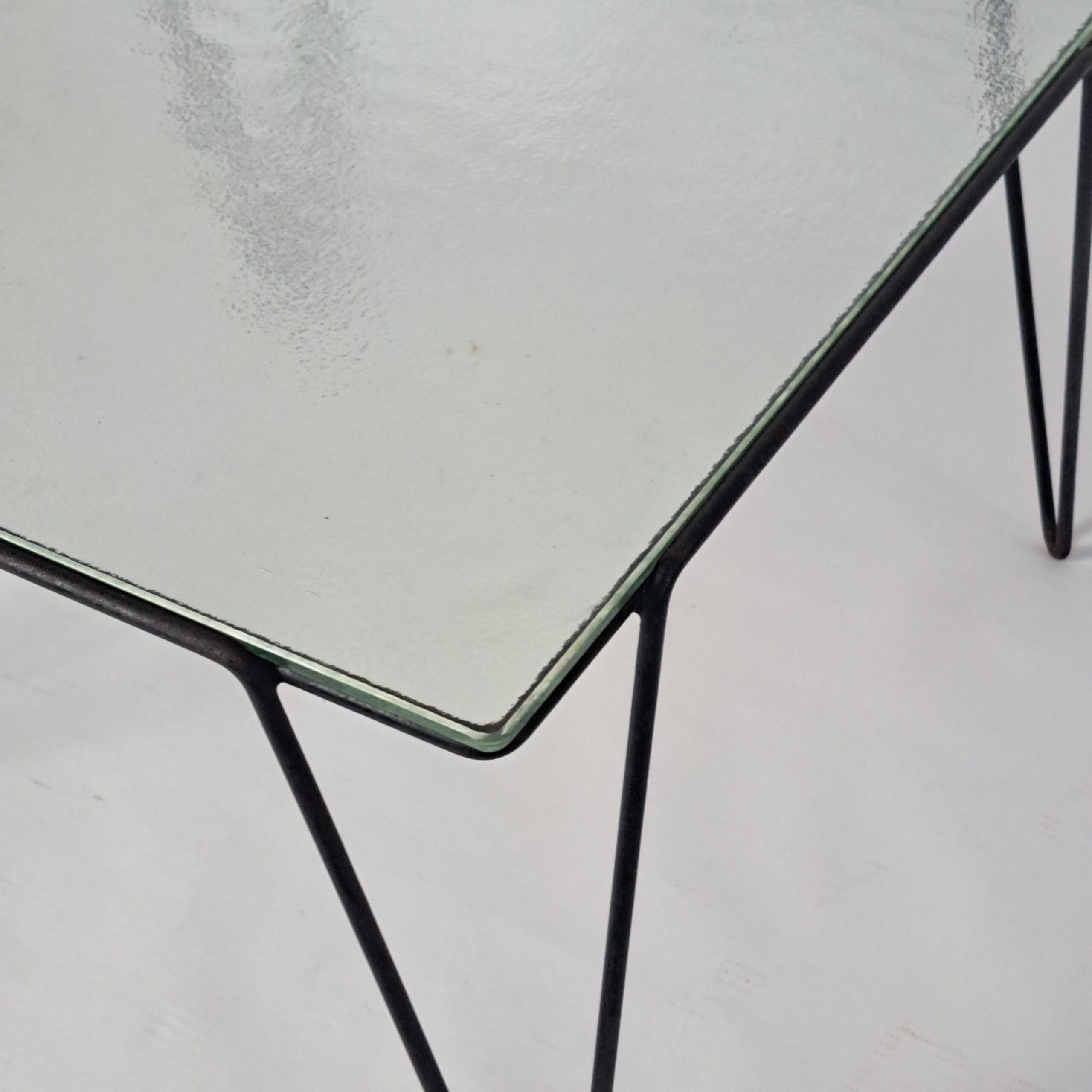 This coffeetable in glass and metal is a very good exemple of the esthetics of Bueno de Mesquita and Goed Wonen. Severe minimalism in Dutch design in the 1950s, though very elegant. The table is in good condition, the glass is in mint condition and the metal is slightly corroded, but easy to spray over. H. 44, 65×65.
