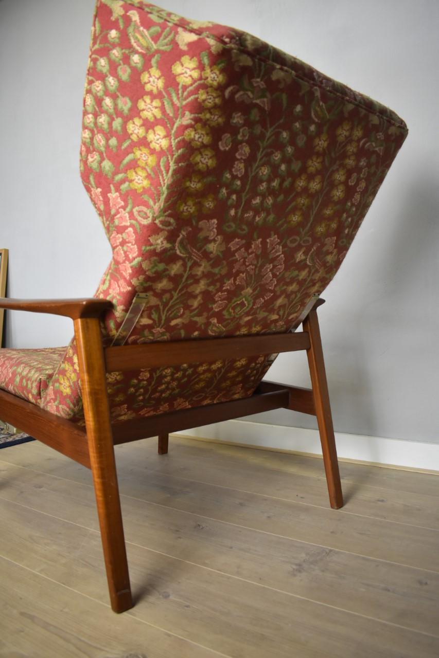 Karaktervolle Deens design fauteuil met verstelbare rugleuning en zitting om er een echte relaxstoel van te maken. De stof met bijzonder patroon van bloemen en vogels is origineel met een gobelin-achtige touch.