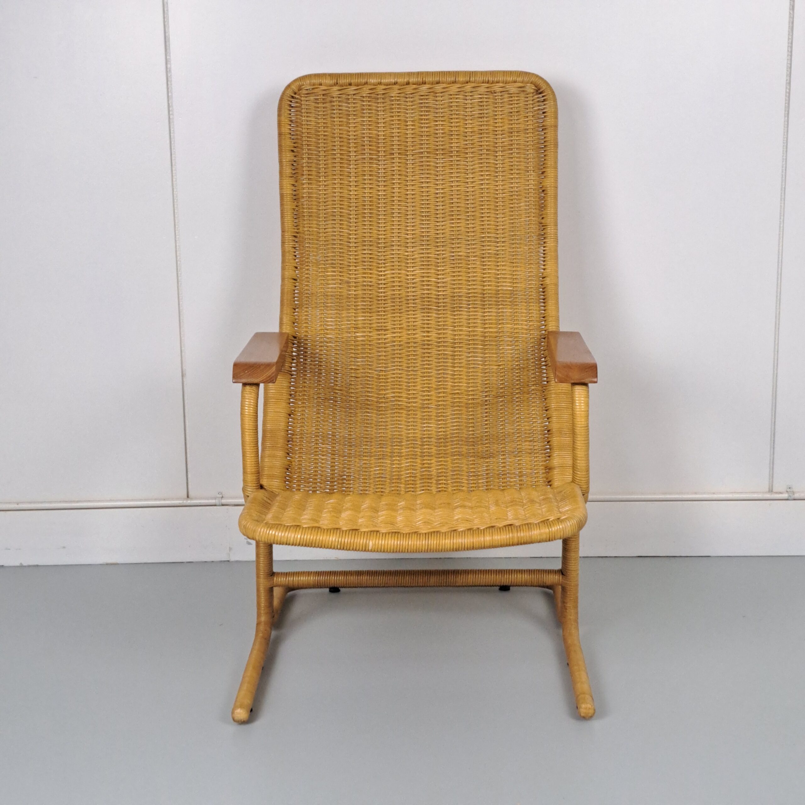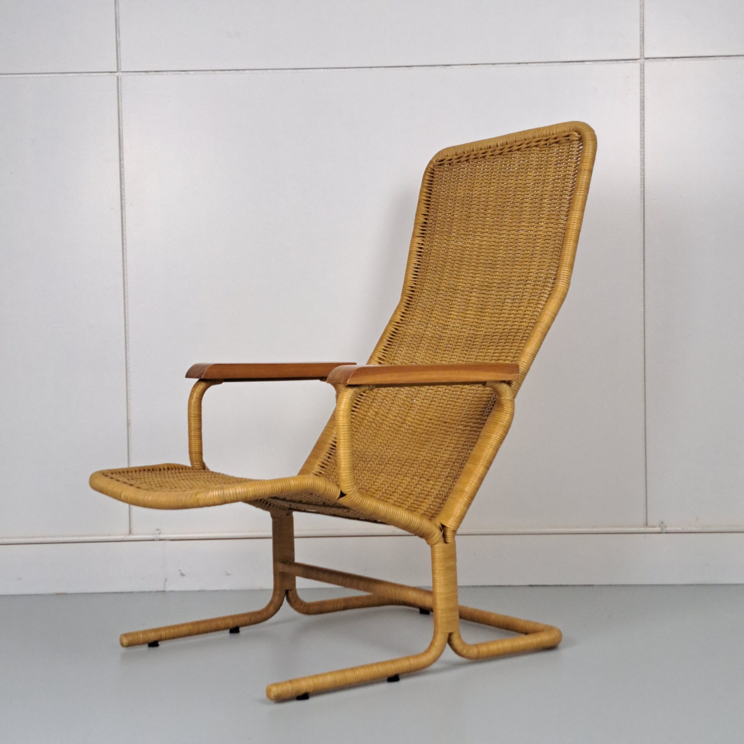 Very comfortable easy chair with a steel frame and rattan back and seat, often attributed tot Dirk van Sliedregt for Gebroeders Jonkers. Dutch quality design from te 1970s in very good condition, h. 100, w. 60, d. 80, seat h. 33, seat d. 50
