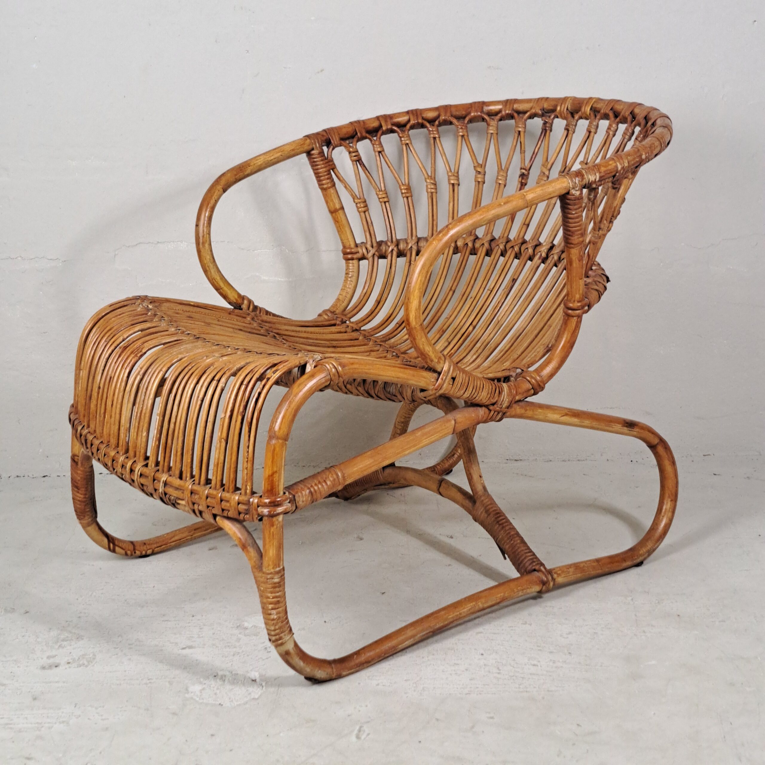 Very elegant Italian rattan easy chair with beautiful curves. It is a rare model with an exceptionel deep seat. The chair is not marked, but from our research it is clear that this chair was not produced in one of the well-known Dutch factories, like Jonkers or Rohé, but most probably in Italy, based on the style and weaving techniques of the chair. In very good condition, stylewise late 1950s, h. 64, w. 59, d. 90, seat h. 38, seat d. 50