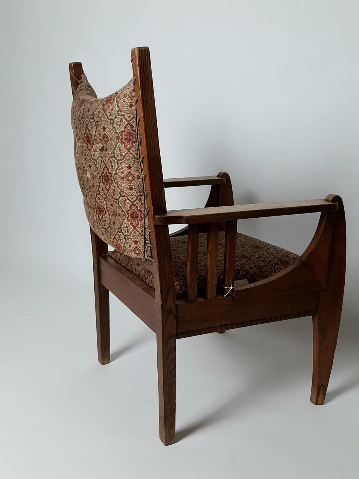 In goede staat, eiken met stoffen rug en zitting, rughoogte 93, zithoogte 39, breedte 56, diepte 50