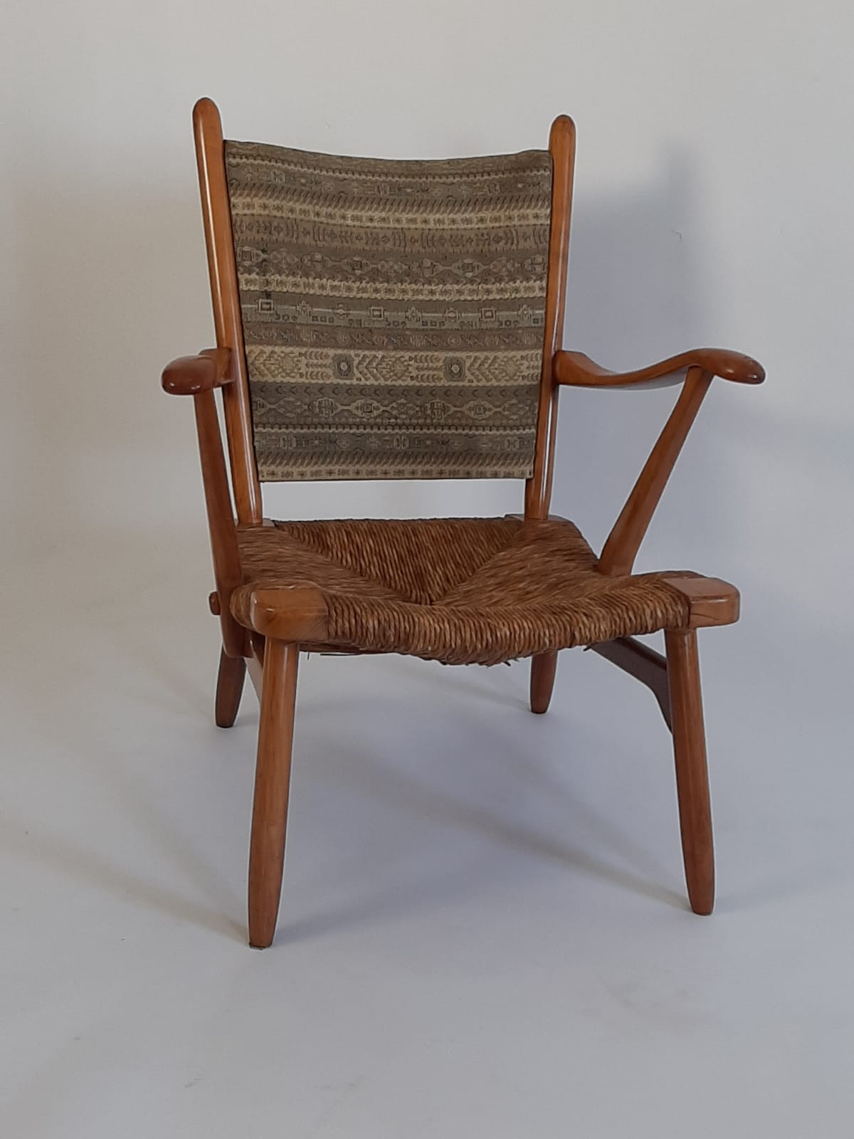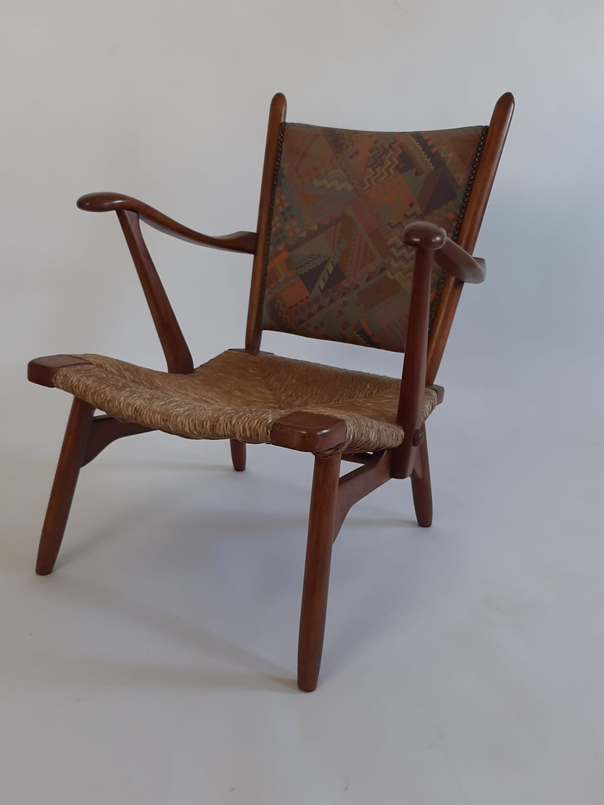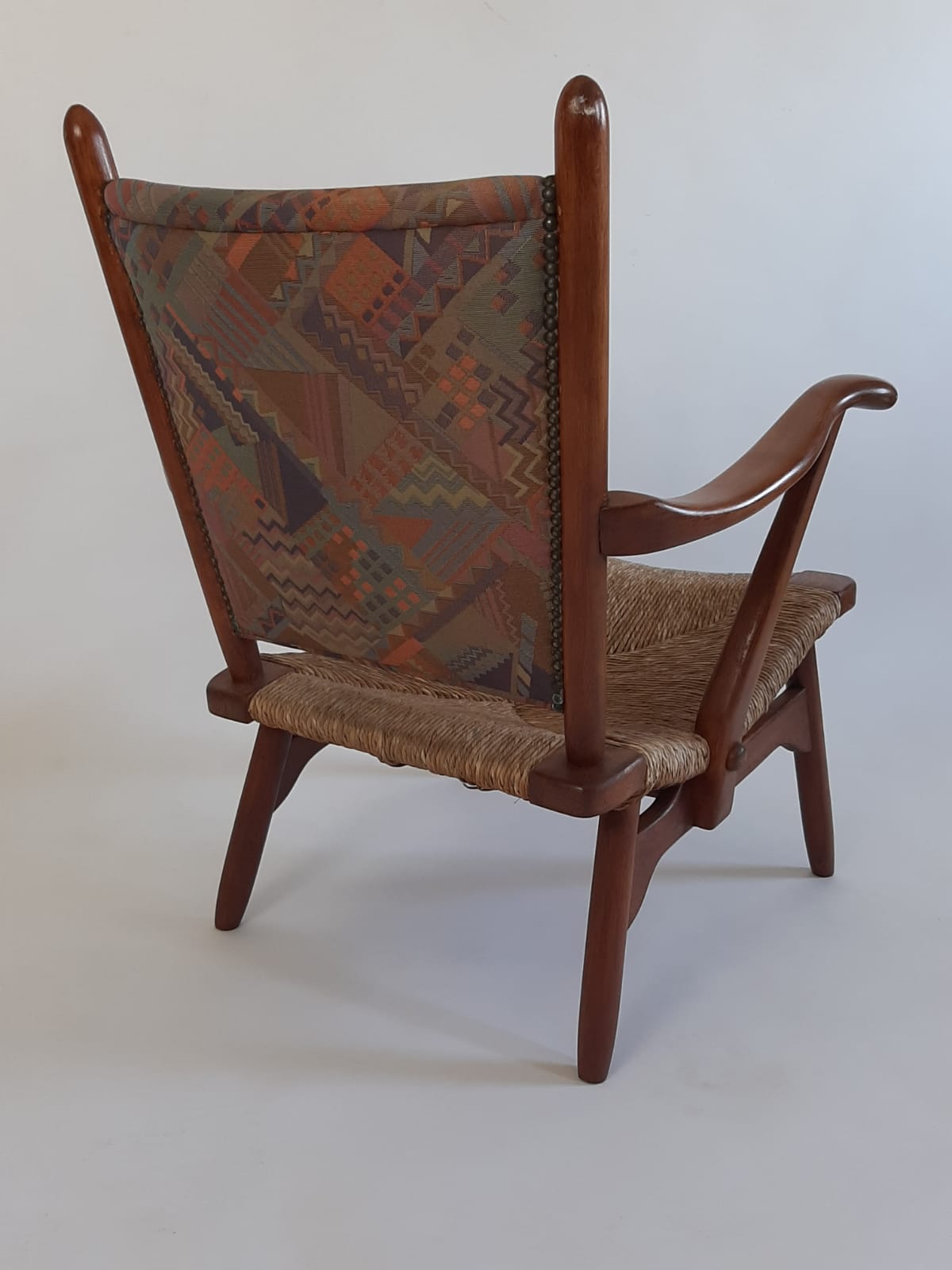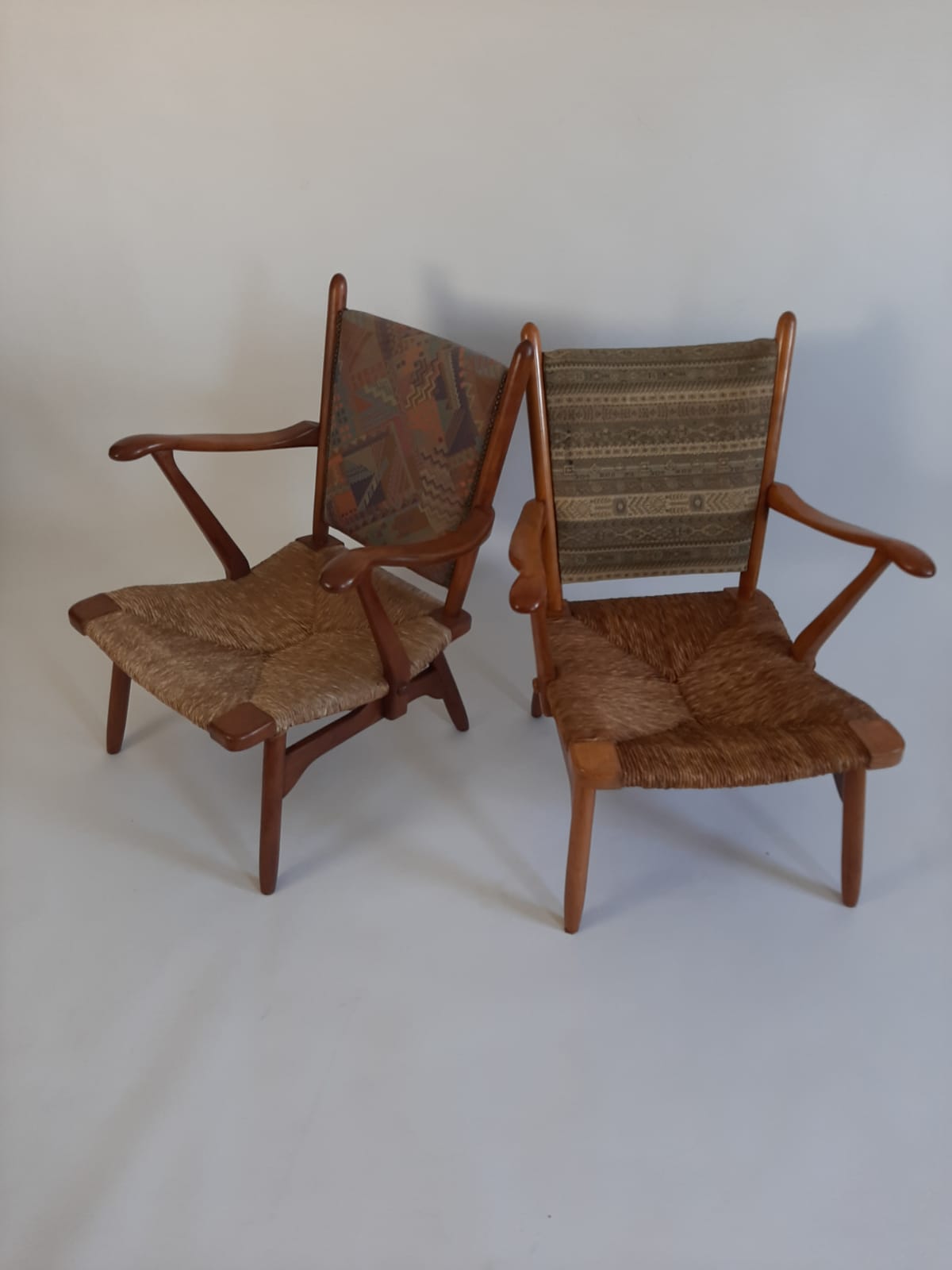 Twee fauteuils Gelderland de Ster. De ene stoel heeft de originele bekleding (gestreept), de andere (paars) is opnieuw gestoffeerd. De biezen zittingen zijn in goede staat, aan de onderkant enkele losse stukjes. De oorspronkelijke stof heeft een lichte slijtageplek. De originele stoel heeft de maten rughoogte 76, breedte 66, zithoogte 33, zitdiepte 56. De andere wijkt licht af met de hoogte van de armleuningen. In goede vintage staat. Per set beschikbaar of per stoel. De prijs per stoel is 225, de setprijs is 450.