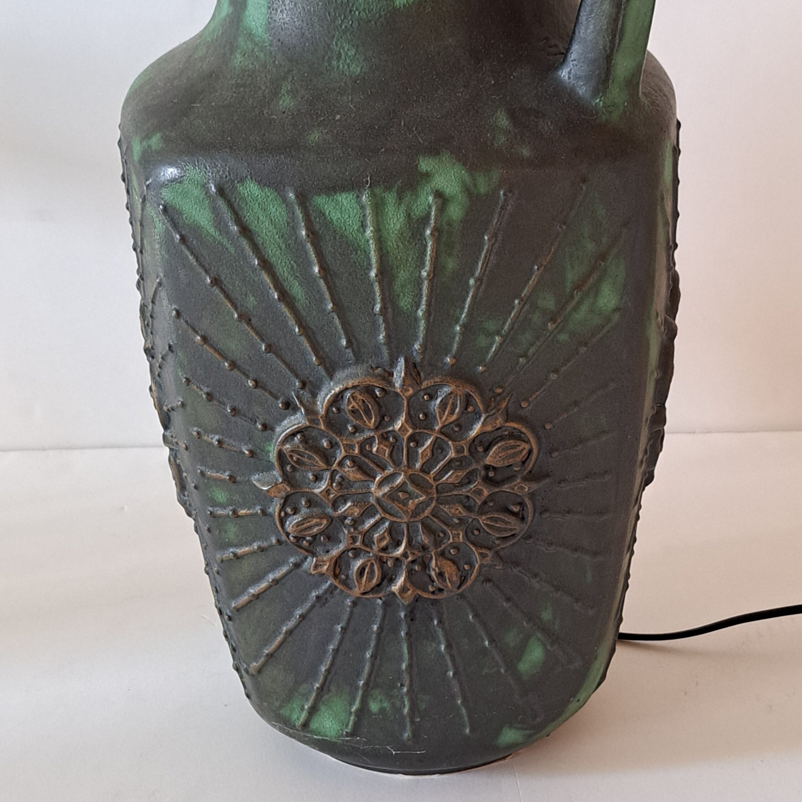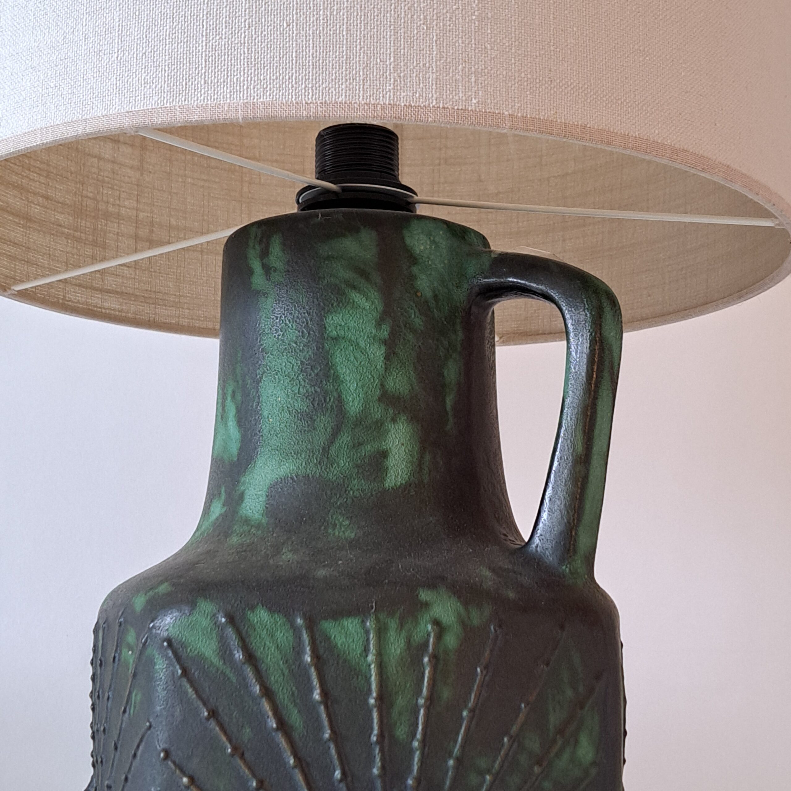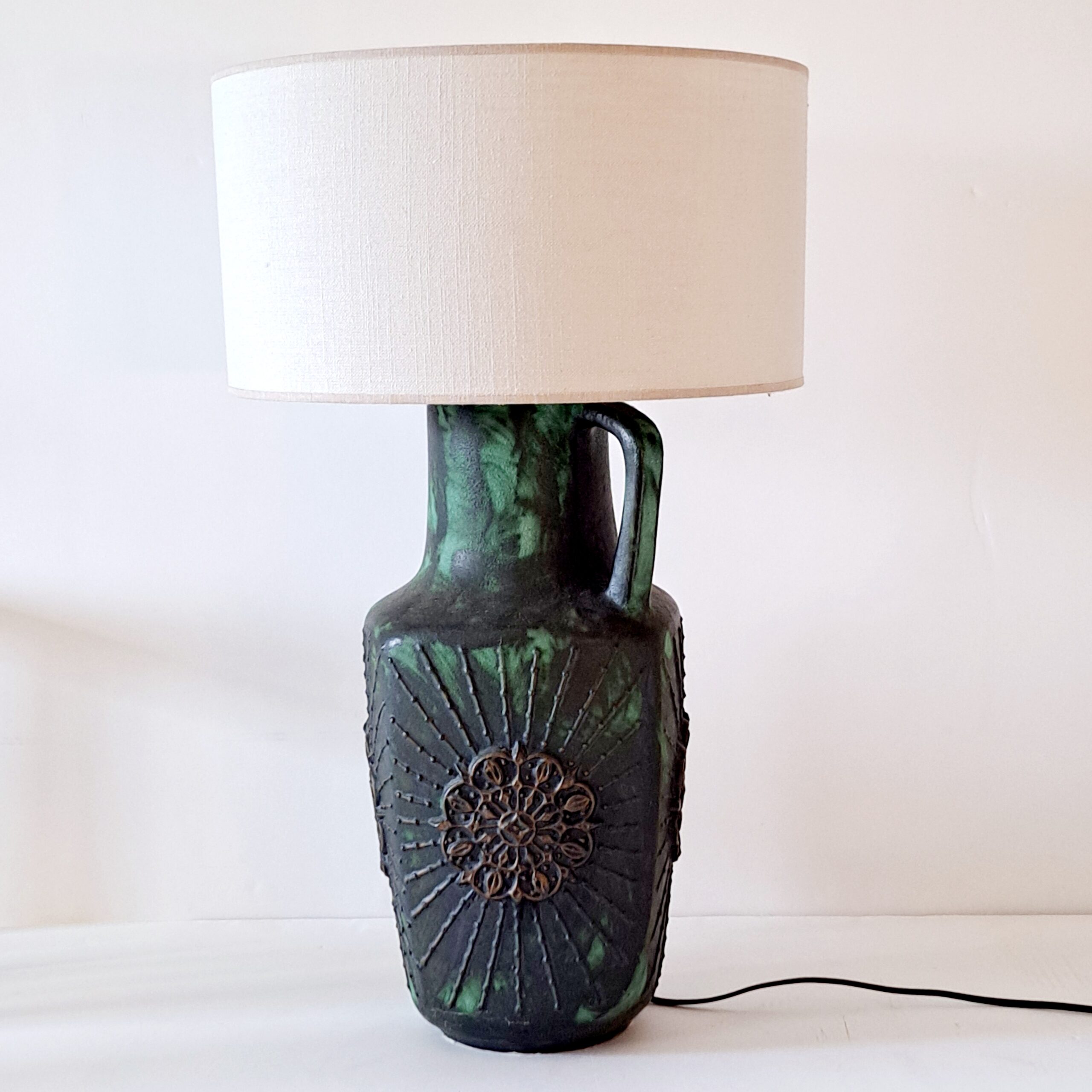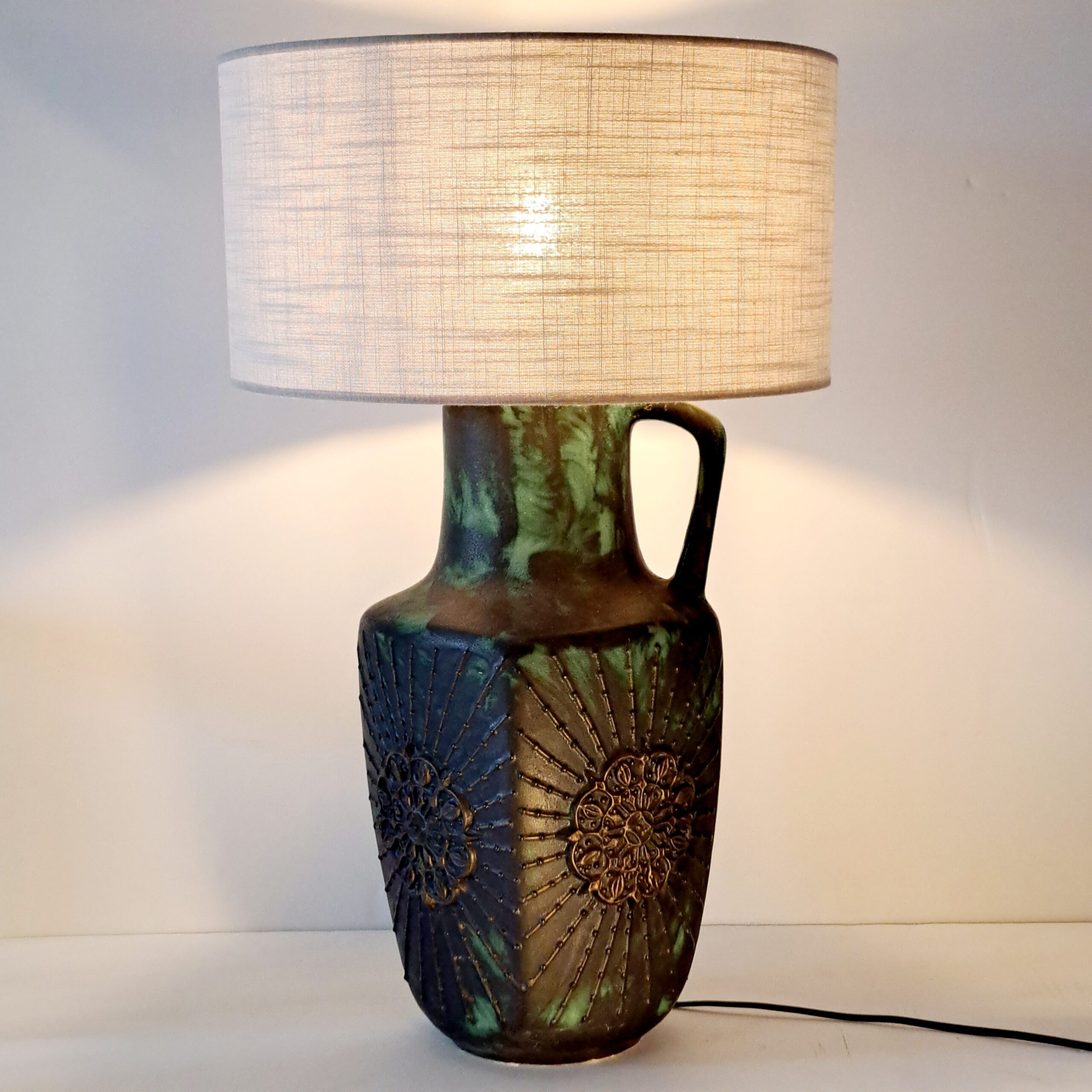 Large floor lamp West-Germany ceramics, with a nice decoration in green/bronze glaze; with a fabric lampshade, in very good condition, designer and producer unknown, total h. 67, diameter shade 40, h. ceramic base 47, h. shade 20