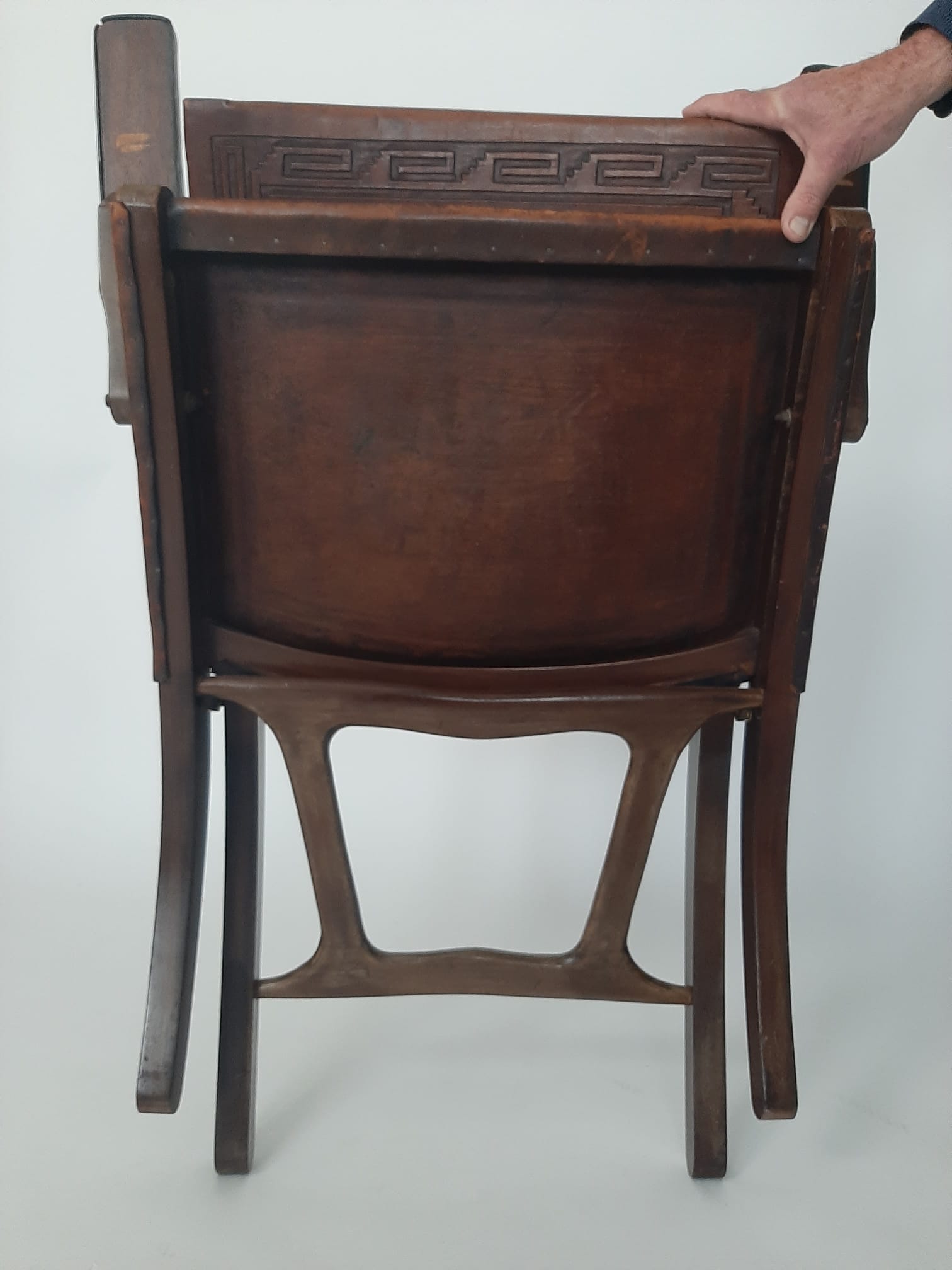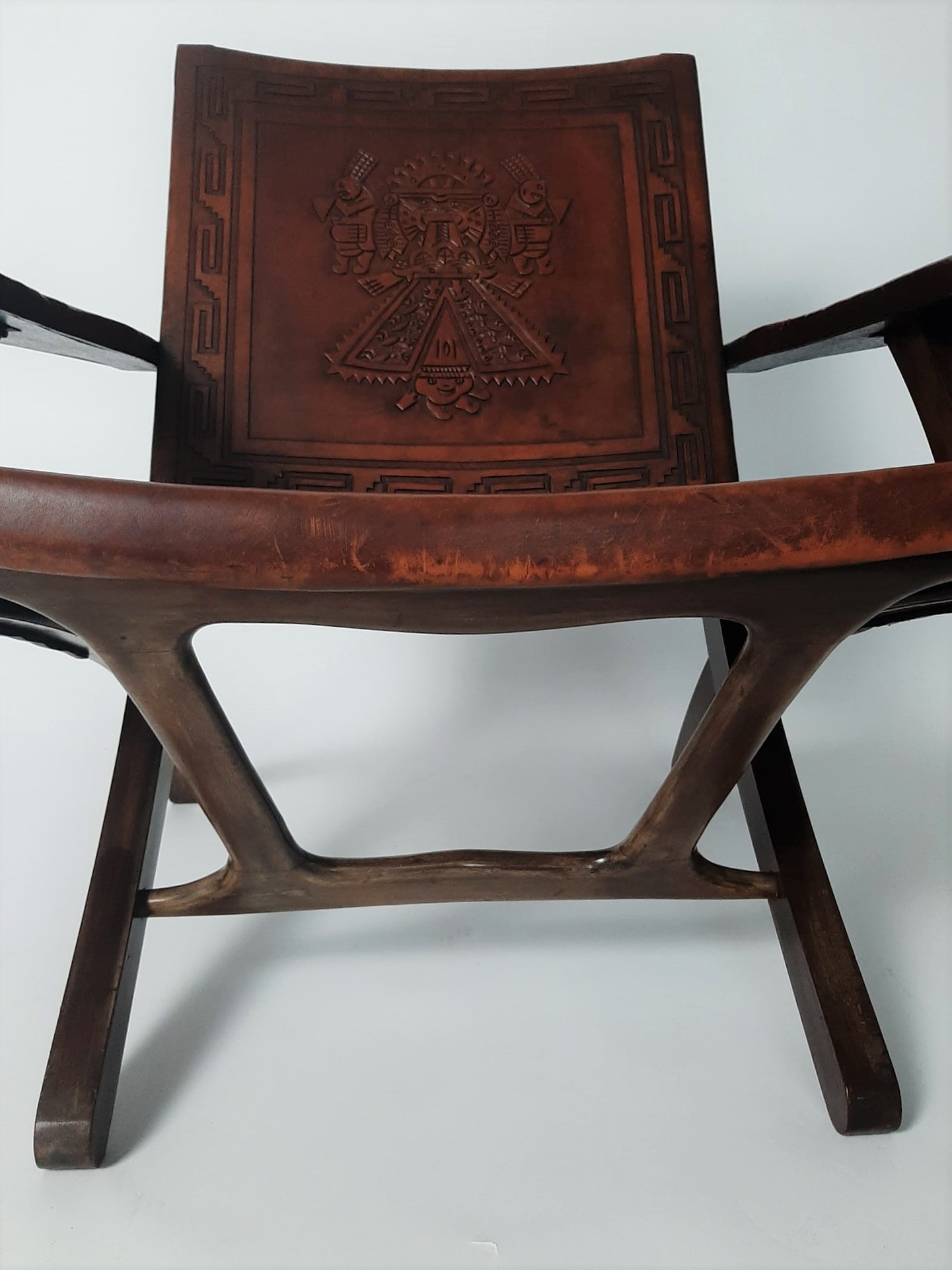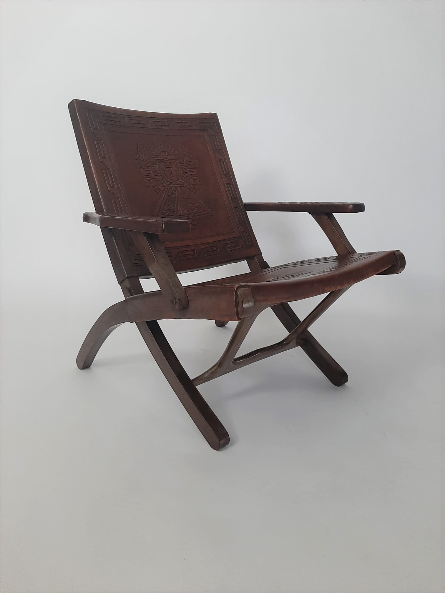 Beautiful foldable lounge chair by designer Angel Pazmino for Muebles de Estilo, Ecuador 1960’s. In the midcentury period, with financial aid from the US, Danish designers helped South-American countries like Ecuador to develop their industry in combination with good design. This lounge chair shows Scandinavian influences in its form and proportions. In very good condition, leather and meranti wood, the leather is decorated with Inca-symbols, h 74, w67, seath 38, seatd 44.
