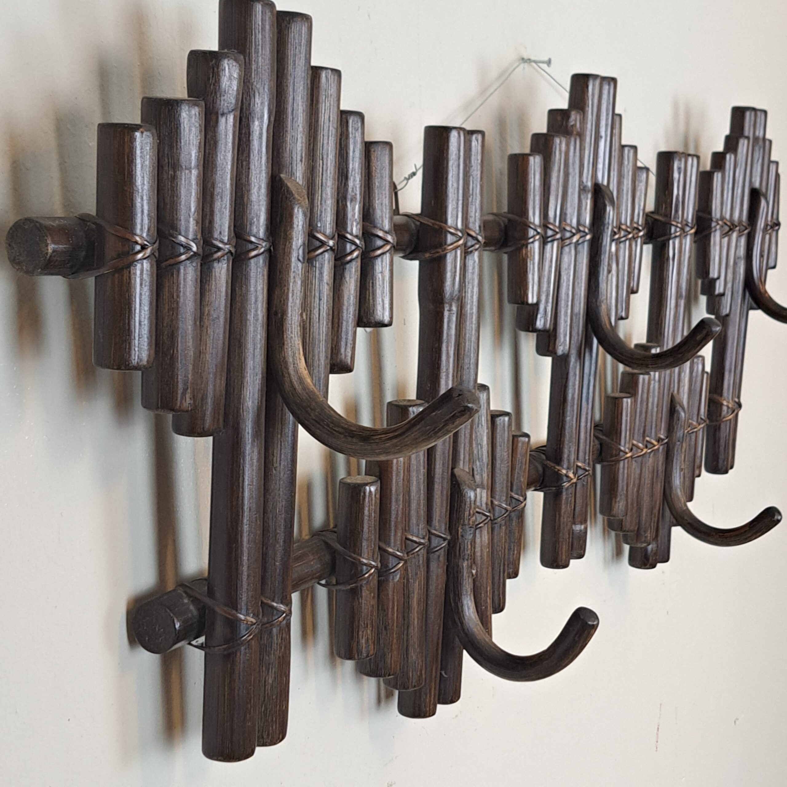 Very decorative and ‘graphic’ coatrack in manou (peeled rattan) from the 1970s, in very good condition, with iron hooks for hanging, 126x45x16