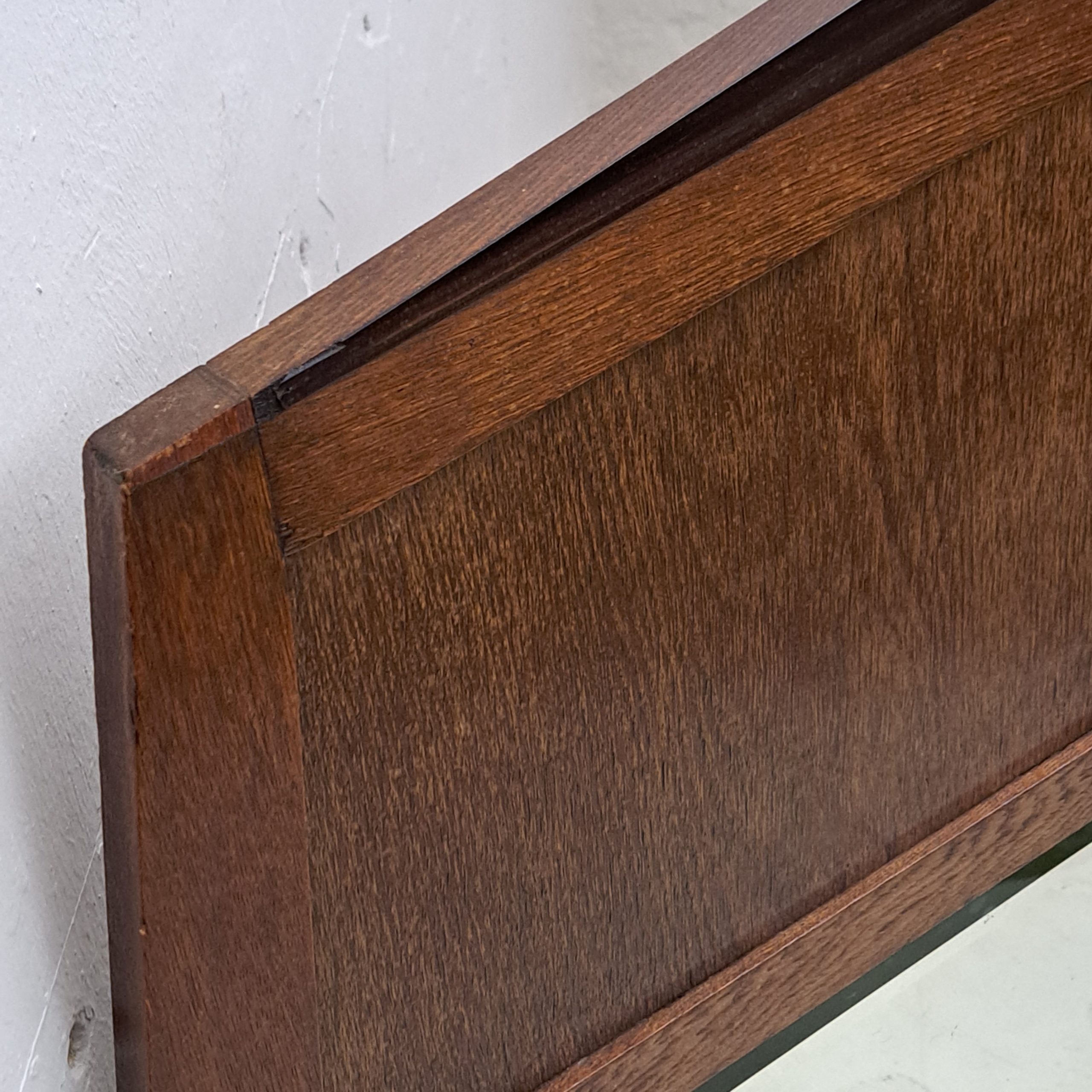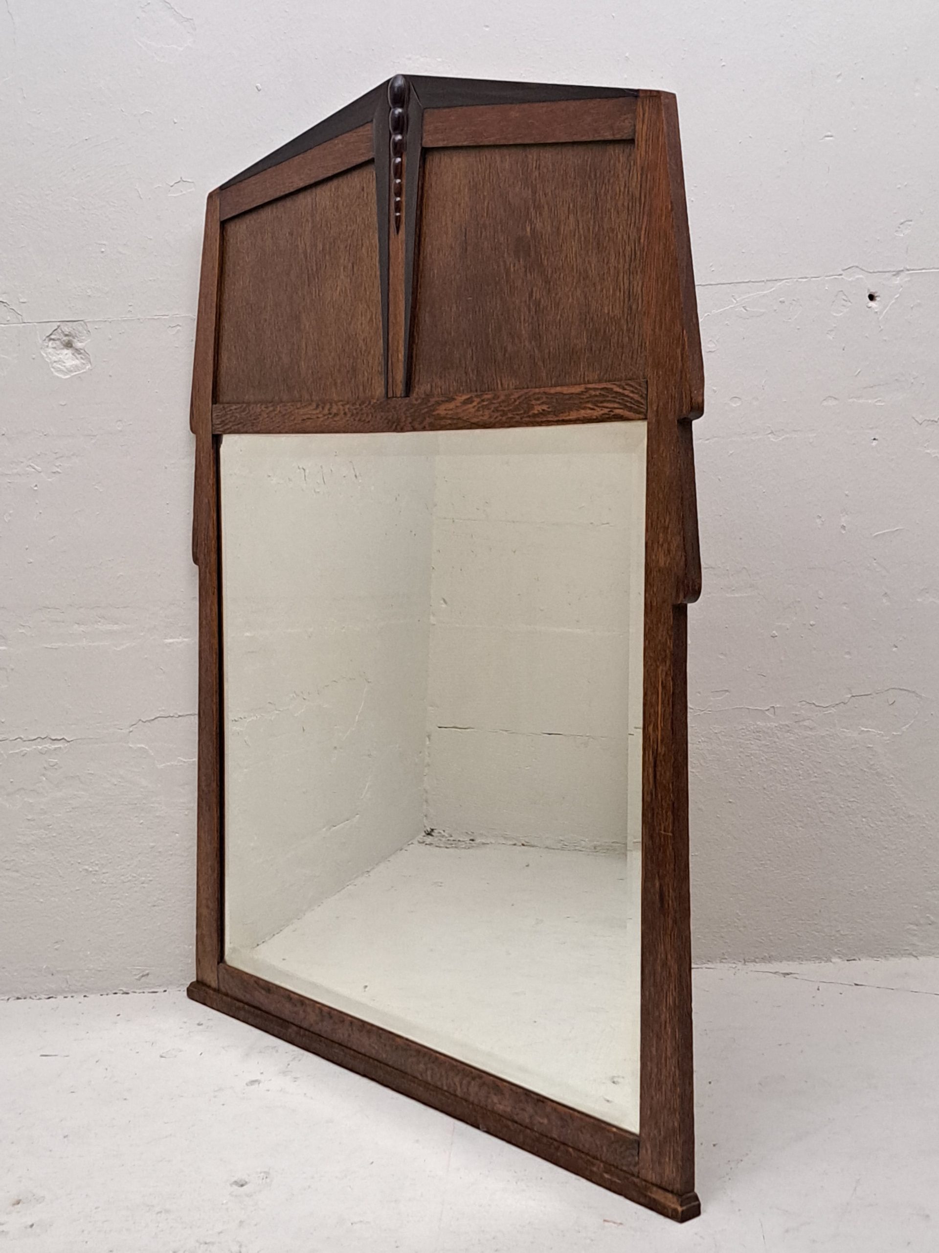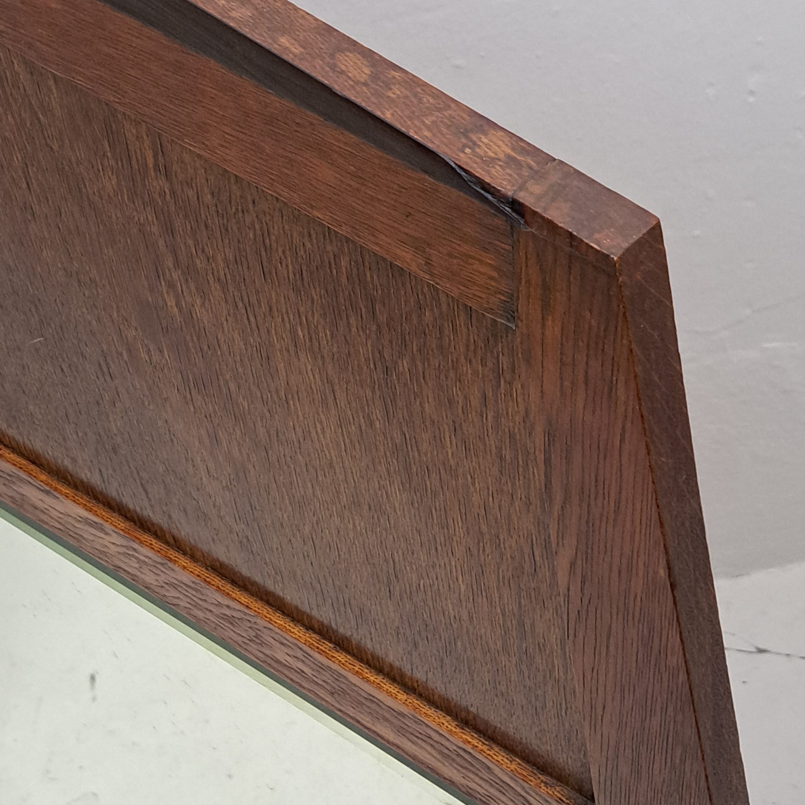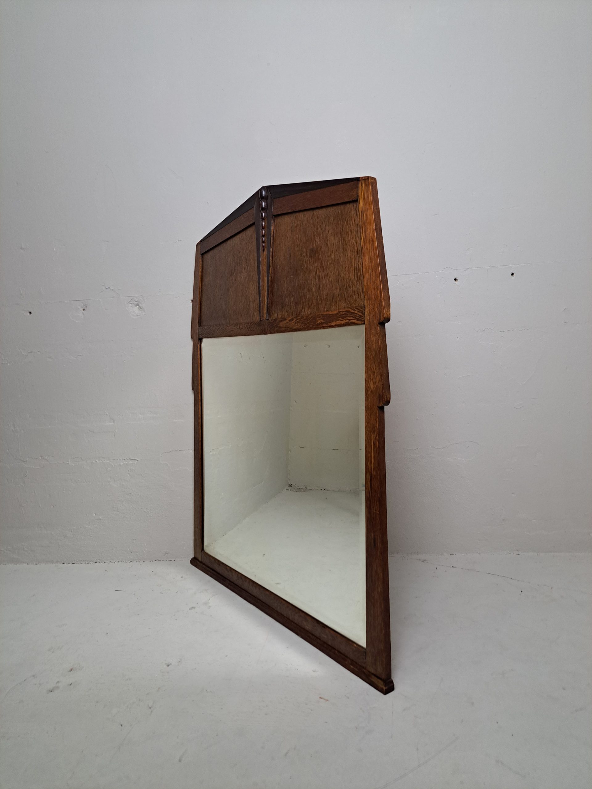 A huge mirror , Dutch design Amsterdamse School, period 1910-1920, faceted glass in oak and coromandel veneer, in good condition, lacking almost invisible ,minor bits of veneer, h. 120, w 97.