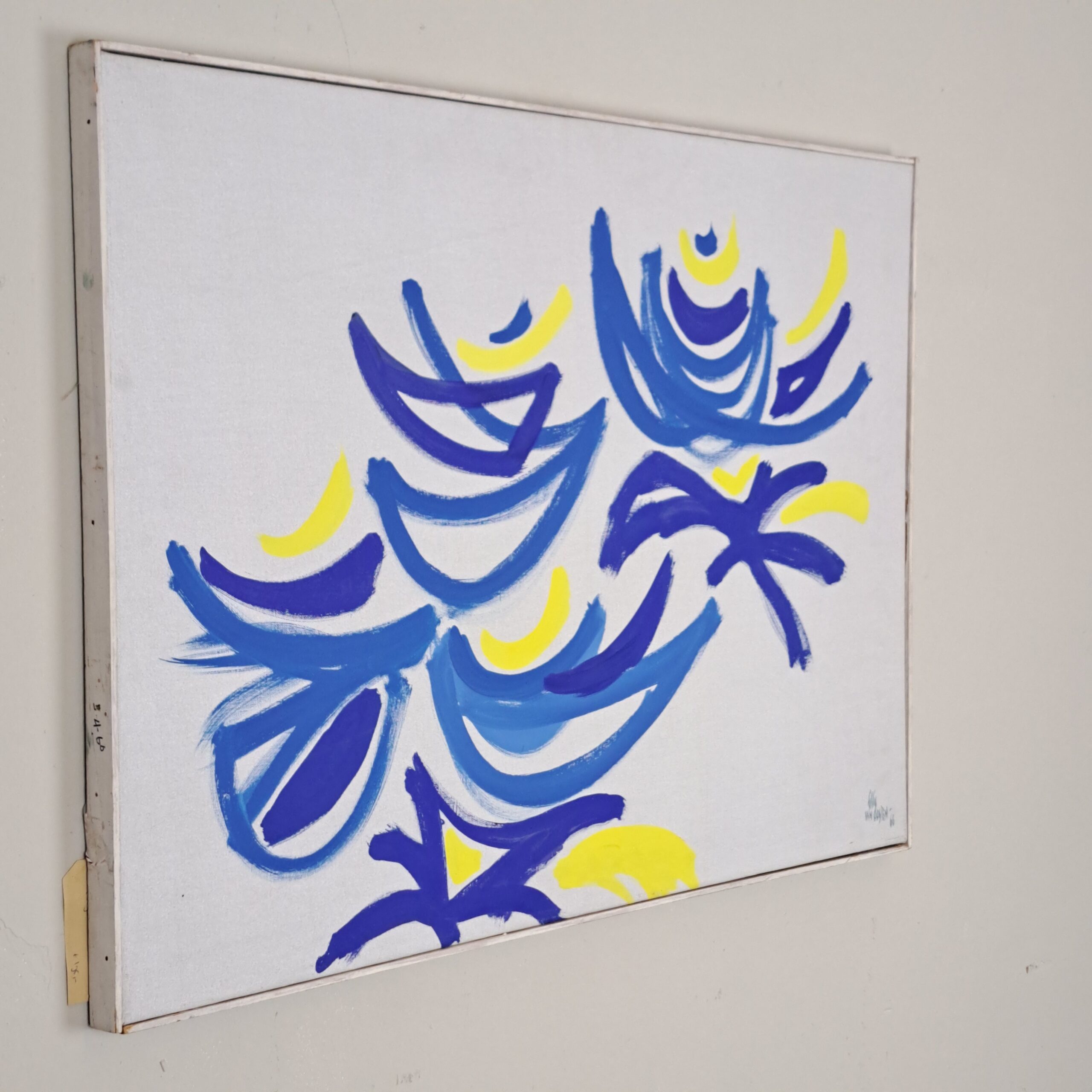 A very bright and joyful painting by the well-known Delft artist Gillis Cornelis van Oosten (Delft 1916 – Delft 2005). He worked most of his life in his hometown of Delft. Van Oosten was active as a painter, watercolourist, draftsman, graphic artist and sculptor. He also worked as a teacher at the Royal Academy of Art in The Hague (1960-1982). During his career, Van Oosten frequently experimented with different techniques and media. From paintings and drawings to screen prints and perspex reliefs. His oeuvre ranges from realistic landscapes and self-portraits to abstract splatter drawings with Indian ink. This painting is in a very good condition, acrylic on canvas, signed and dated Gillis van Oosten 1966, 81x61x3