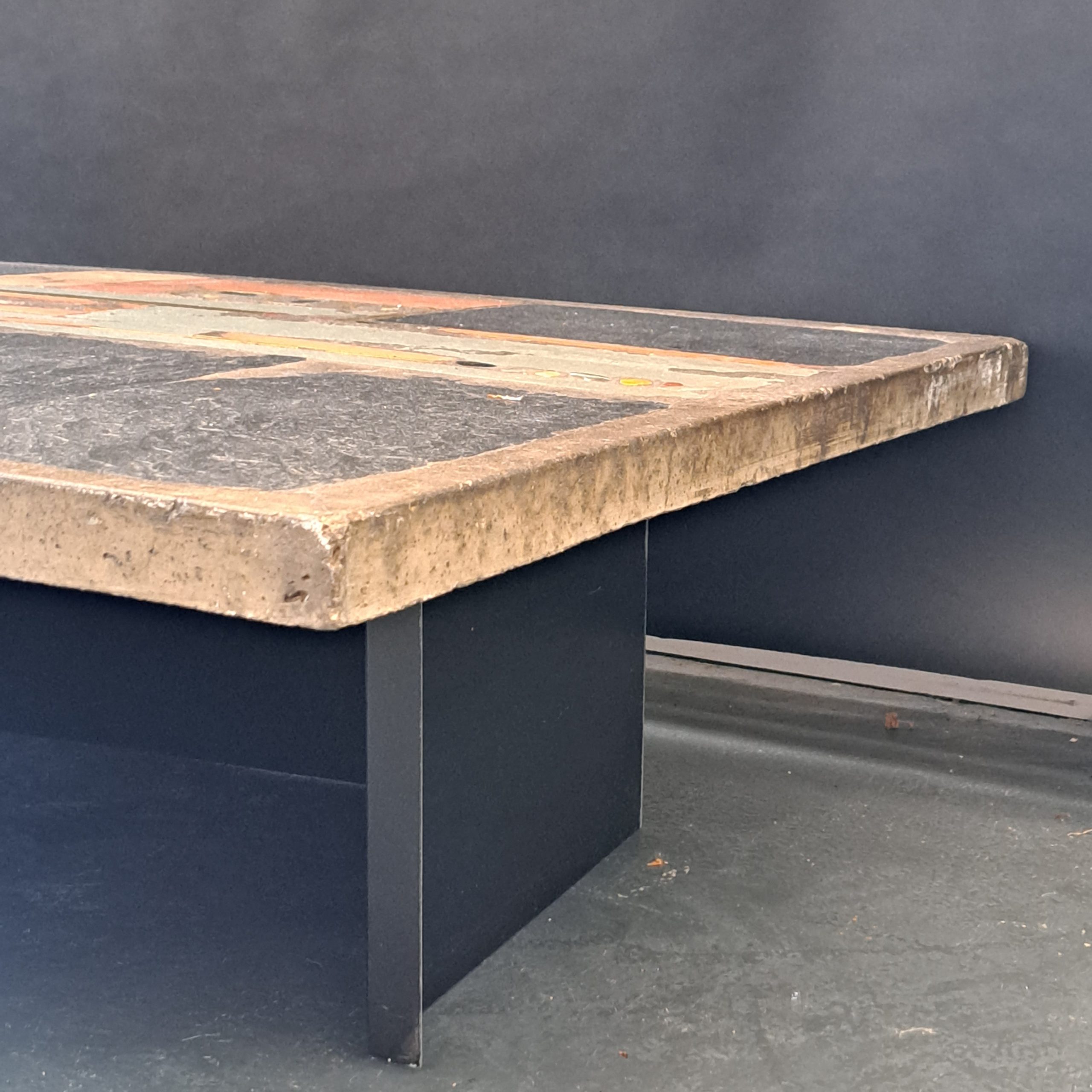 Beautiful ‘one of a kind’ table designed by Dutch sculptor Paul Kingma. Kingma started making tables in the late sixties. He used material from all over the world which he collected by himself on his travels. Kingma tried to capture nature and the beauty of aging in his designs. This table is form the early period, signed and dated Kingma 1978, in very good condition, concrete top inlaid with different materials like