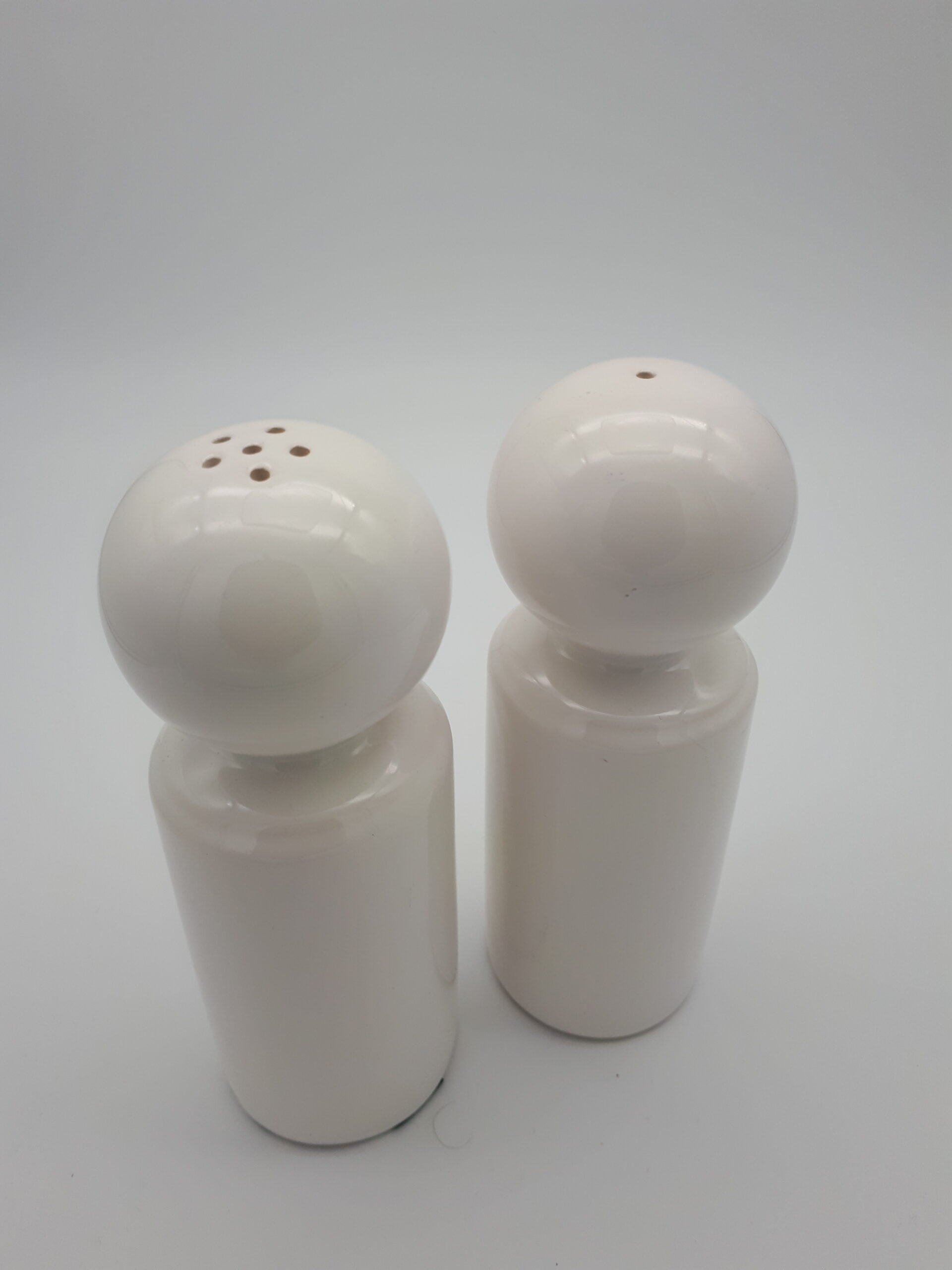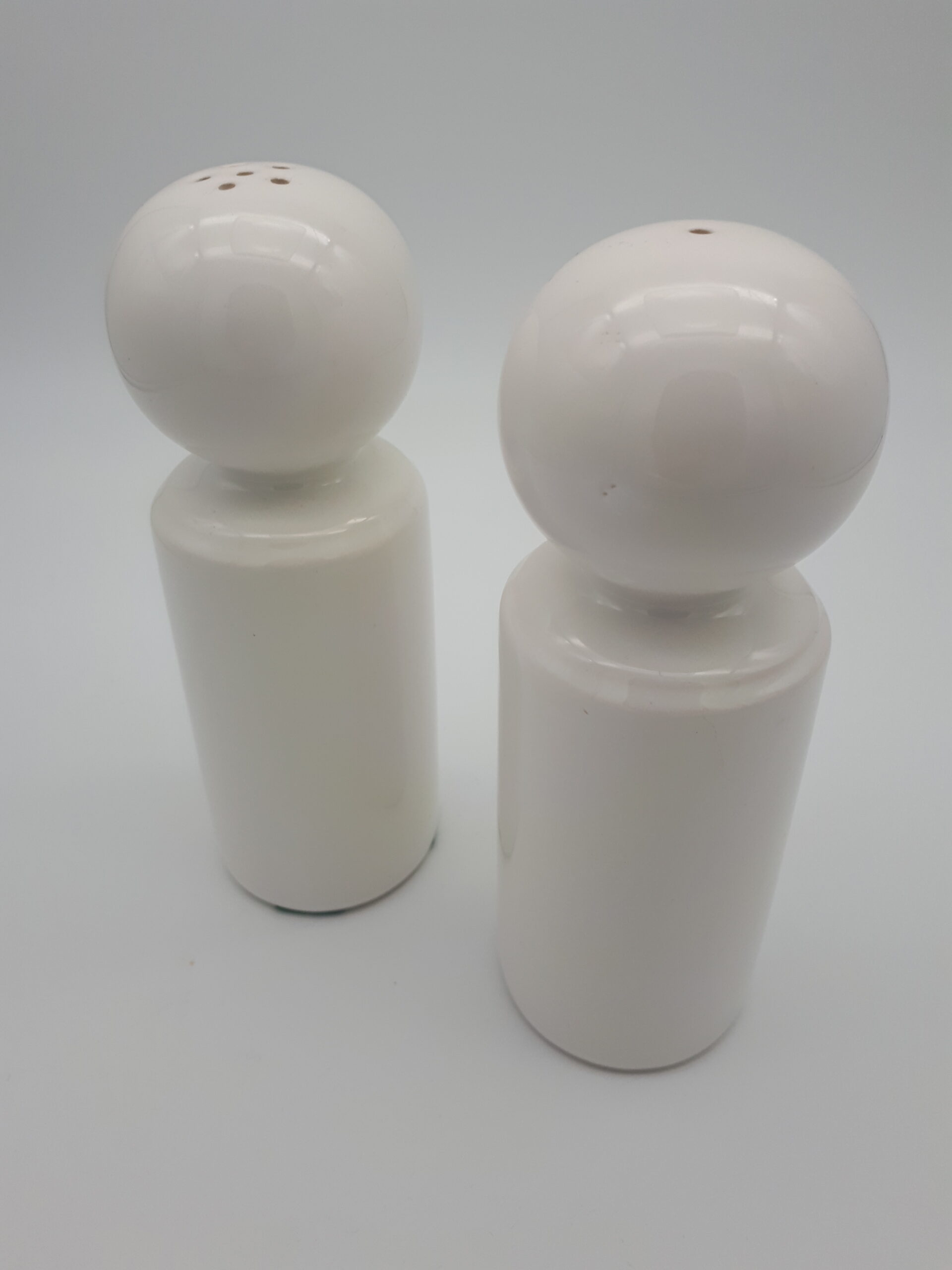 Mooie set peper- en zoutstrooier van de bekende Italiaanse designer Pino Spagnolo, gemerkt ‘italy’en nummer, jaren ’70, keramiek wit geglazuurd, in goede staat, hoogte 17, diameter 6