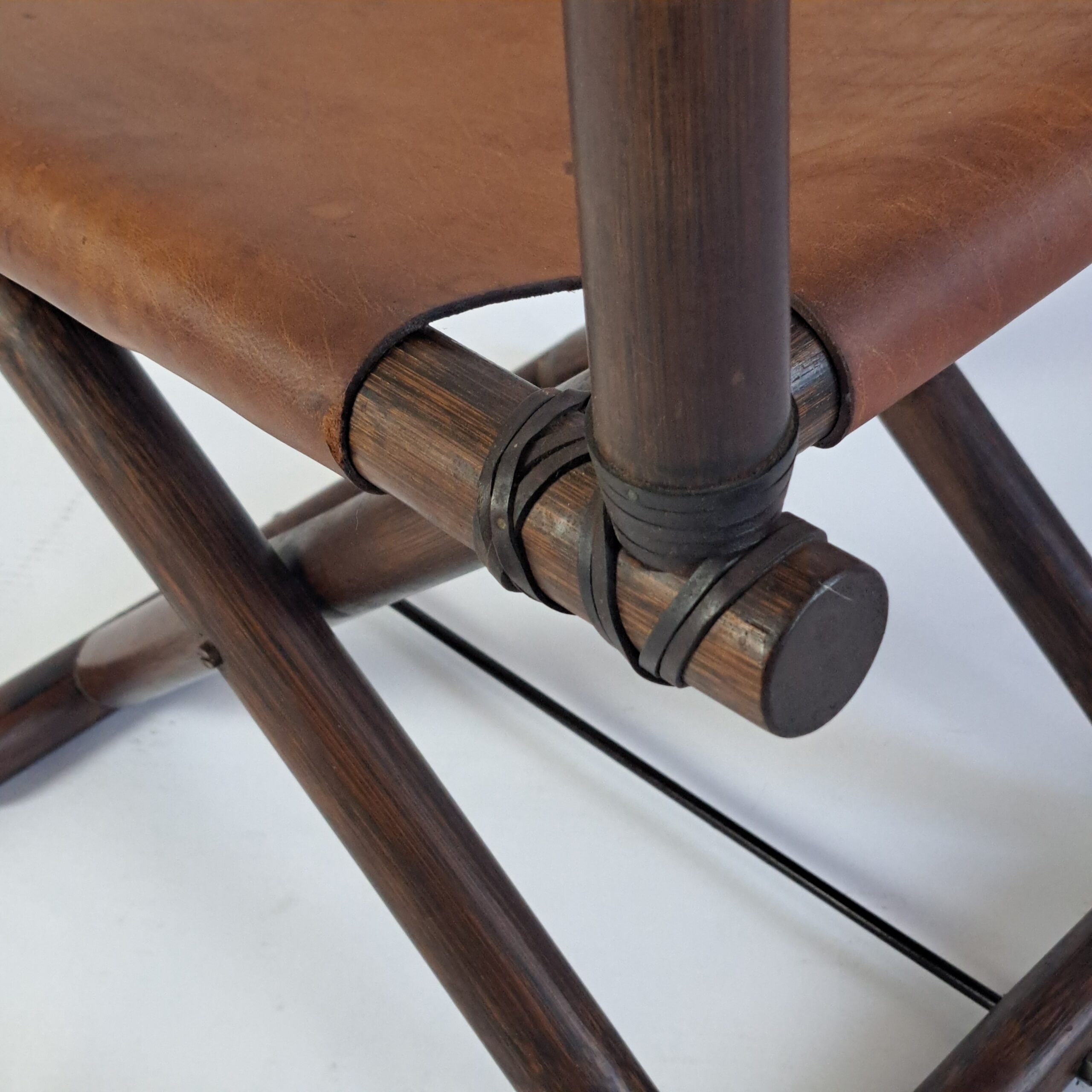 Around 1970 the taste in furniture changed from minimalist and purely functional to more outspoken and colourful objects. Rattan, the material of the 1960s, could not be painted, unless the bark was peeled. This peeled rattan was called manou and could be painted in different colours to adjust to a more romantic style of interior design. The famous Dutch factory of Rohé was very early in introducing this new material. This director’s chair, model ‘Viviana’ is a very beautiful and rare exemple of this development in Dutch and international furniture design. In very good condition, leather, manou rattan and steel, 1969-1970, h. 85, w. 60, d. 63, seat h. 43, seat d. 45