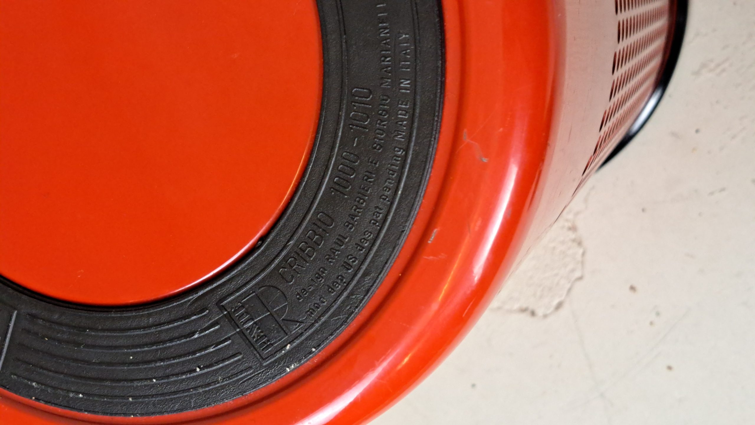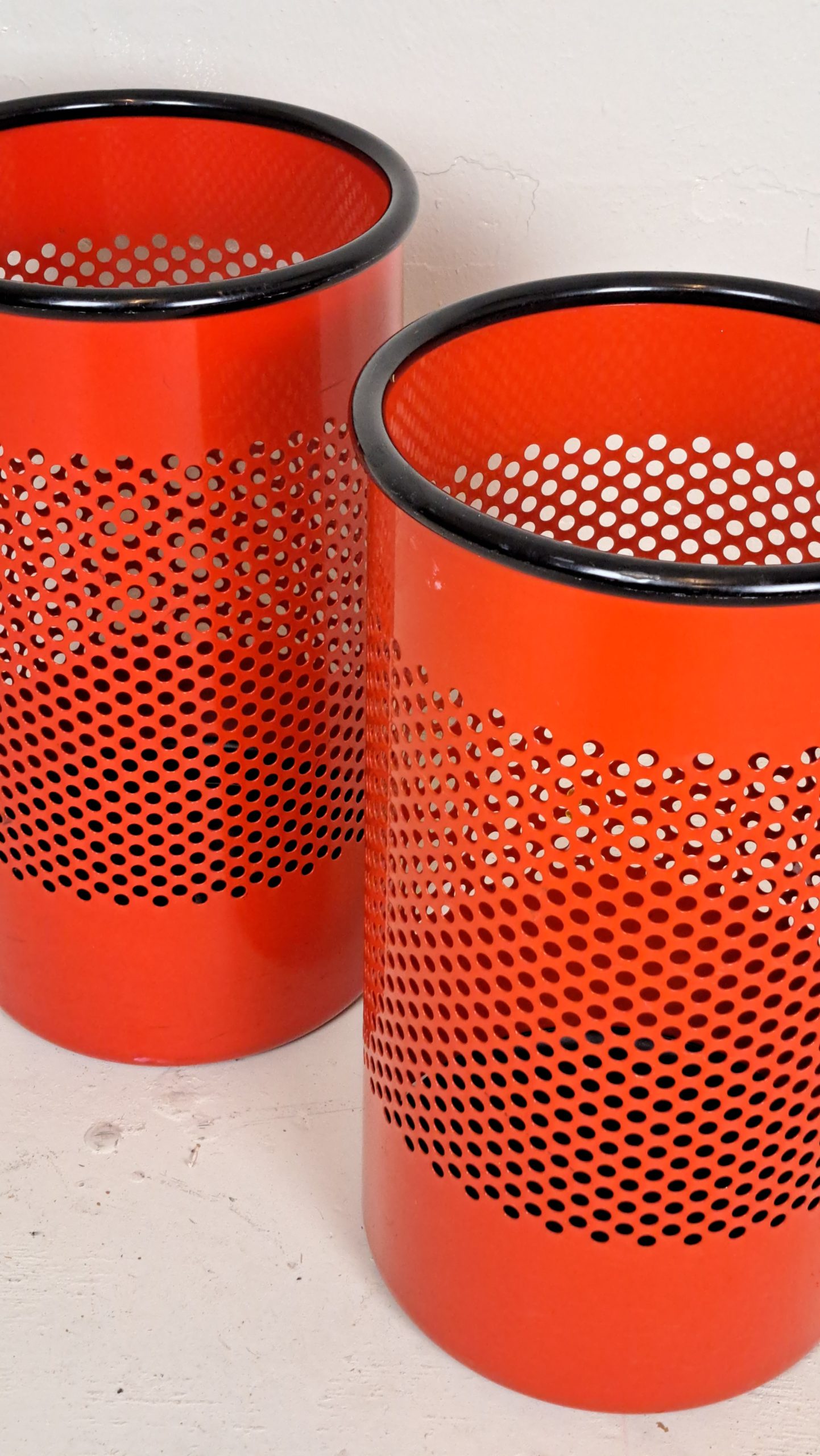A set of two beautiful Italian design items from the early eighties: a paper bin and an umbrella stand, produced out of a single plate of perforated steel, designed for Rexite by Raul Barbieri and Giorgio Marianelli, with only small signs of use, in very good condition, heigth 45, diameter 26.