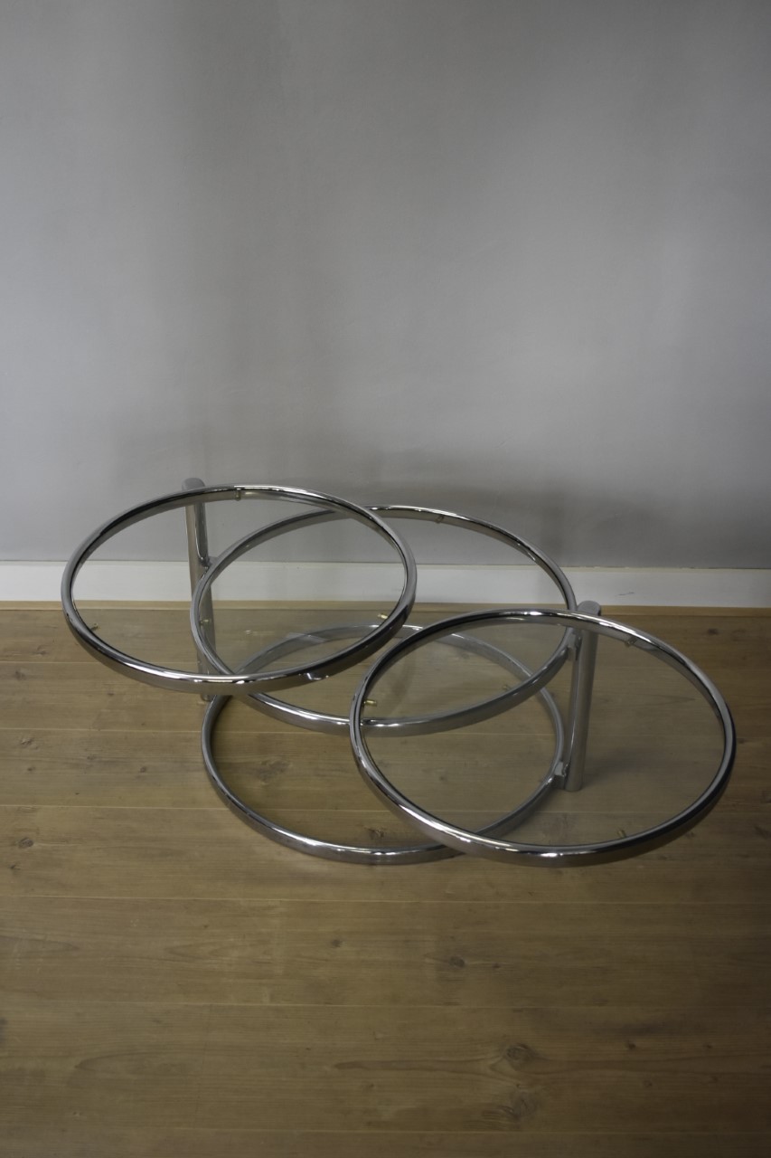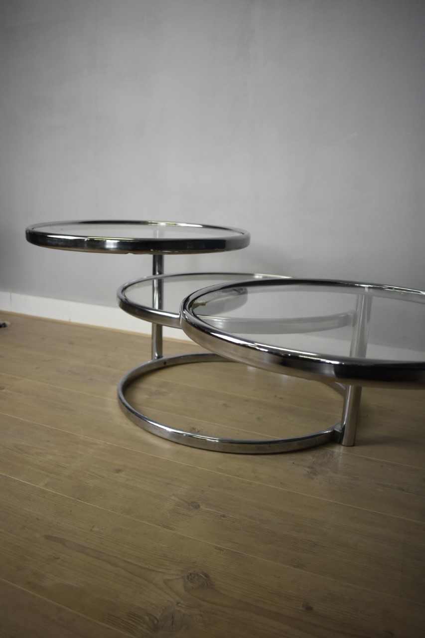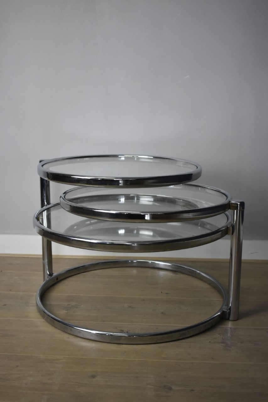 In goed en gave staat. Chroom metaal en glas, draaibaar, drie niveaus in doorsnee 60, 50 en 50 cm.
