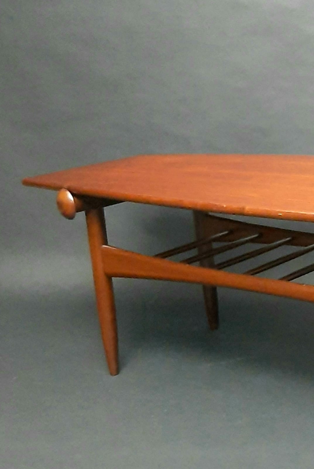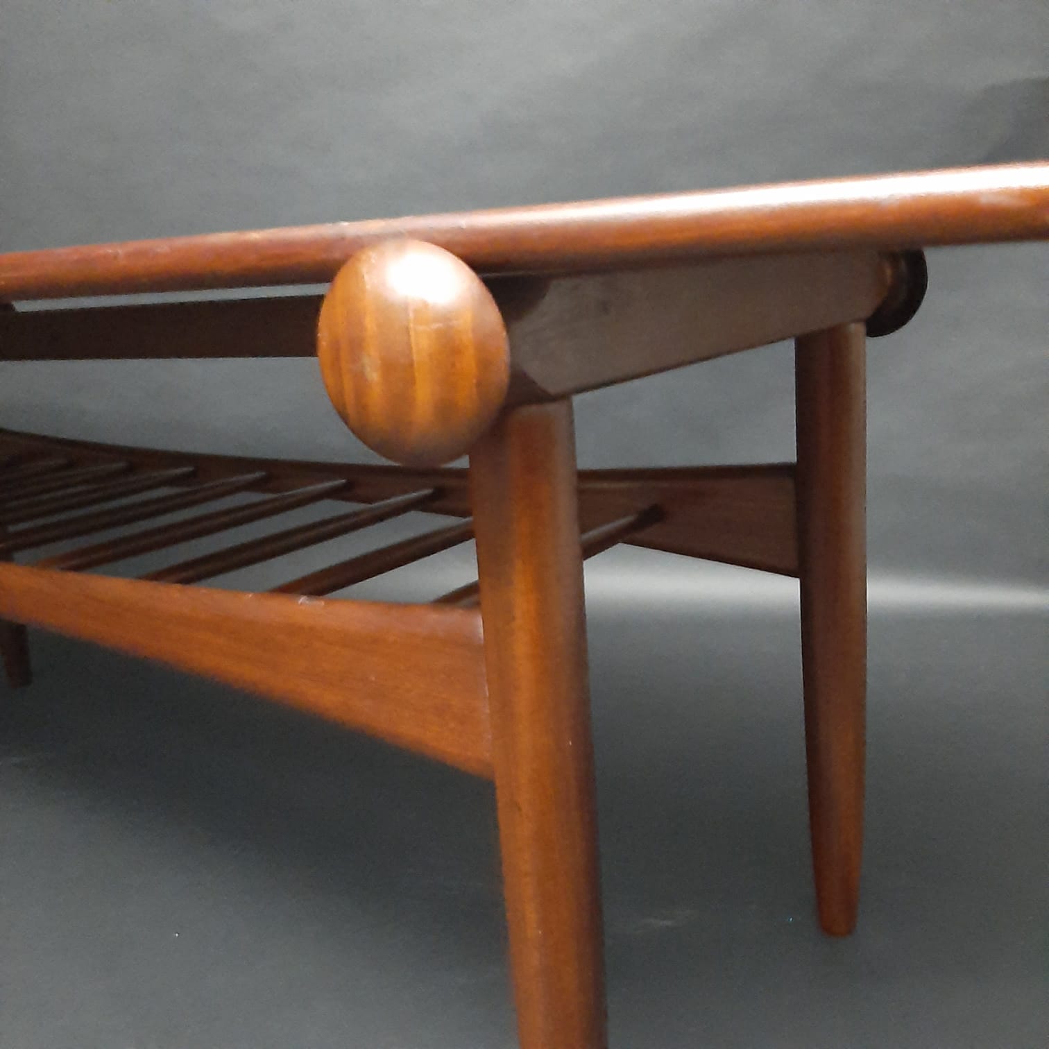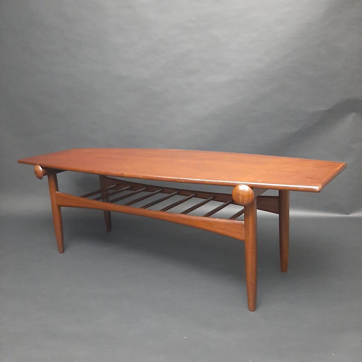 Bijzondere salontafel met omkeerbaar, dubbelzijdig teak/formica bovenblad. Erg verfijnd is het houten leesrek en de knoppen die het blad op zijn plaats houden. Ontwerper en fabrikant heb ik (nog) niet kunnen vinden. In goede staat met lichte gebruikssporen, 150×53, hoogte 48.