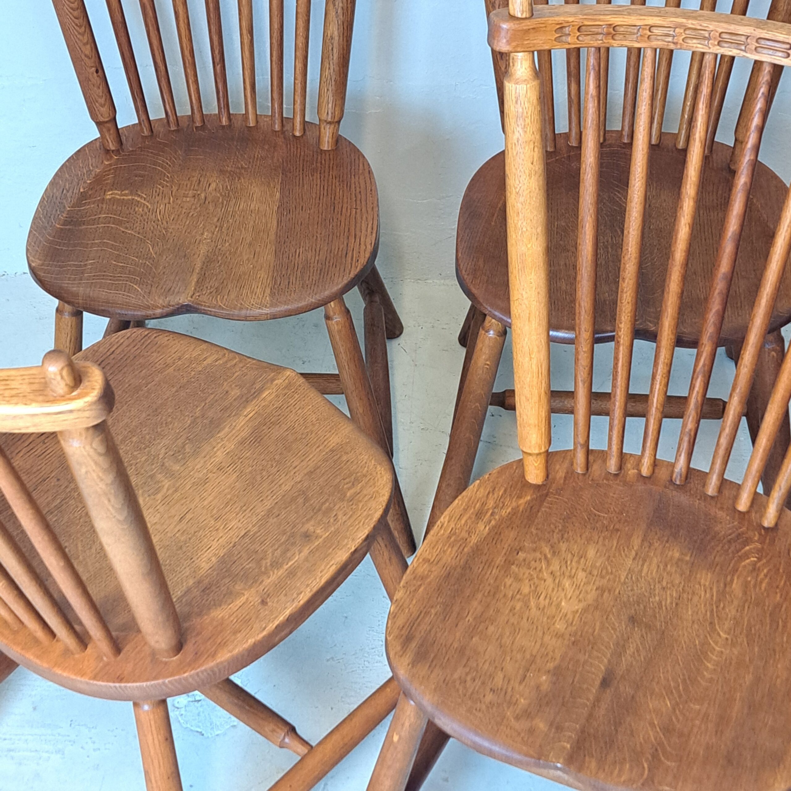 Set of 4 solid oak dining chairs by the Dutch factory De Ster Gelderland 1950s, in very good condition with a nice patina and nice carved details in the back, h. 98, w. 48, d. 50, seat h. 47, seat d. 41