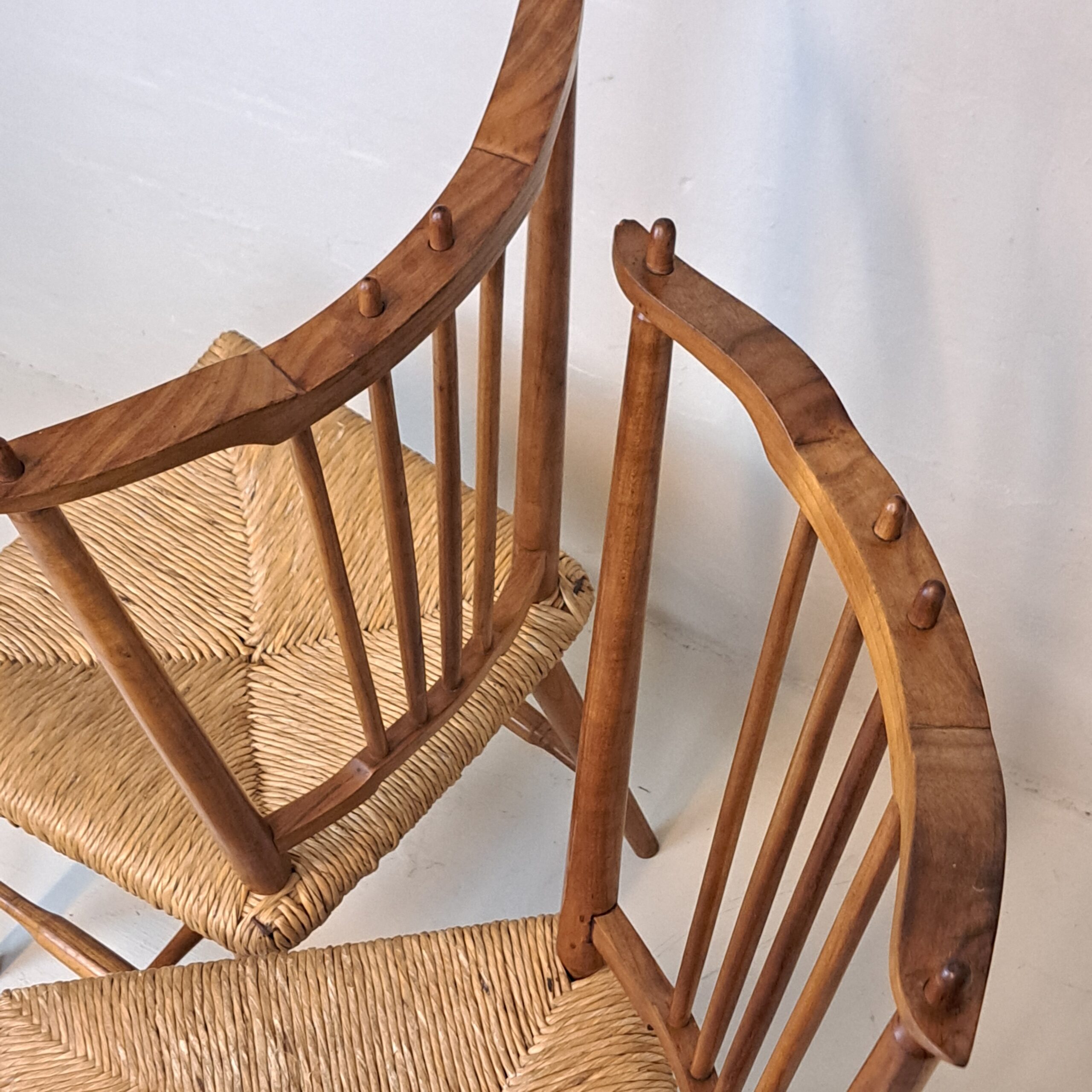 Two very elegant chairs from the 1940s, early 1950s in wood and rush, in very good condition, h. 97, w. 49, d. 54, seat h. 44, seat d. 43