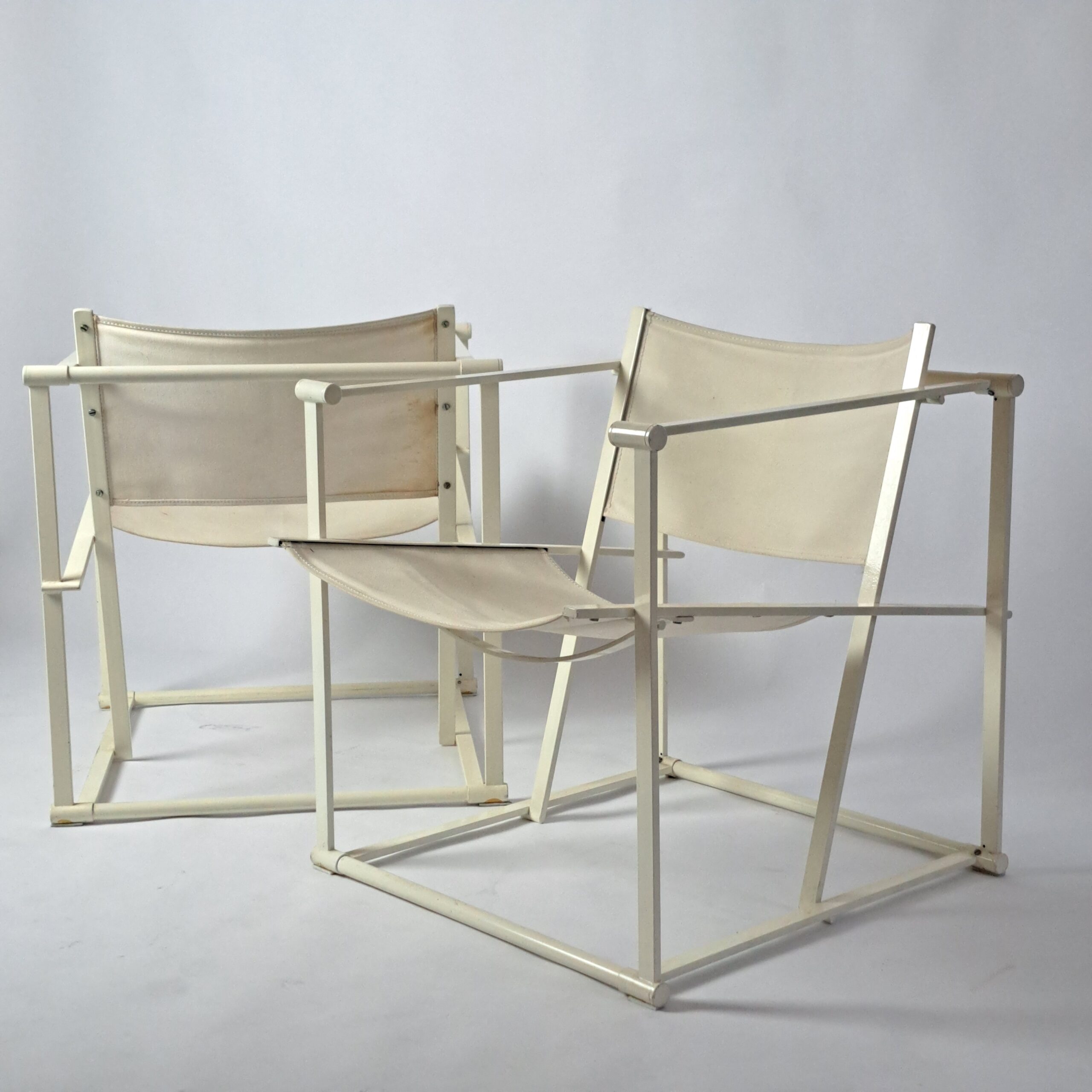 Early edition 1980s of the iconic Dutch design cube chair, model FM60, by Radboud van Beekum for Pastoe. Both chairs in very good condition, canvas and white lacquered metal, h. 68, w. 61, d. 68, set h. 41.