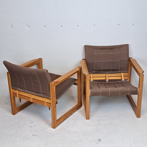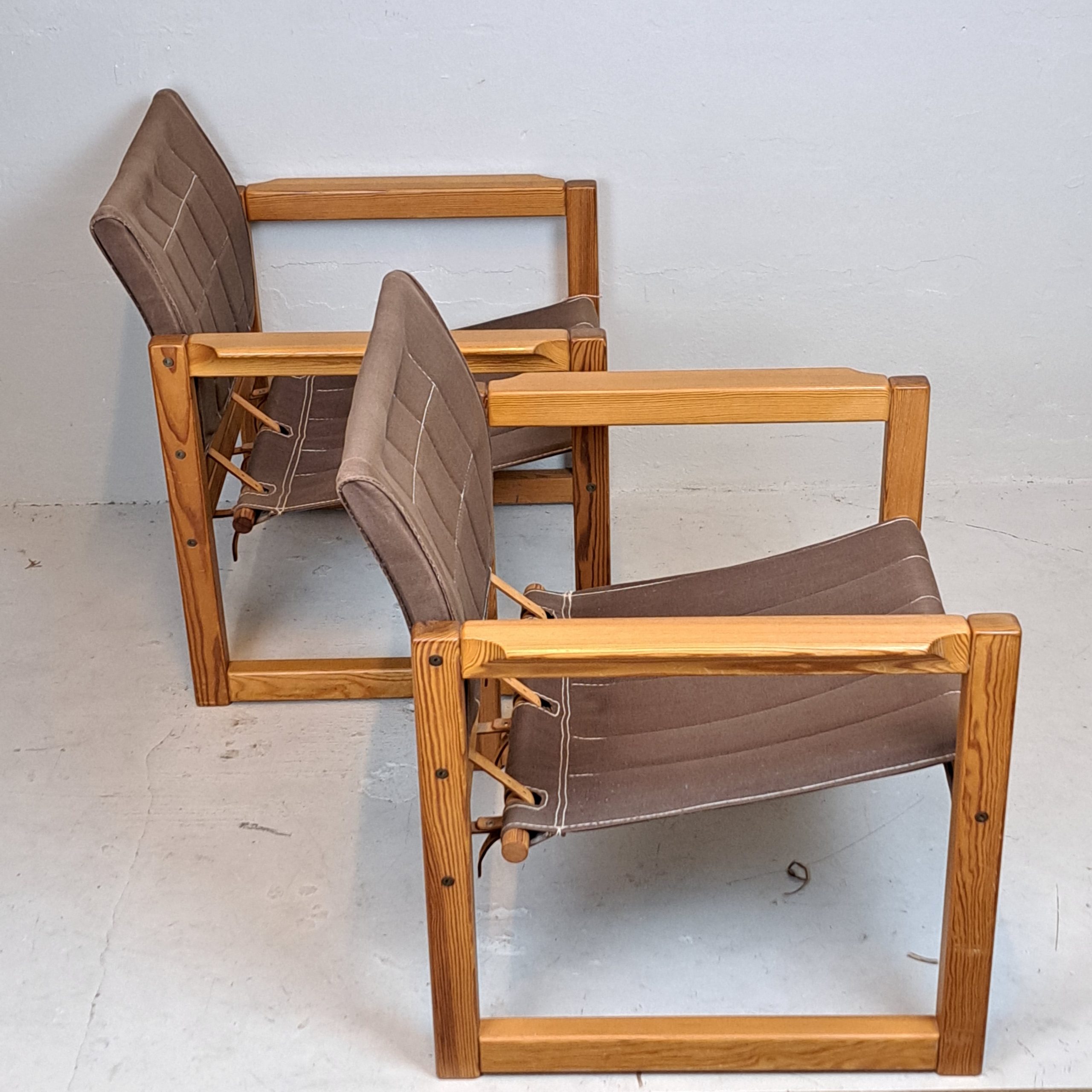 Set of two safari chairs by J.G. Steenkamer for the Dutch company Creafort, founded in 1922. There has been a dispute between Creafort and Ikea about the copyright of the chair. The famous Diana chair by Mobring for Ikea is almost identical tot the Dutch chair. In very good condition, pinewood, leather and canvas, h. 68, w. 67, d. 57 seat h. 37.