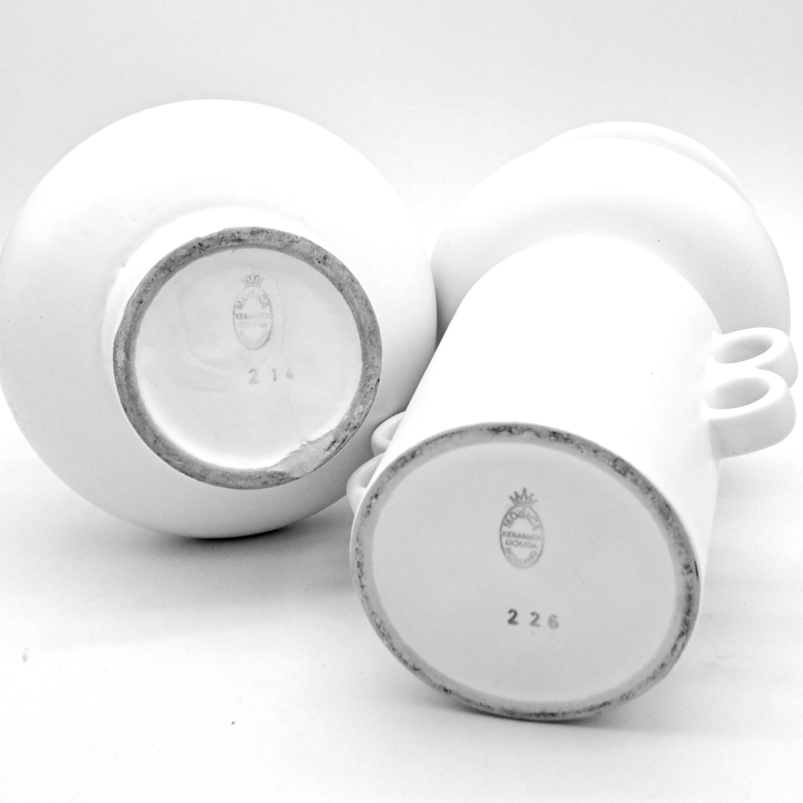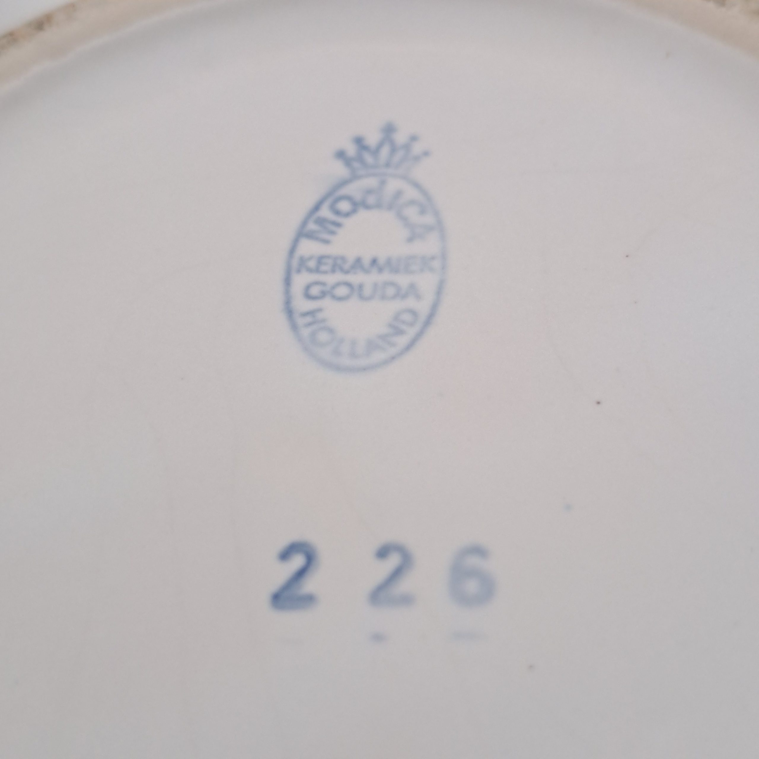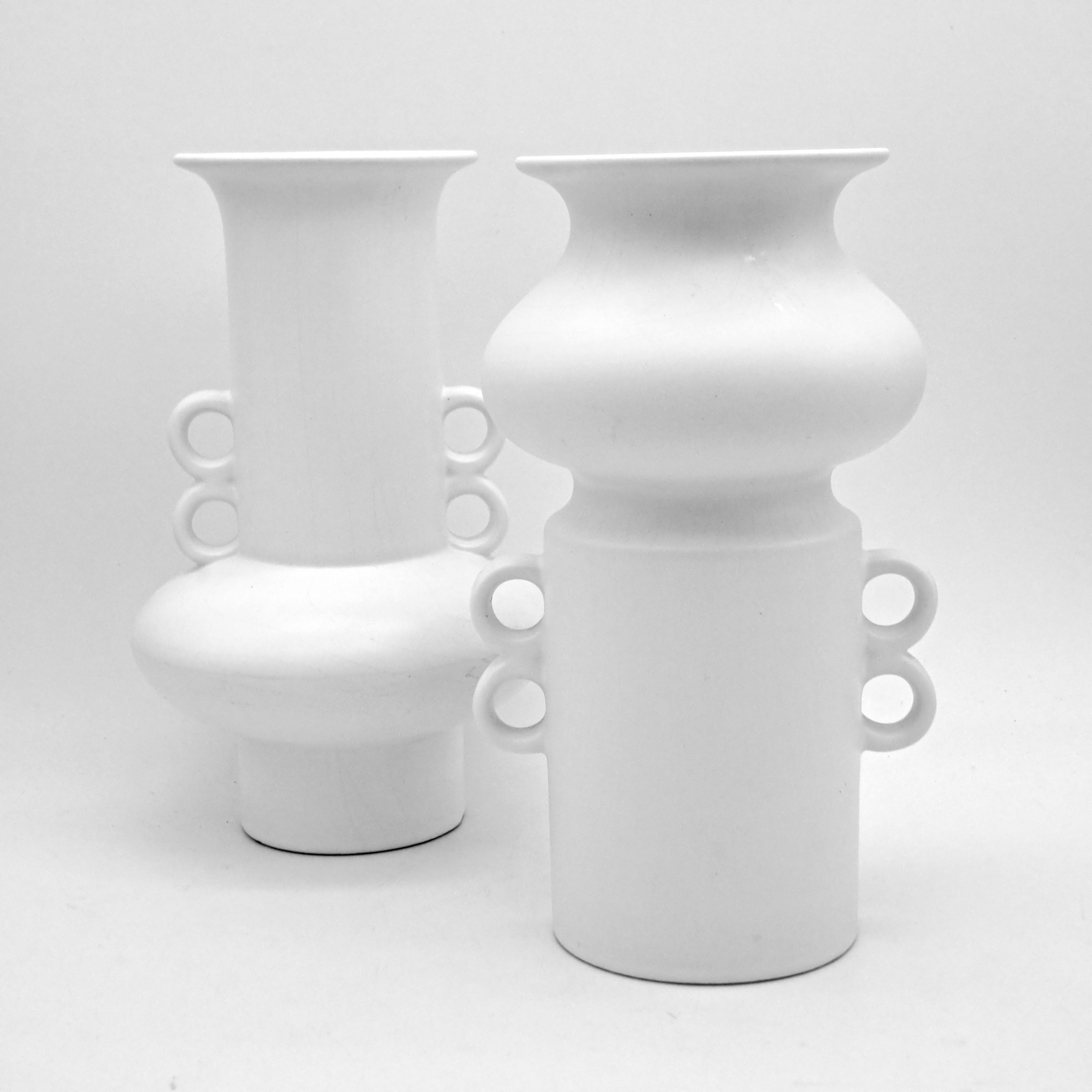 Gouda was the center of Dutch ceramics in the 20th century. Modica was one of the many factories. Set of two rare ceramic ‘plateel’ vases with a white glaze, in good condition, one vase with a chip in the bottomring, not visible when standing, h. 25, diamater 15