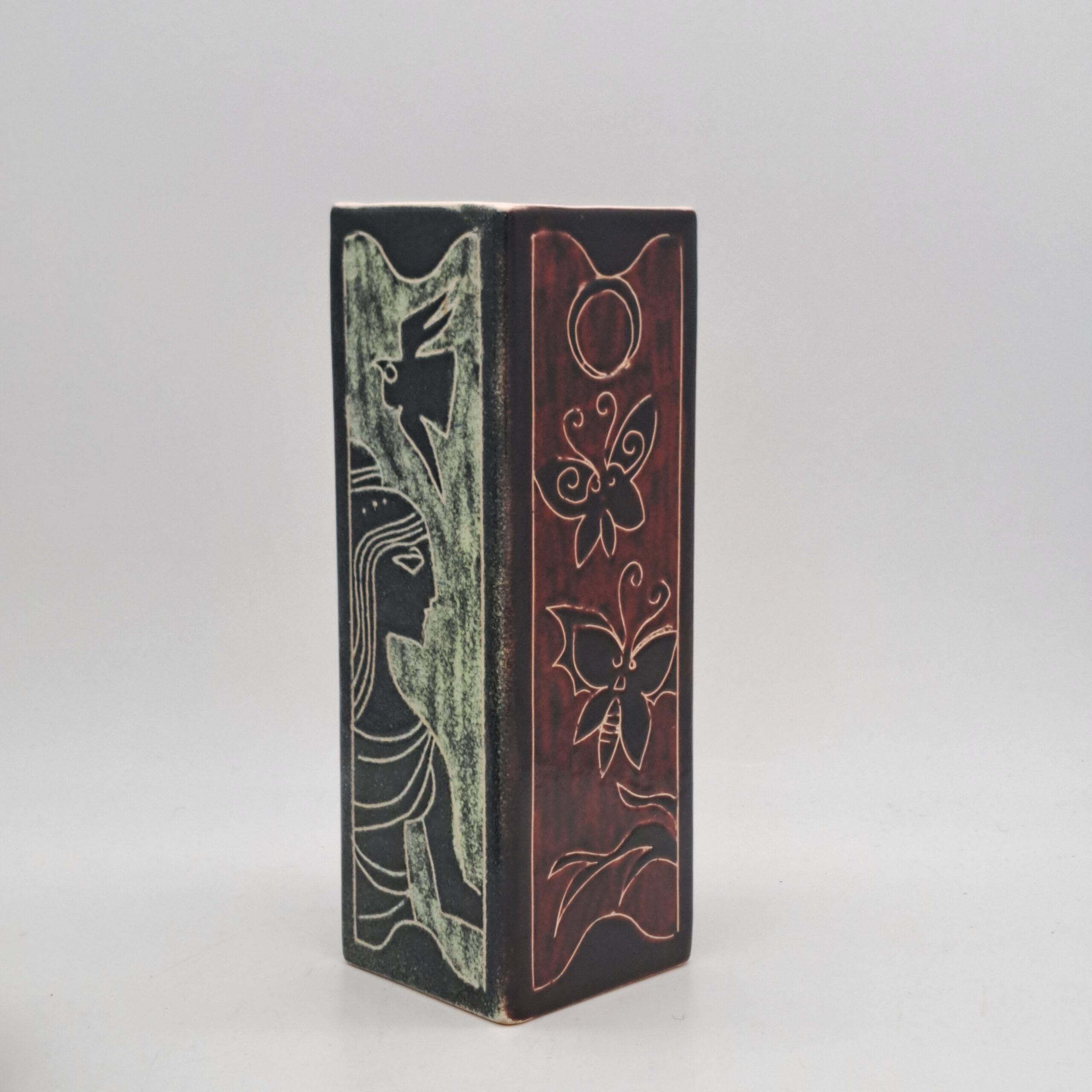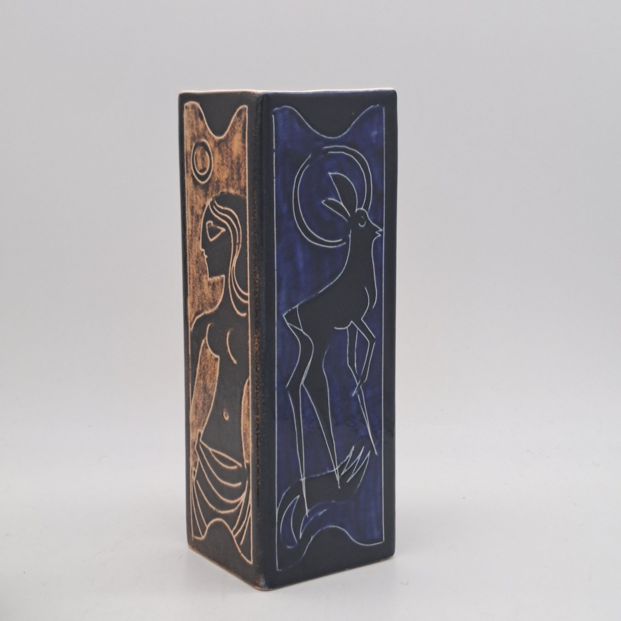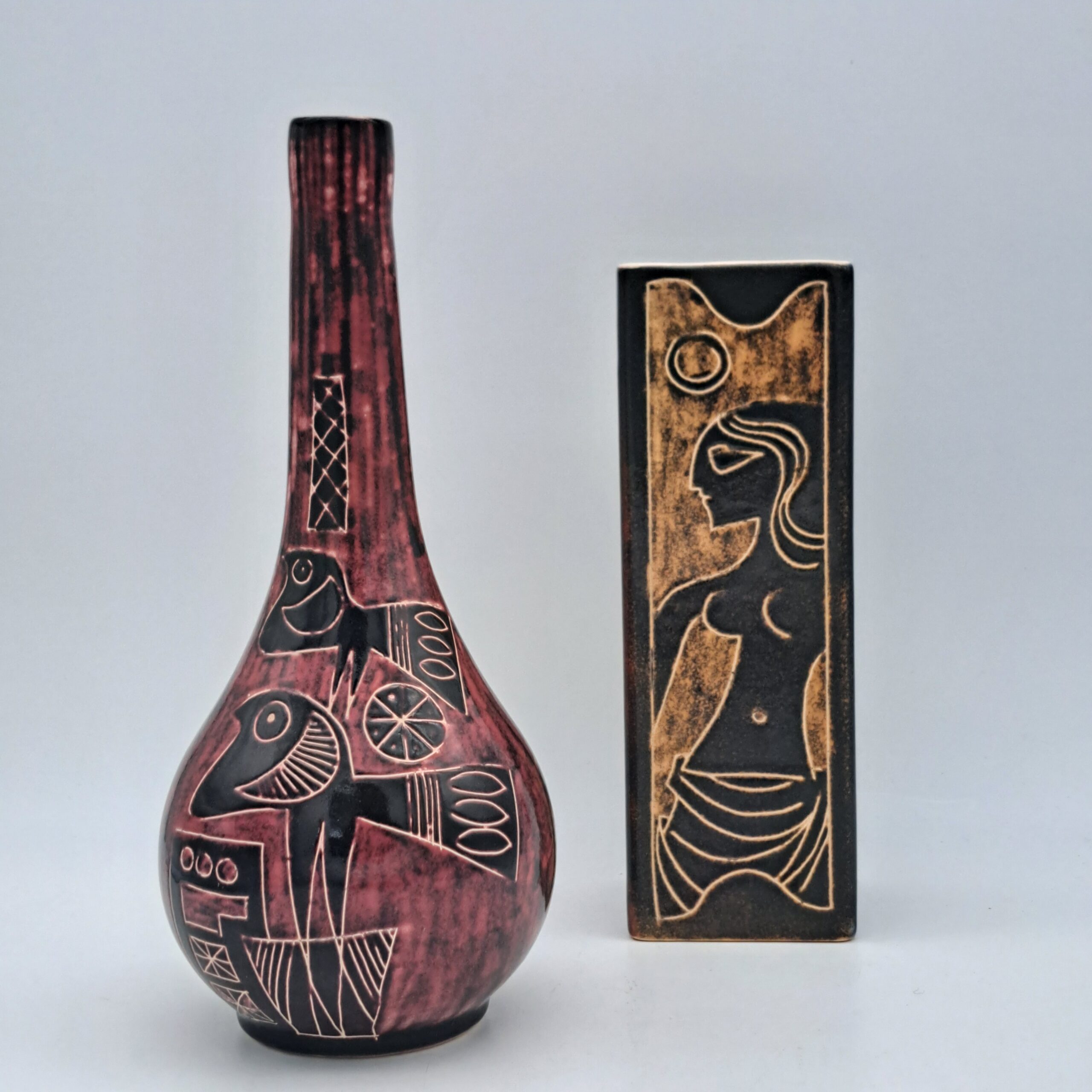 Two beautiful vasus by the Dutch ceramist Hans Custers who worked in his studio De Gats in Valkenburg from 1954 to 1983; well-known for his sgraffito decorationtechnique in beautiful Cobra-like patterns 1960s. In very good condition, 25,5×10,5 and 20×7,5