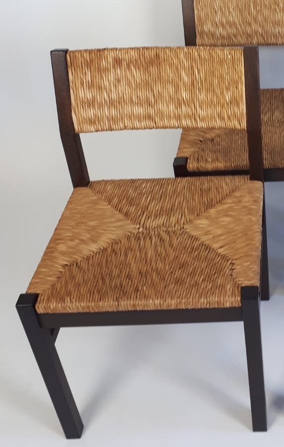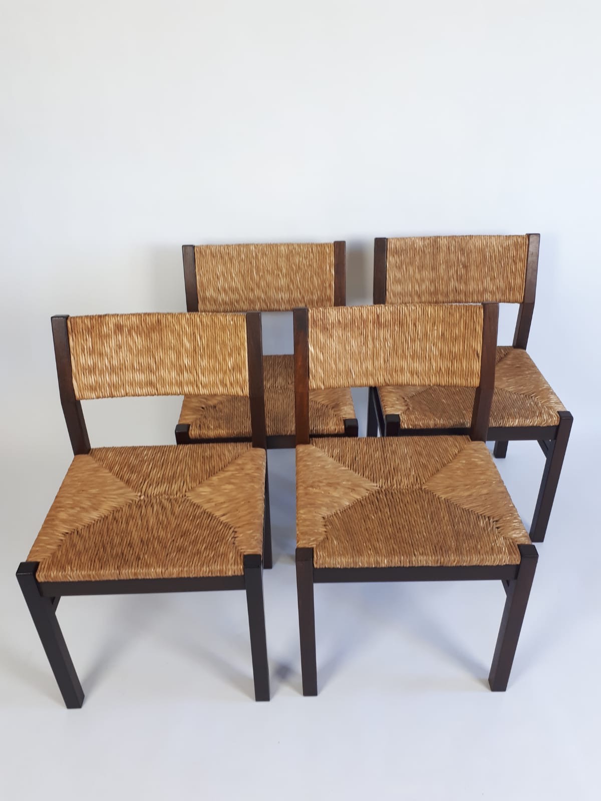 Set van 4 eetkamerstoelen van Cees Braakman voor Pastoe, met aan de onderzijde het etiket van de stichting Goed Wonen.