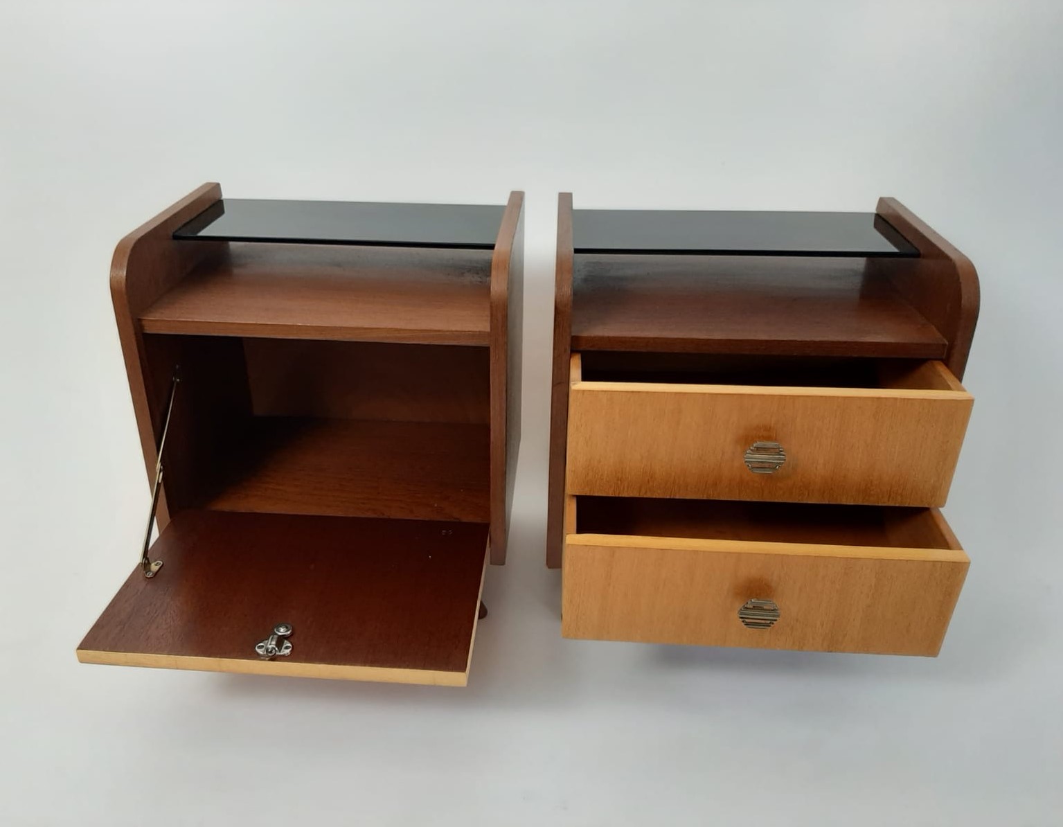 Vintage nachtkastjes met extra aflegruimte door het glasplankje.