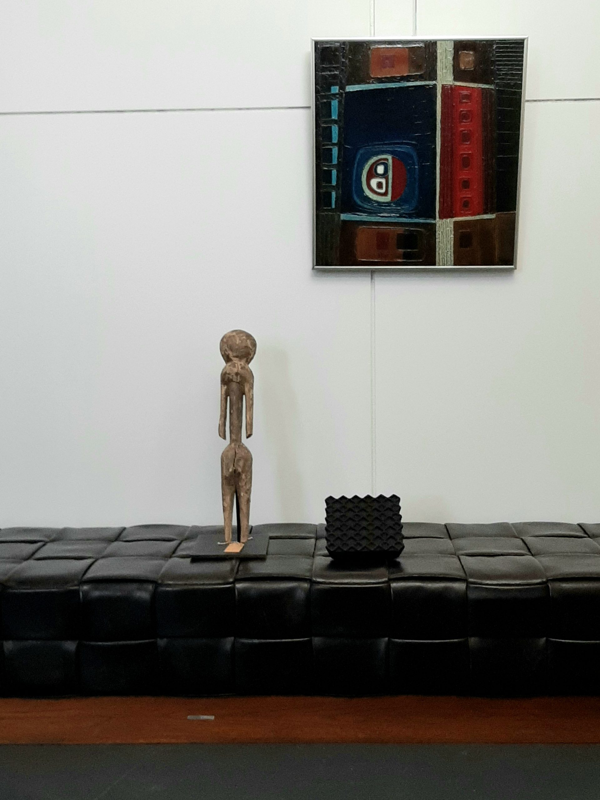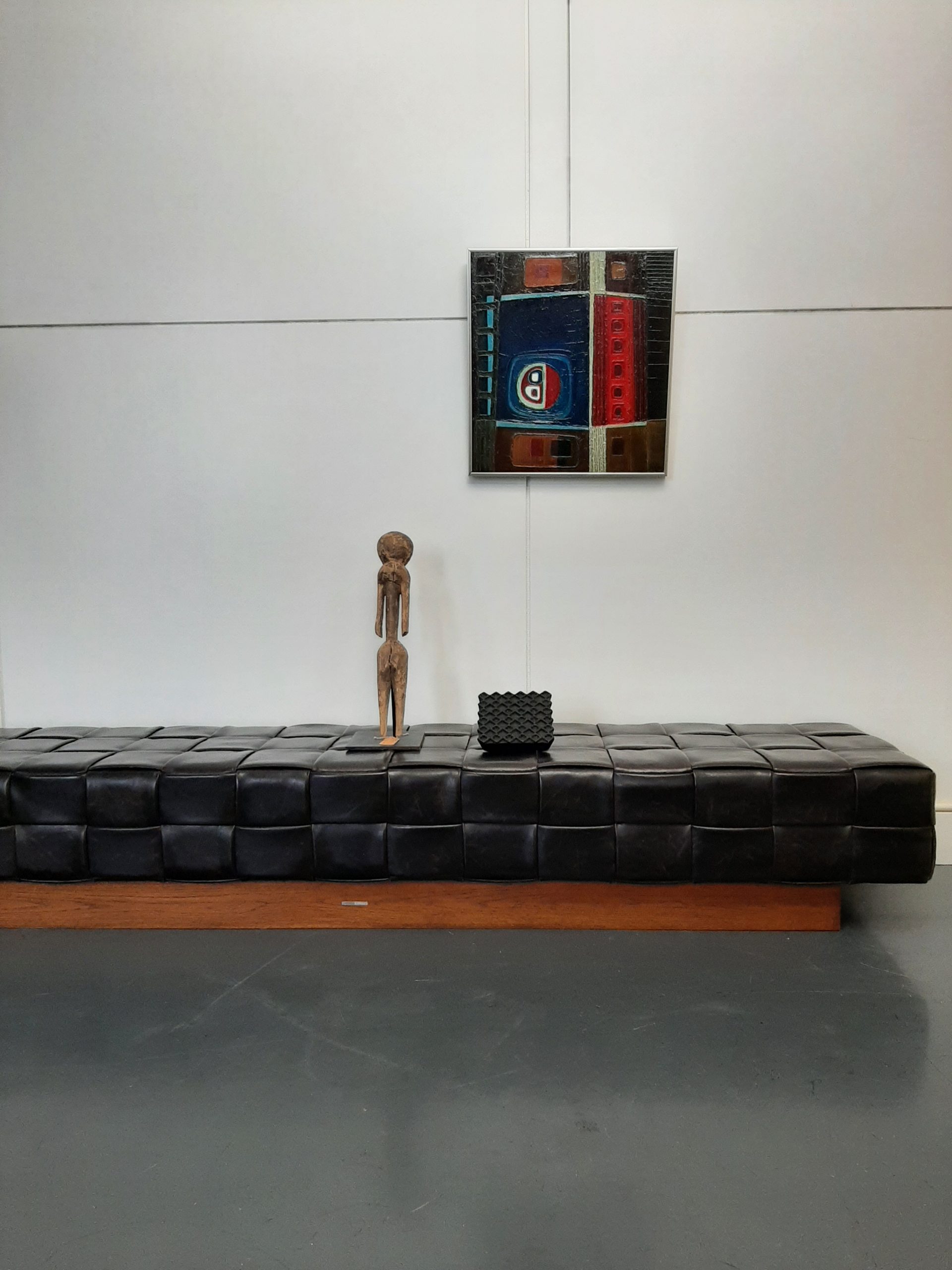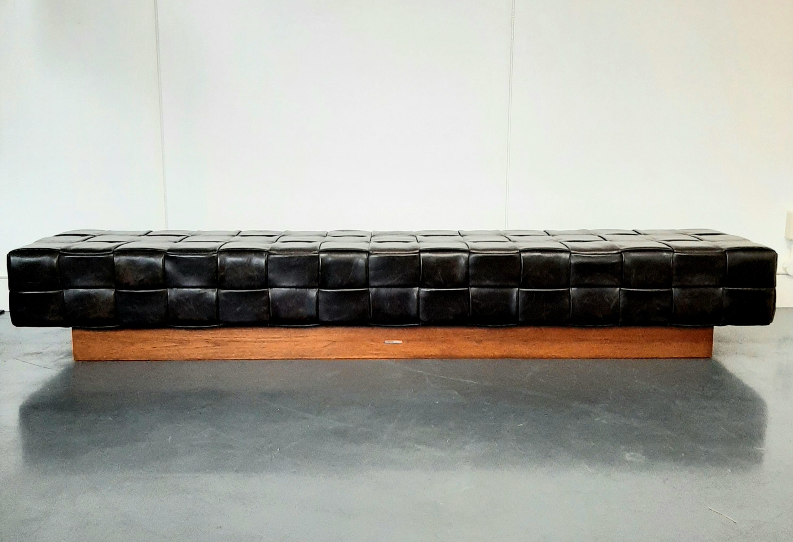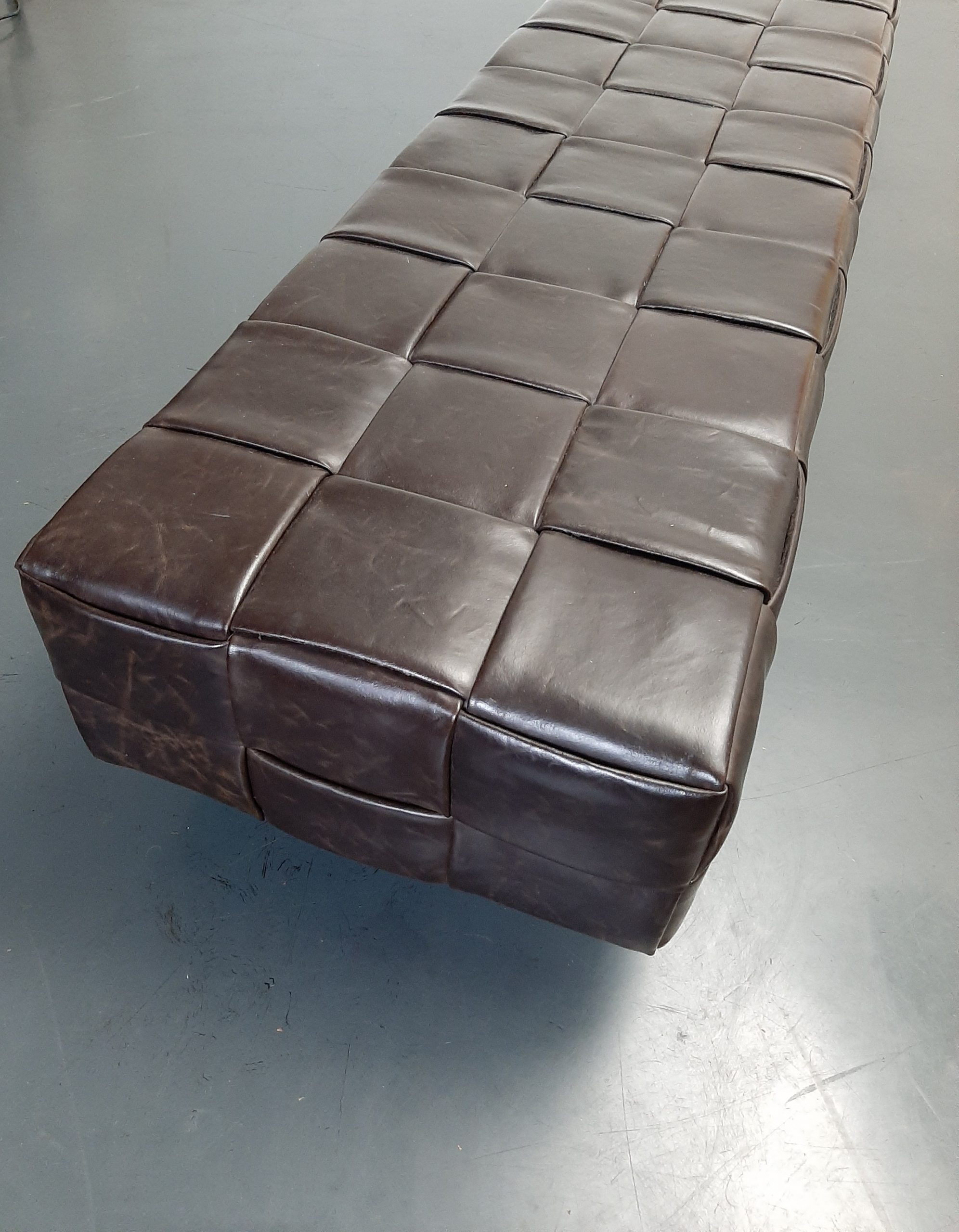 Very stylish bench of woven artificial leather on a wooden base. The backside is not in leather so the bench can be placed against the wall. In good condition, with metal mark ‘elite’, length 214, depth 44, height 33.
