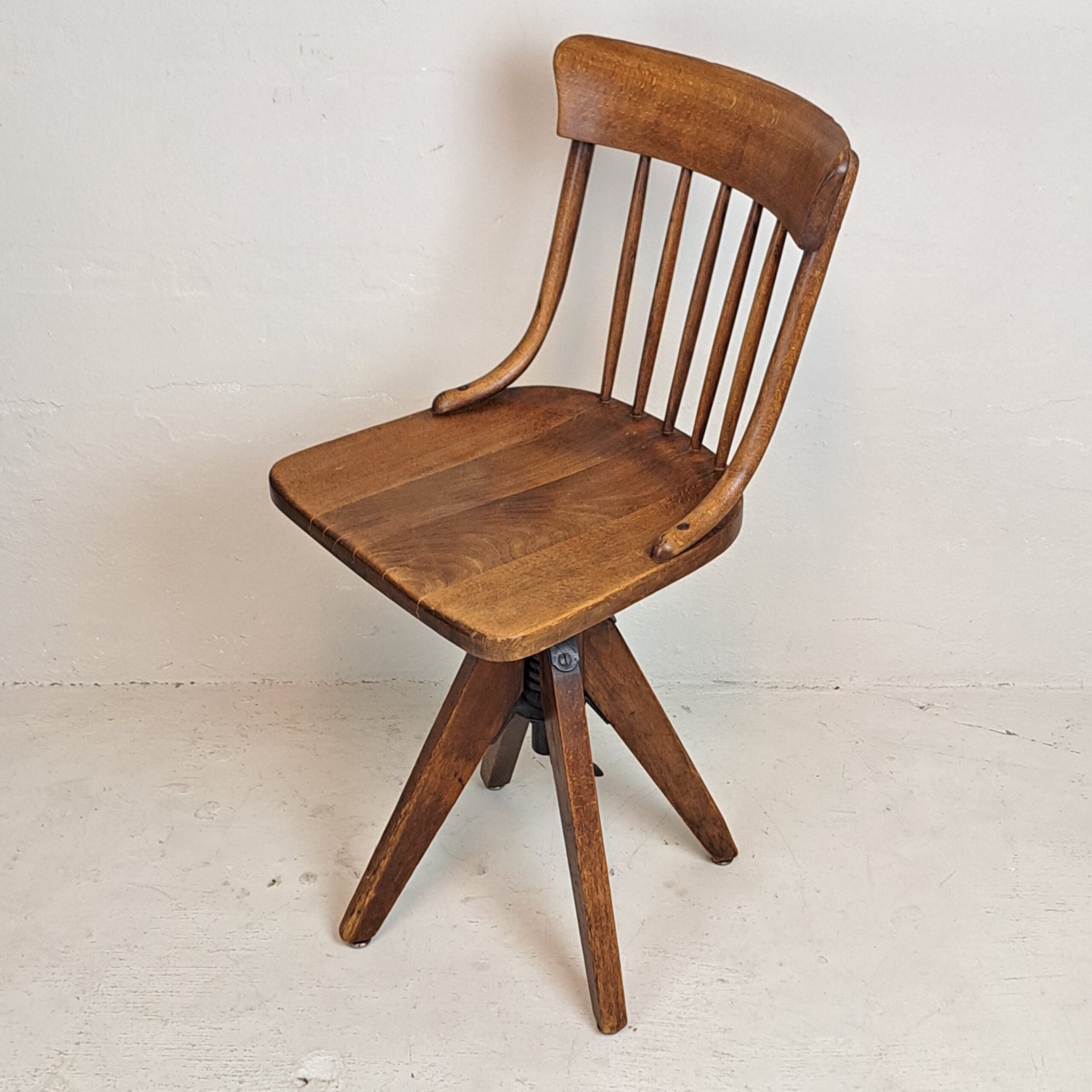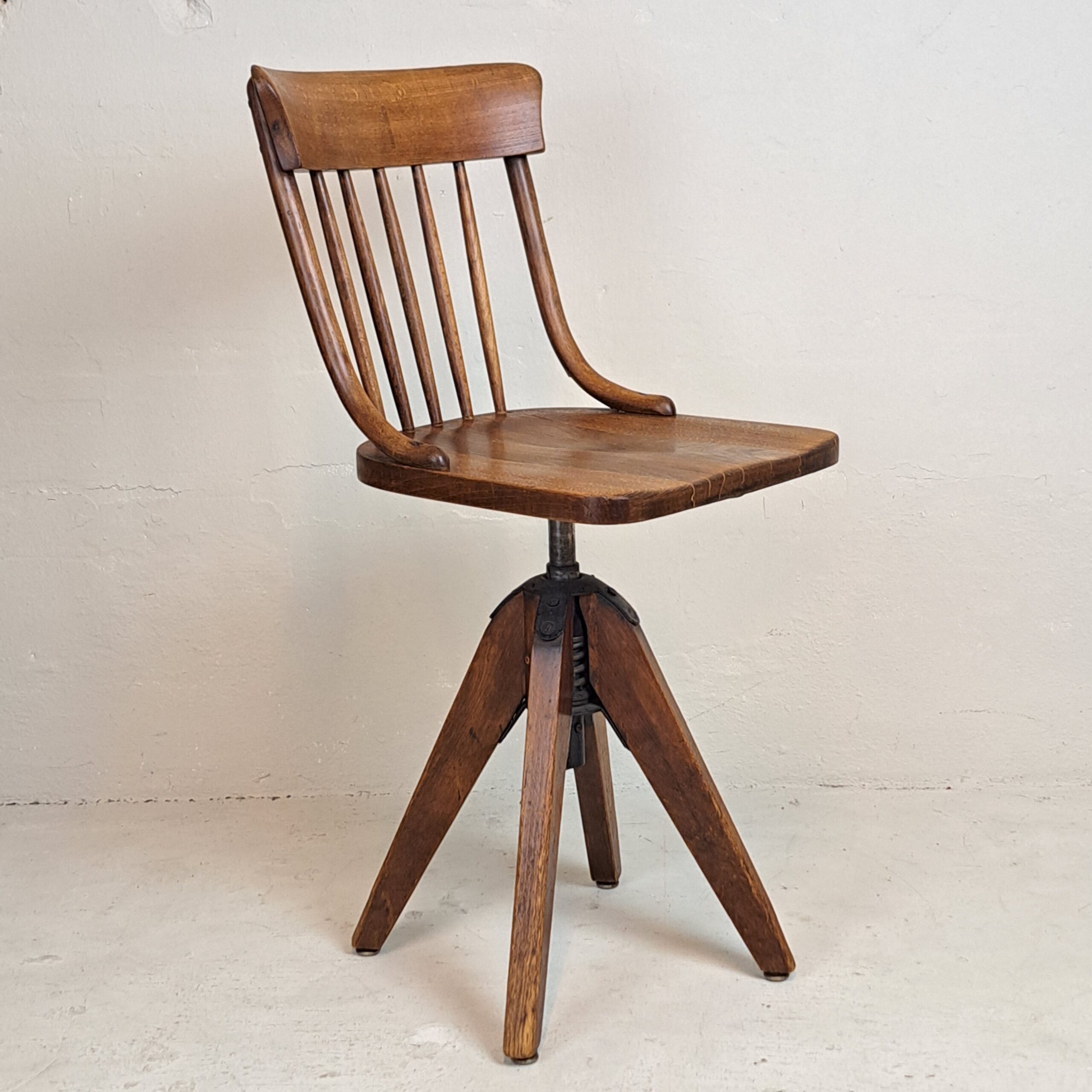 Nice and handsome swivel deskchair from the first half of the 20th century, adjustable in heigth, in good condition (one of the wooden elements to hide the spring is missing, see photo) and a beautiful patina, h. 80-90, w. 39, d. 45