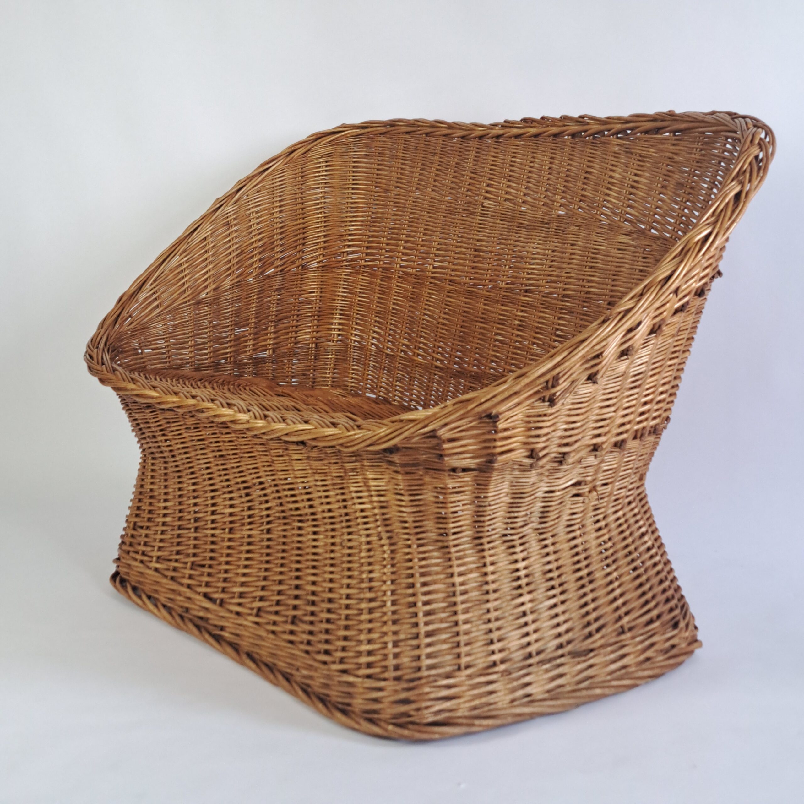 In the 1950s and 1960s the rattan furniture industry in the Netherlands was flourishing, due to the need for functional and affordable furniture in the post-war period. This all-rattan bench was introduced in 1958. The chair version, called the ‘hondenmand’ (dog basket), was very popular. Much more rare is this twoseater, in very good condition, beautiful patina, h. 74, w. 120, d. 65, seat h. 38, seat d. 52.