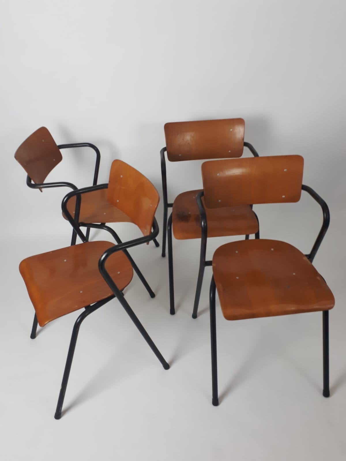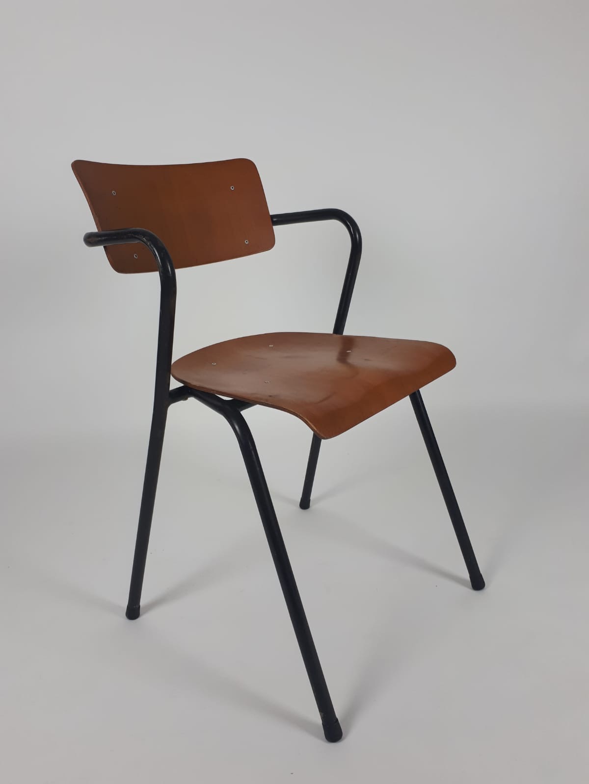 In goede staat, plywood en zwartgelakt metaal, rughoogte 81, zitvlak 40×40 en zithoogte 44.