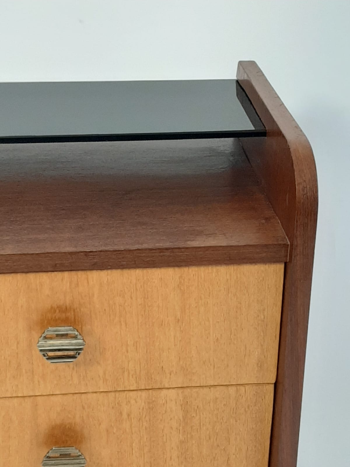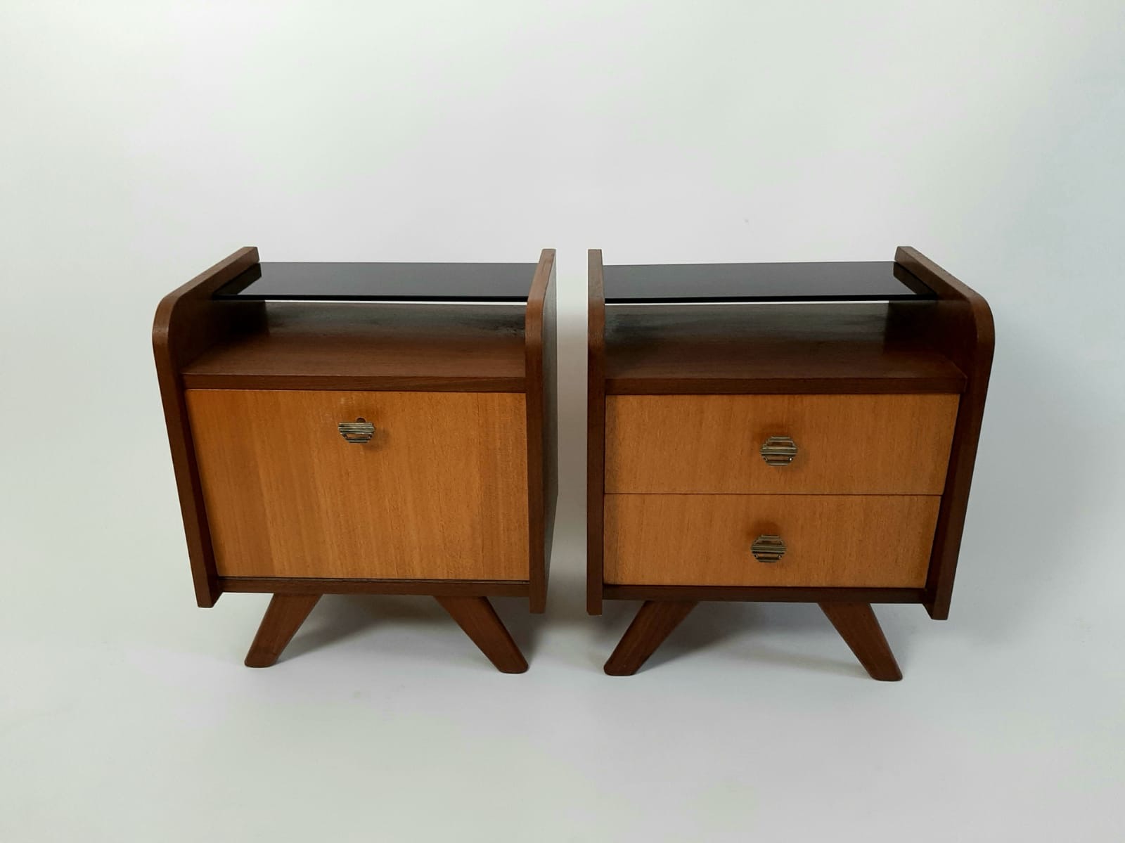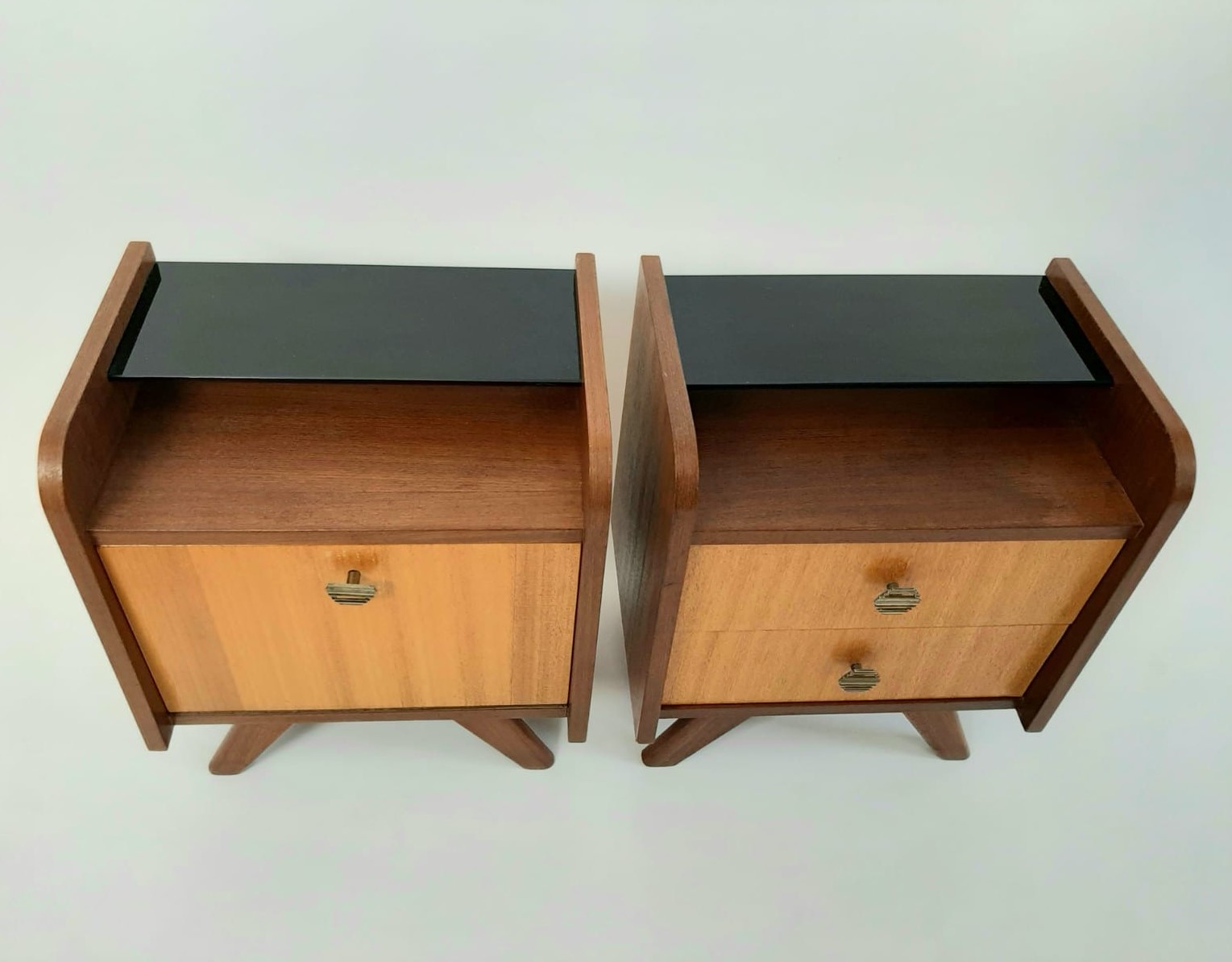 Vintage nachtkastjes met extra aflegruimte door het glasplankje.
