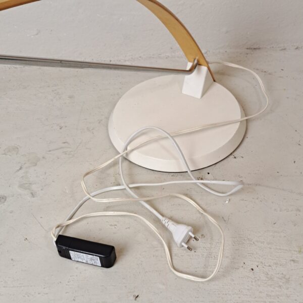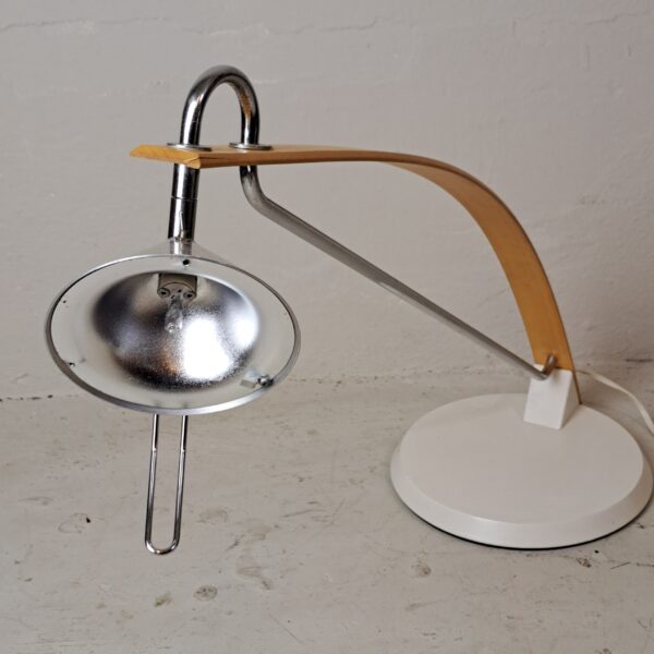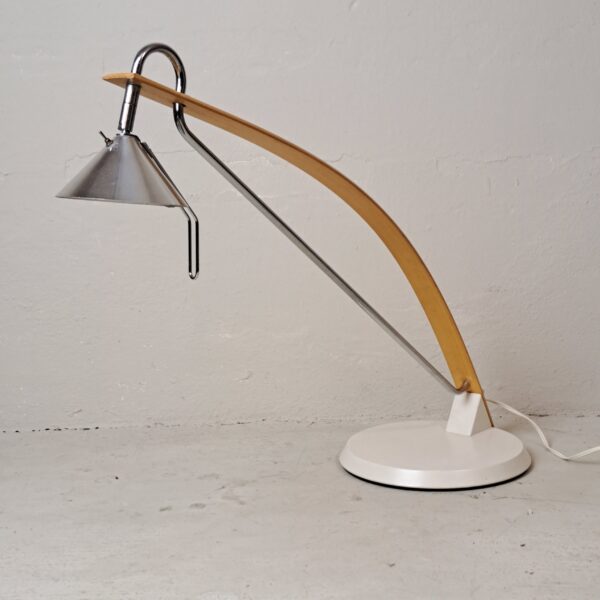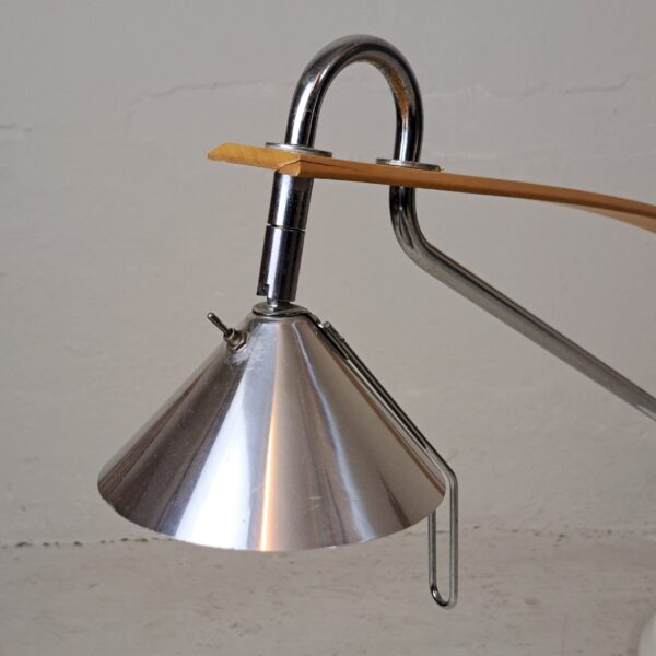 Tord Bjorklund is one of the most important Ikea designers of the 20th century, well-known for his Skye lounge chair from the eighties. In the 1990s he designed the Prolog lighting series, a floorlamp and this desk lamp model A9405. In very good condition, beech wood and chromed metal, halogene light, h. 48, length 79, diameter base 23, diameter shade 12