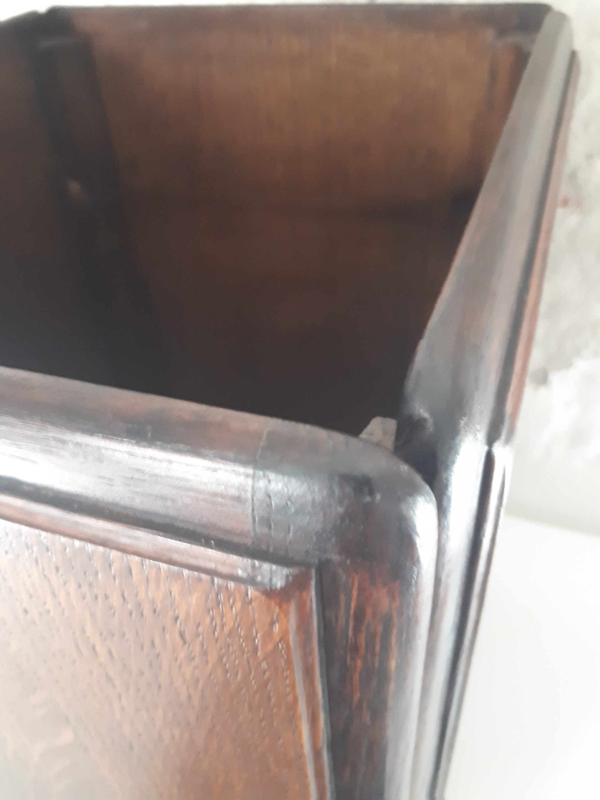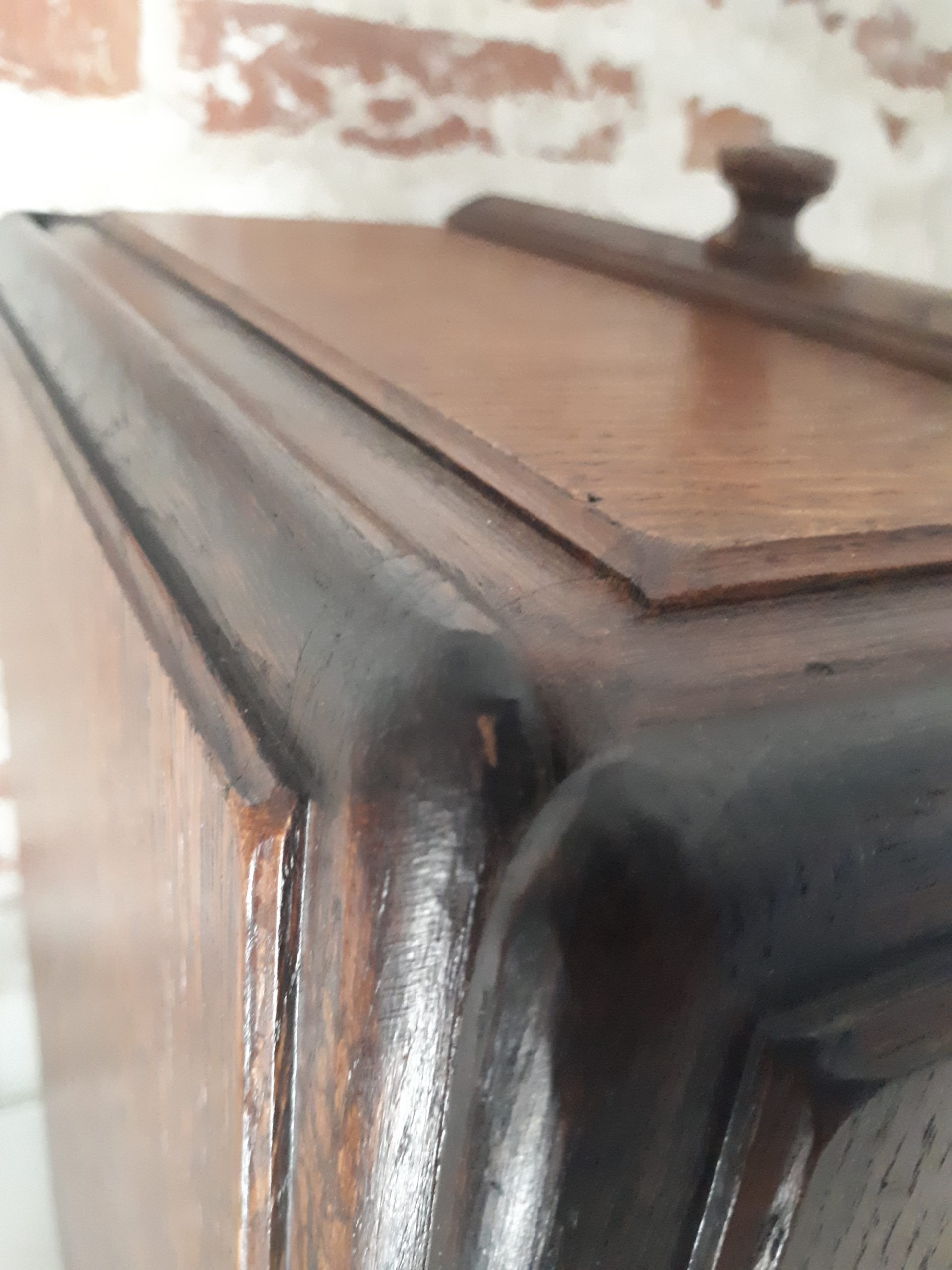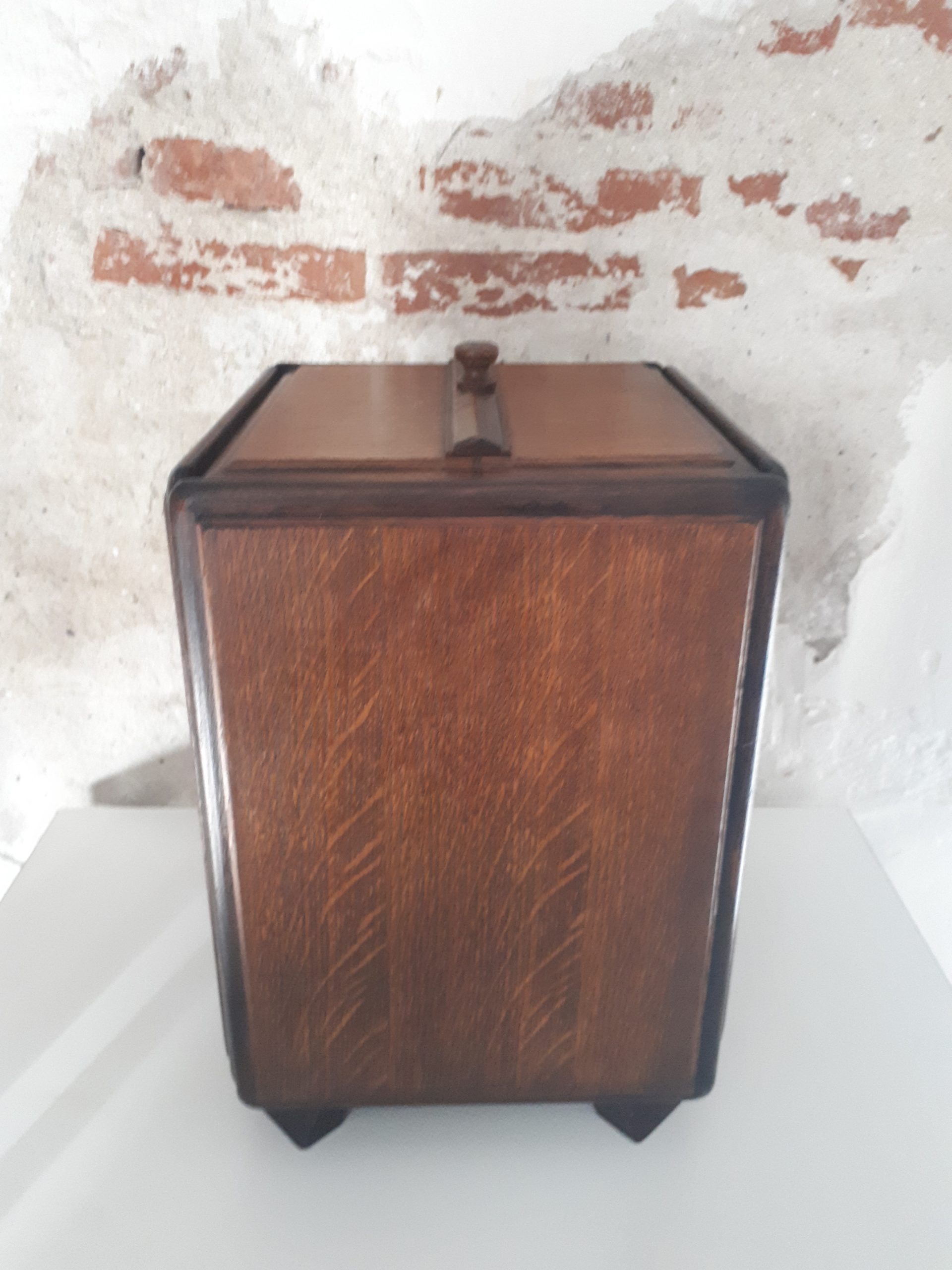 Beautiful paper bin, oak with a deep patina, a lid and other nice details Amsterdamse School, beginning 20th century, very well crafted, in good condition, h. 40, w/d 29×29.