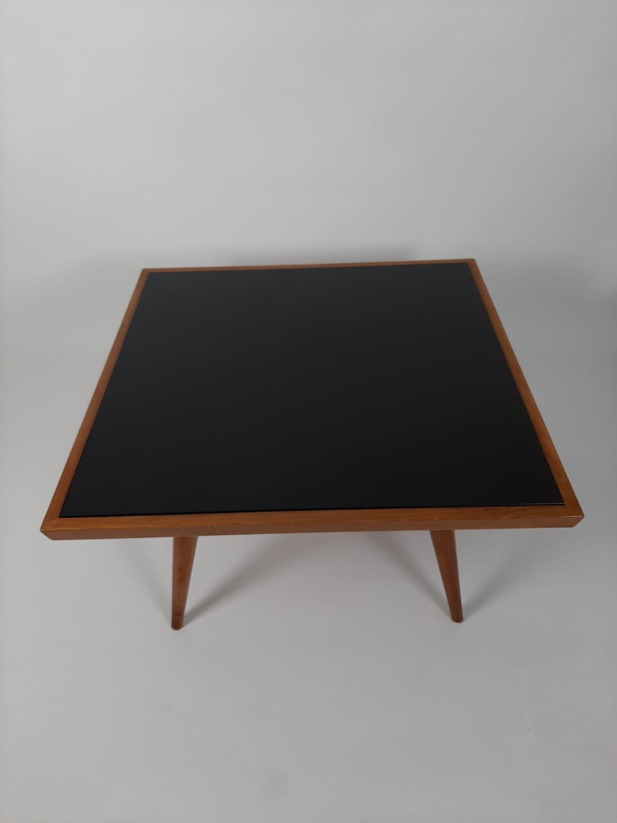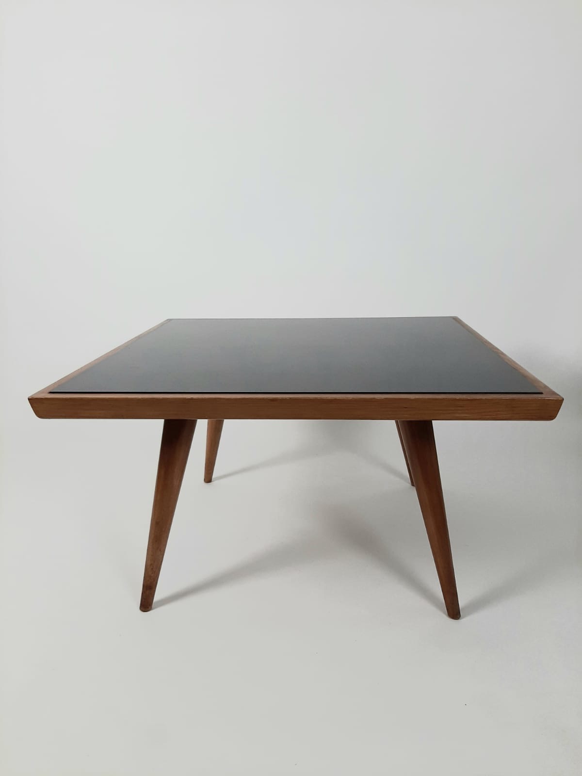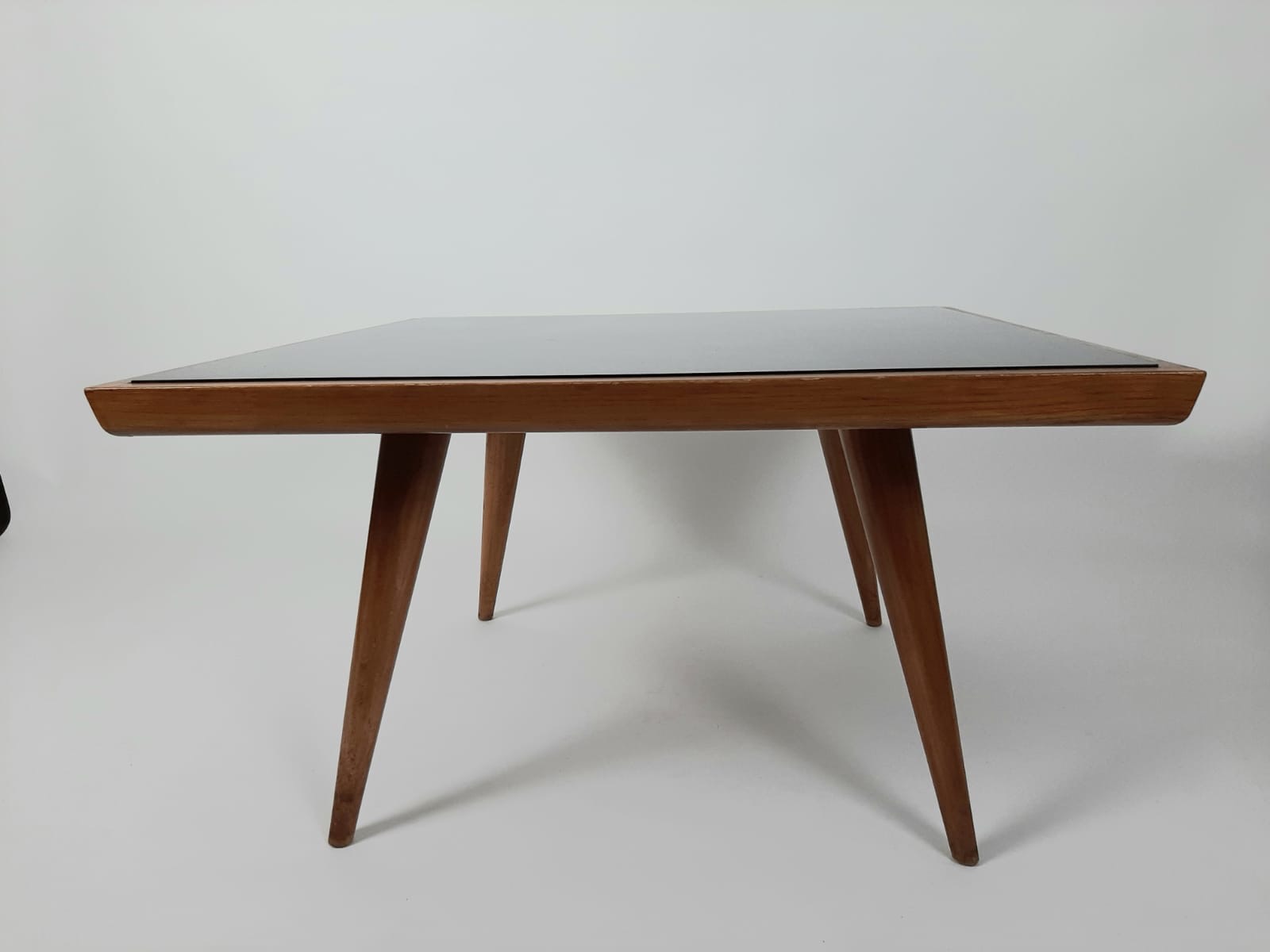In goede staat, teakhout met een glazen plaat, gemerkt ’t Woonhuys, 90x90x50